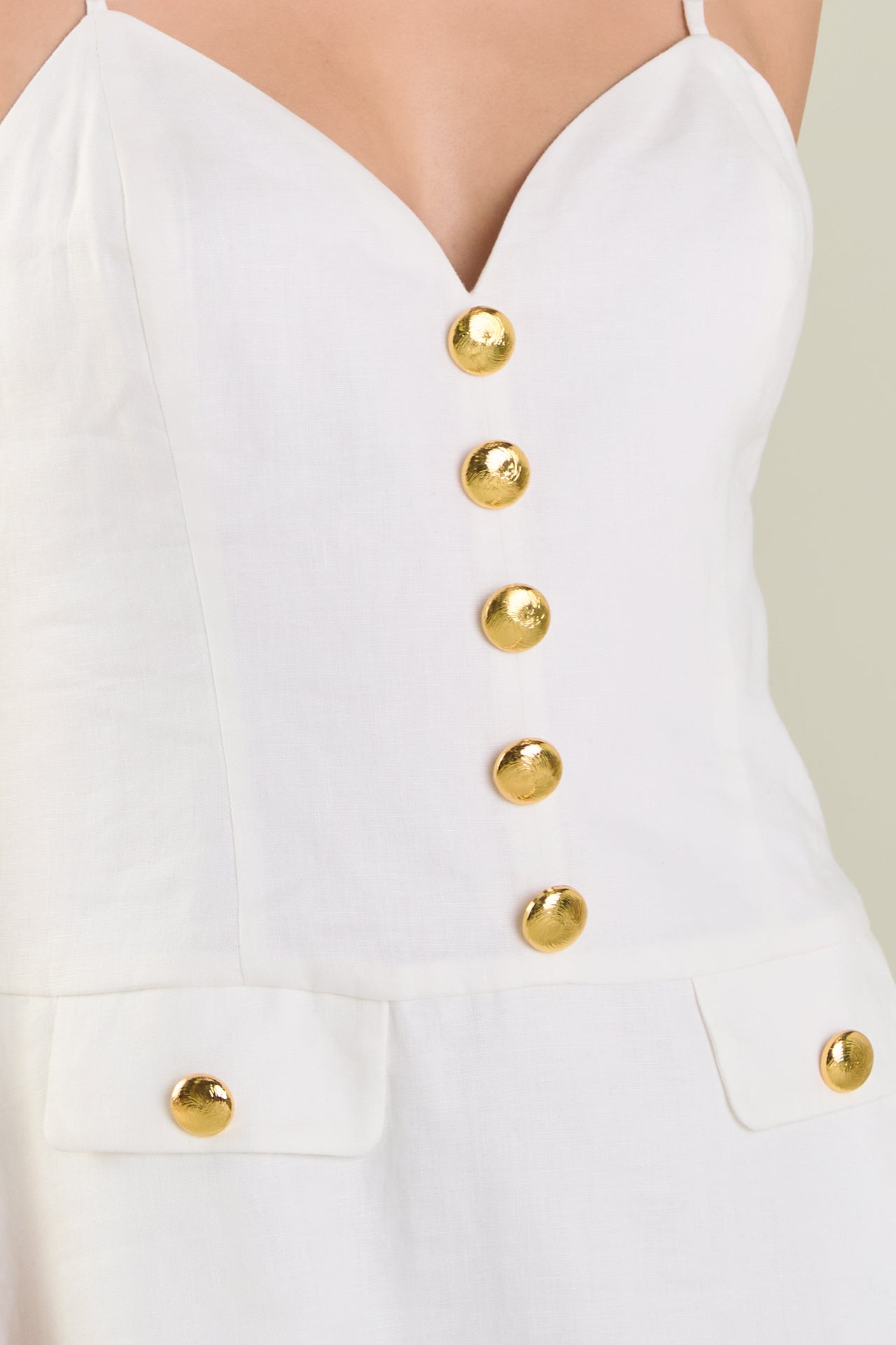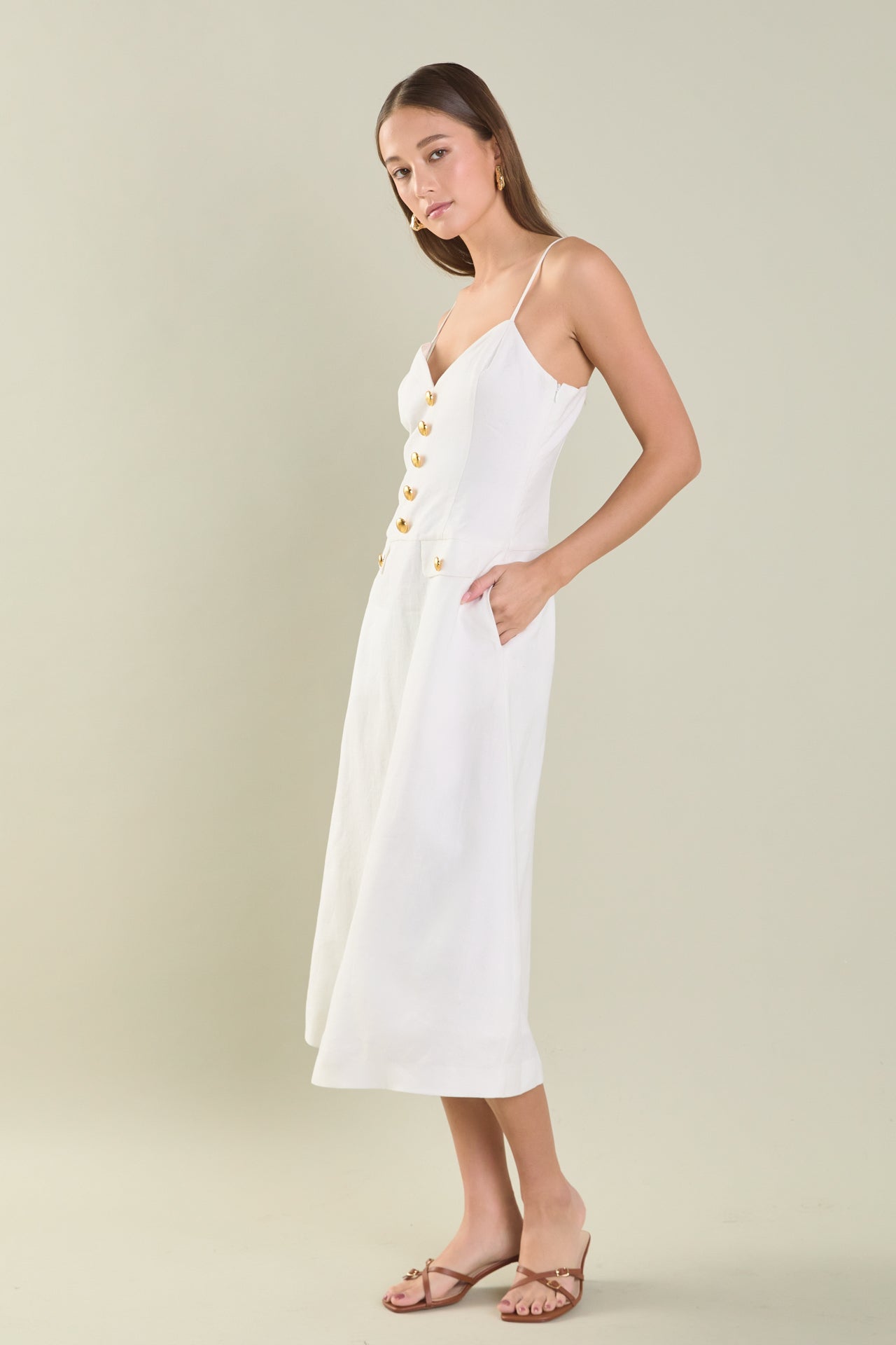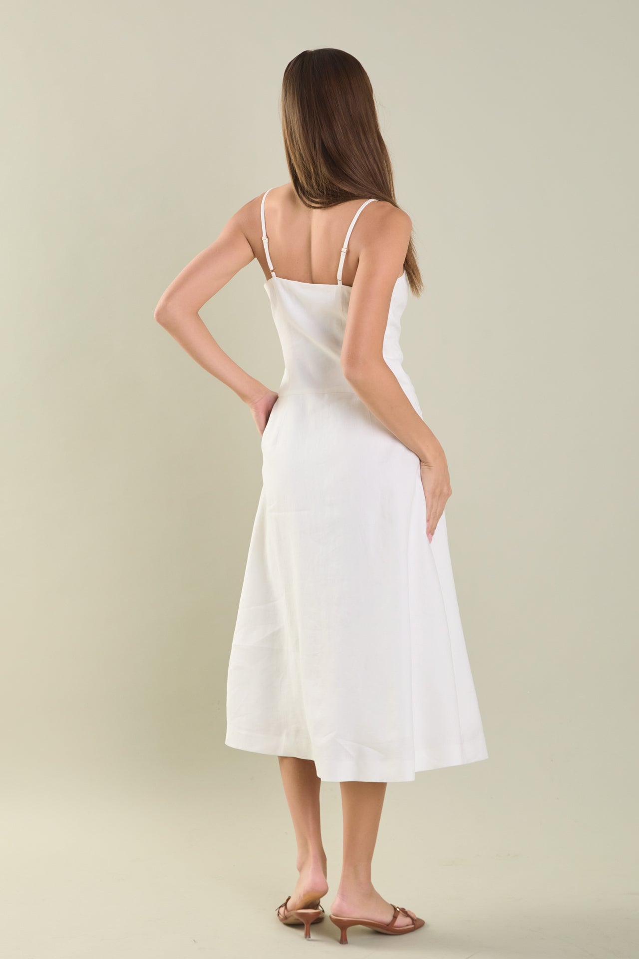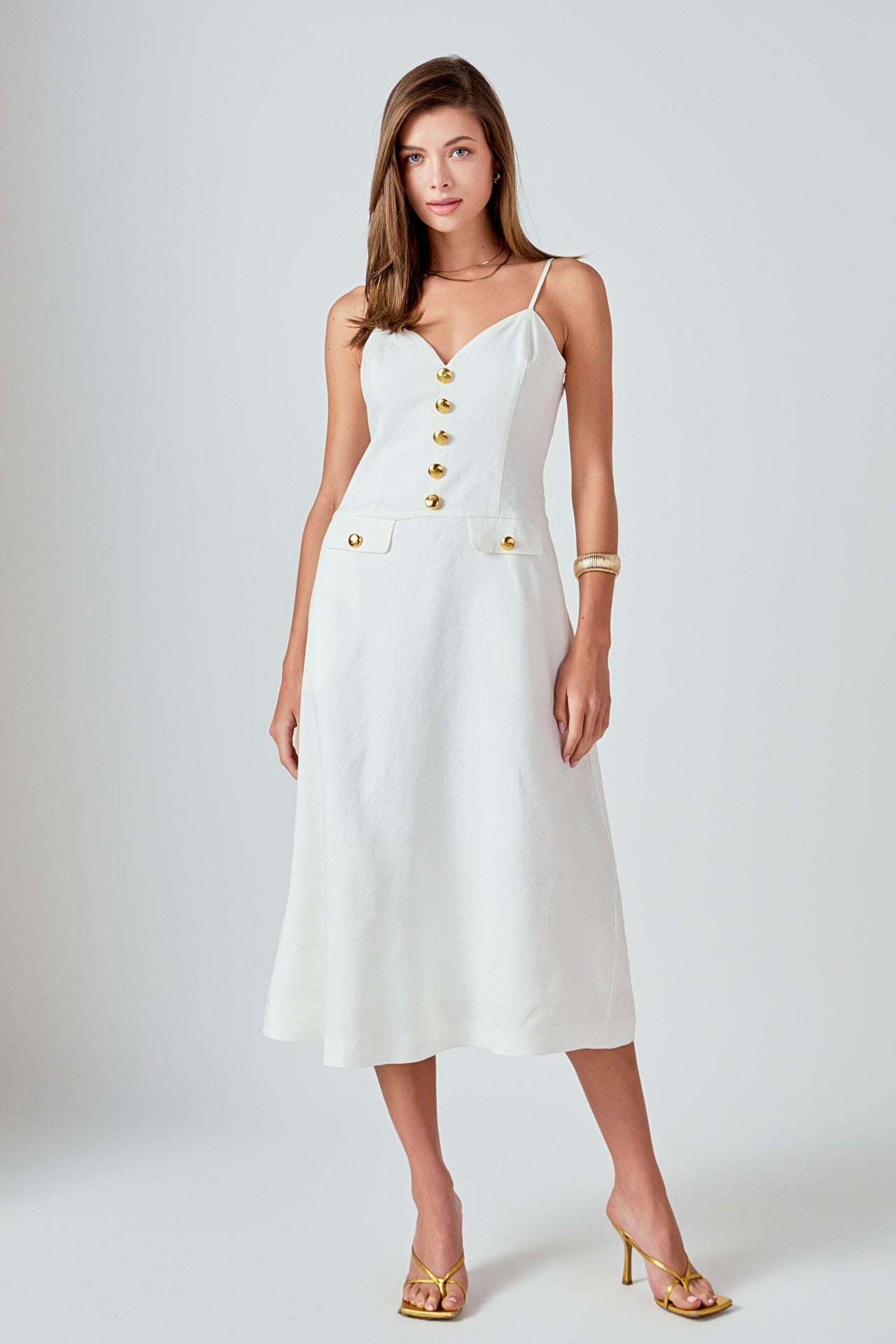 Introducing our Linen Buttoned Midi Dress, the perfect combination of comfort and style. Made from high-quality linen fabric, it is lightweight and breathable, perfect for sunny days. The front buttons add a touch of elegance and allow for easy wearing. The low neck drop adds a feminine touch, while the front pocket flaps add a functional element. This midi dress is a must-have for any fashion-forward wardrobe. Pair it with sandals for a casual day look or dress it up with heels for a night out. Get ready to turn heads and feel confident in our Linen Buttoned Midi Dress.