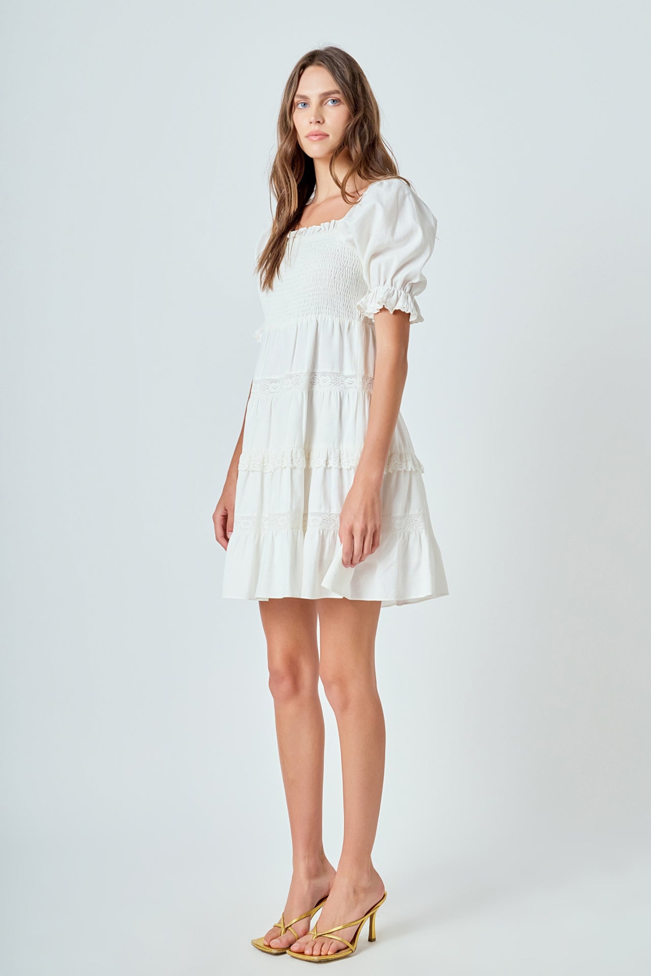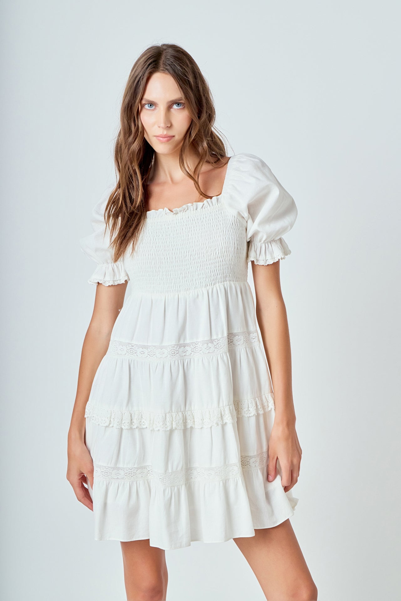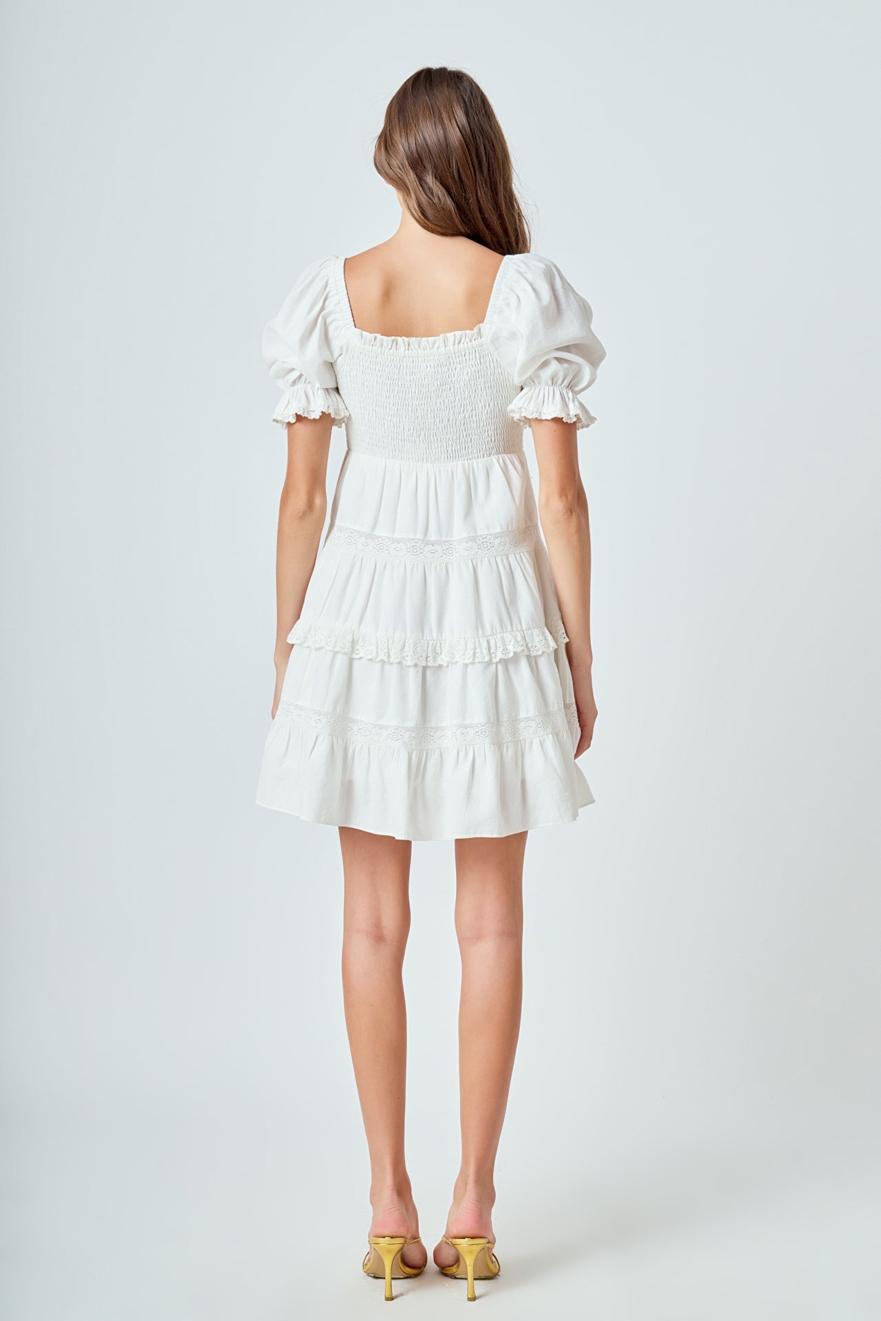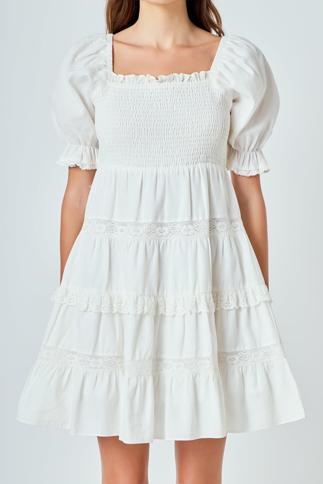 A linen mini dress that is both effortless and eye-catching. The perfect pick for a day out, whether you're running errands or meeting up with friends. The elastic neckline can be worn on or off the shoulder, while the smocked bodice and mini length make this dress both comfortable and flattering. The short puff sleeves and lace trim add a touch of femininity, while the fully lined bodice ensures a smooth fit.