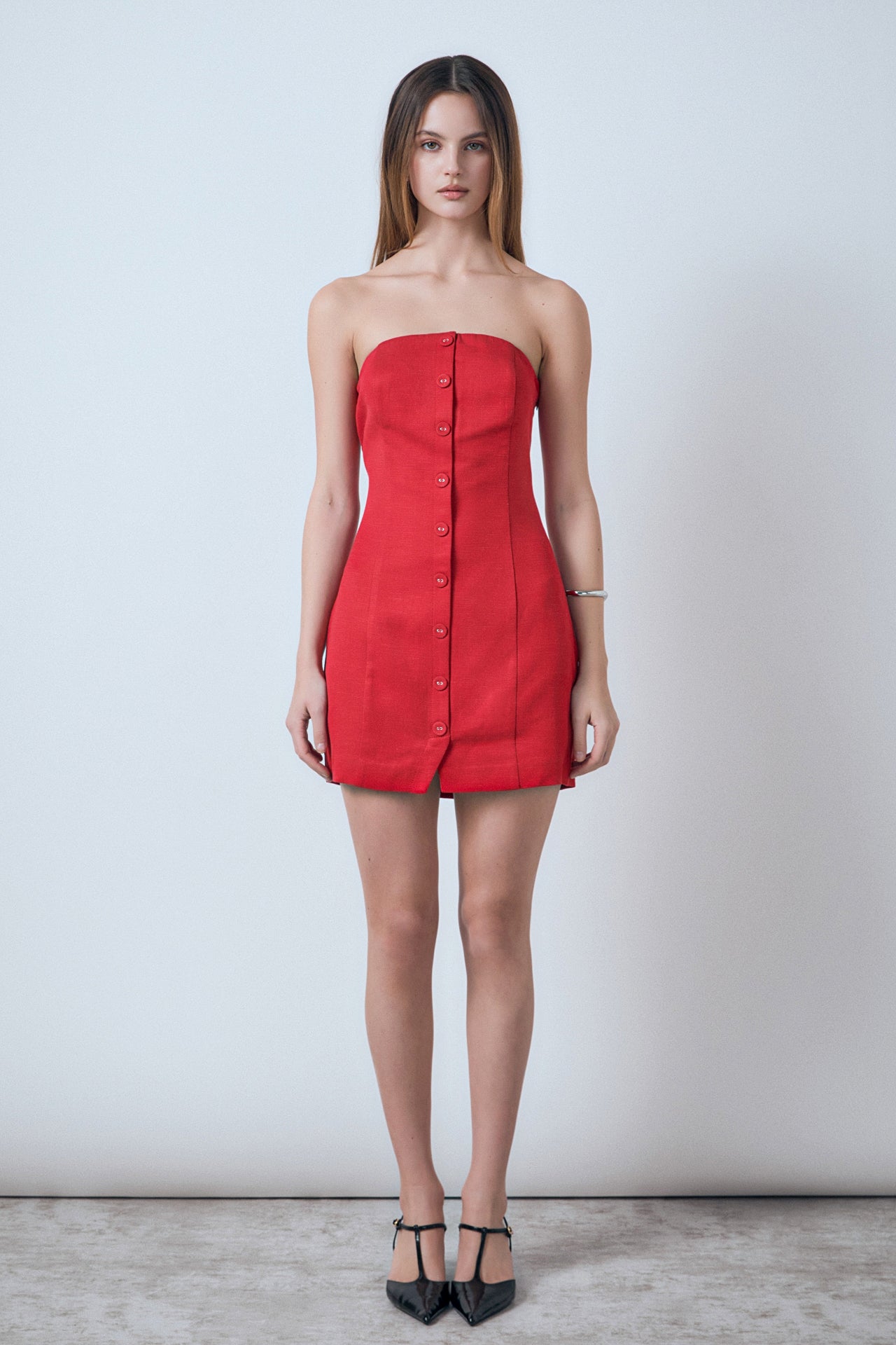 Upgrade your summer wardrobe with our Linen Strapless Dress. Made from lightweight and breathable linen this dress is perfect for warm weather. The strapless design shows off your shoulders while the mini length adds a touch of playfulness. With a row of buttons down the front this dress is versatile and chic. Whether you're heading to a picnic or a beach day this dress is a must-have. Say hello to effortless style and comfort with our Linen Strapless Dress. Don't miss out on this summer essential. Add it to your cart now!