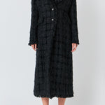 This luxurious tweed coat has lined pockets, jeweled buttons, and fringed edges. It's finished with a large lapel collar.