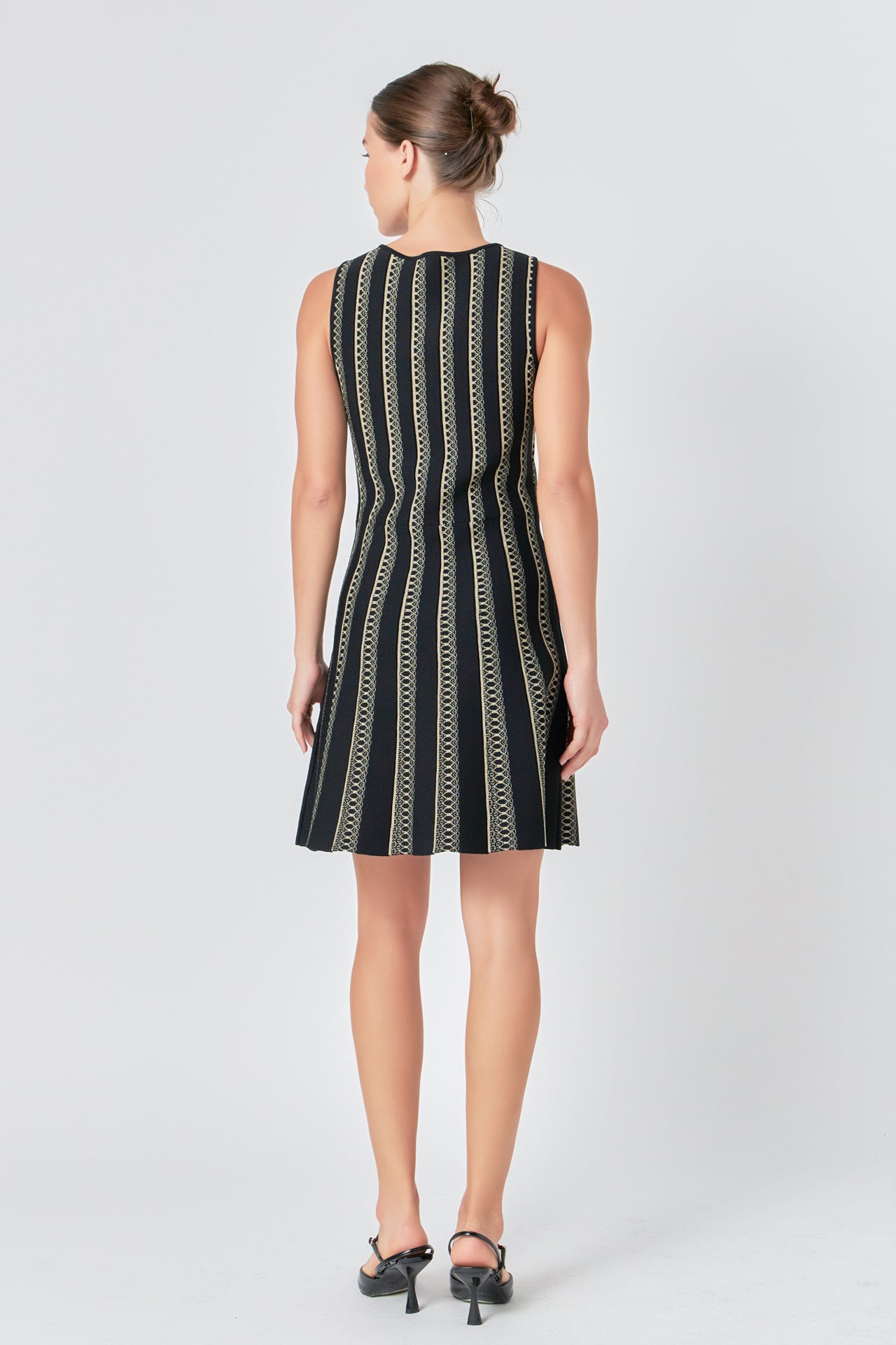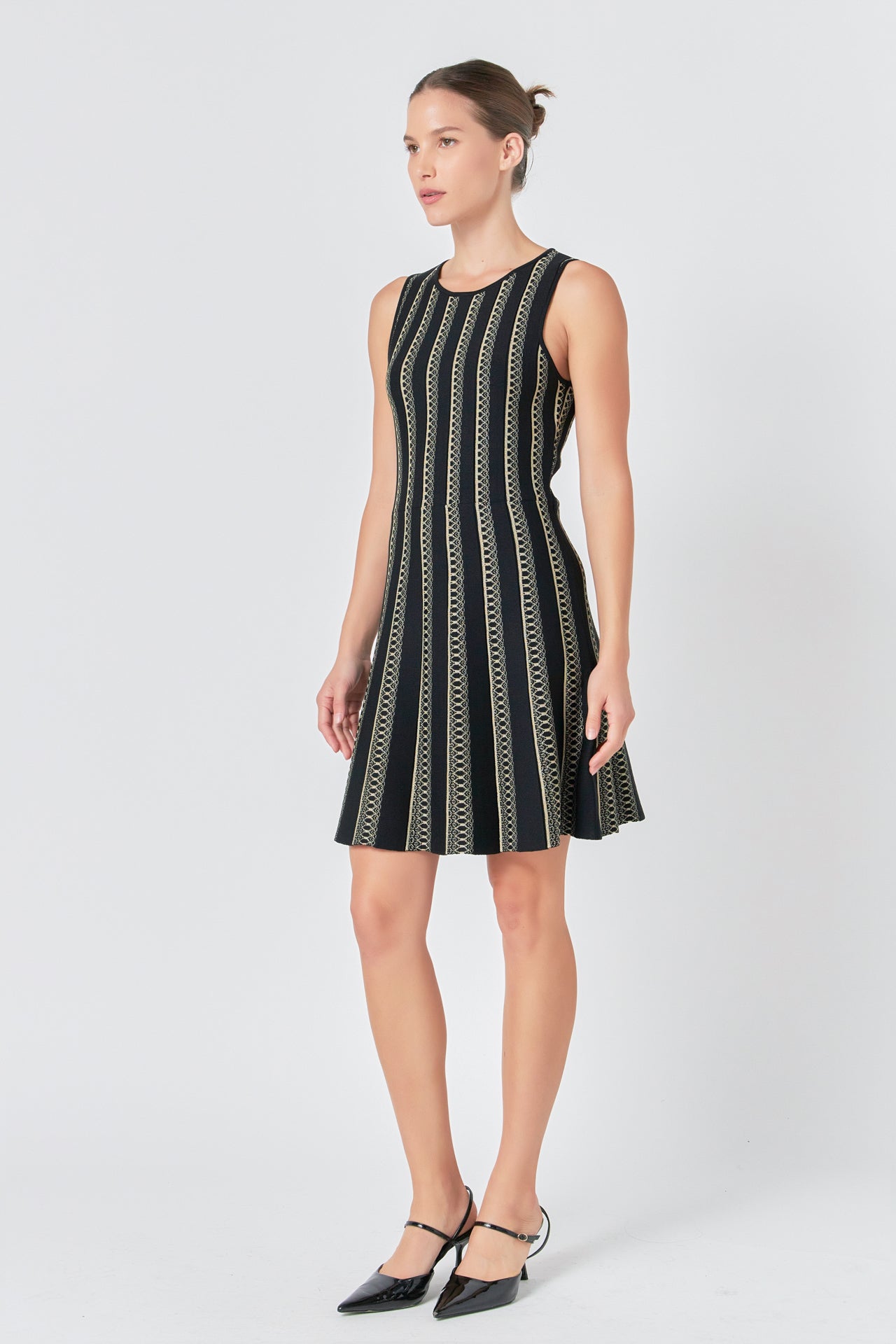 This Lurex Knit Mini Dress is a must-have for your wardrobe! With a round neckline sleeveless design fitted bodice and flare skirt this dress is the perfect combination of style and comfort. With its eye-catching glitter and shine it will surely turn heads in any occasion. Featuring excellent quality fabric it is sure to stand out from the crowd and make you look beautiful. Buy this amazing dress today and get ready to rock the next party!
