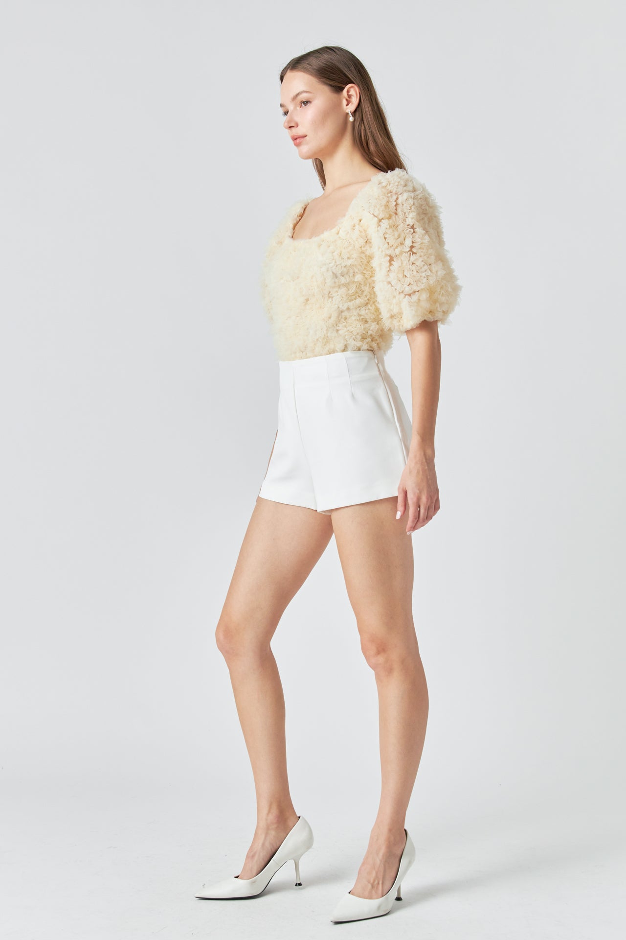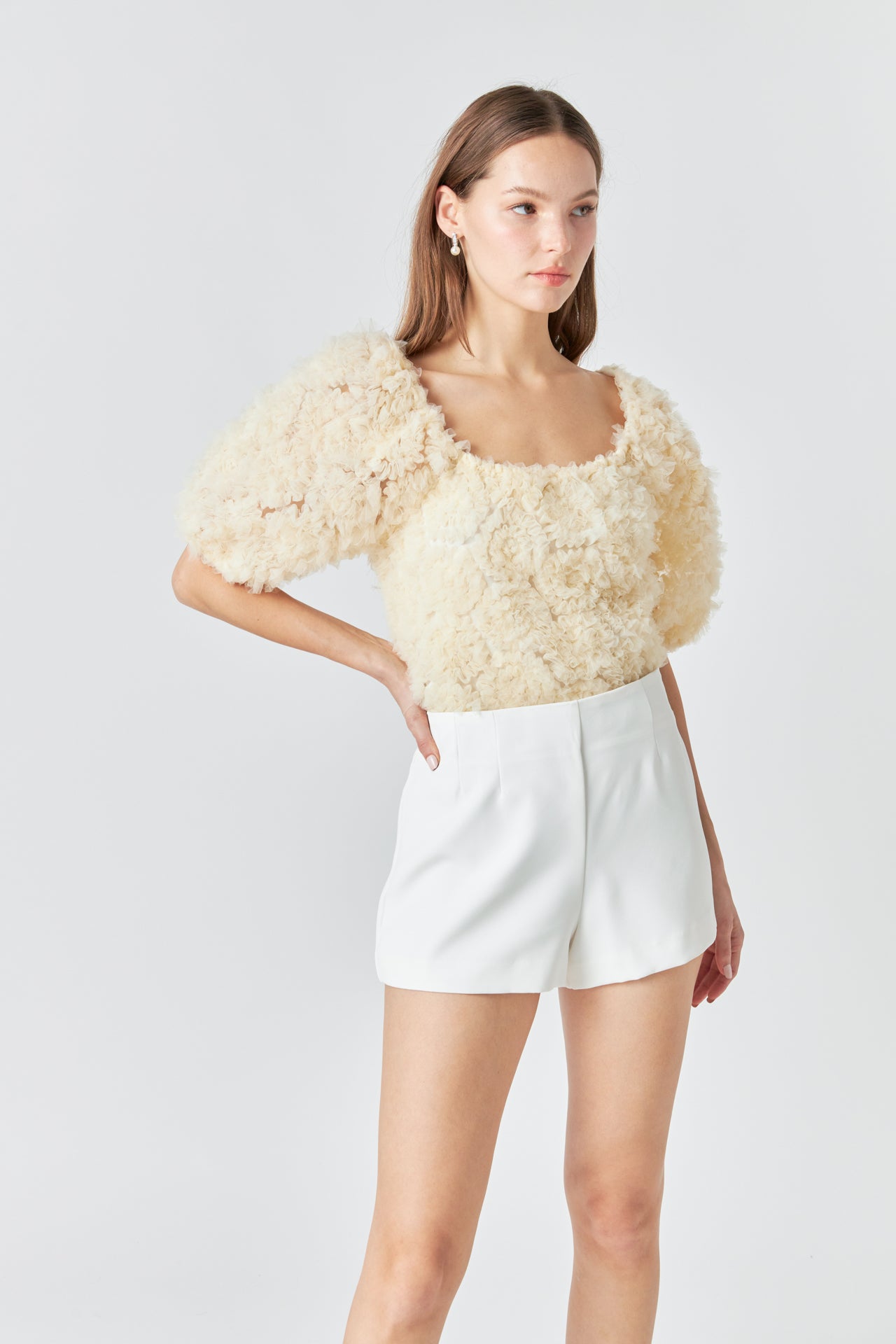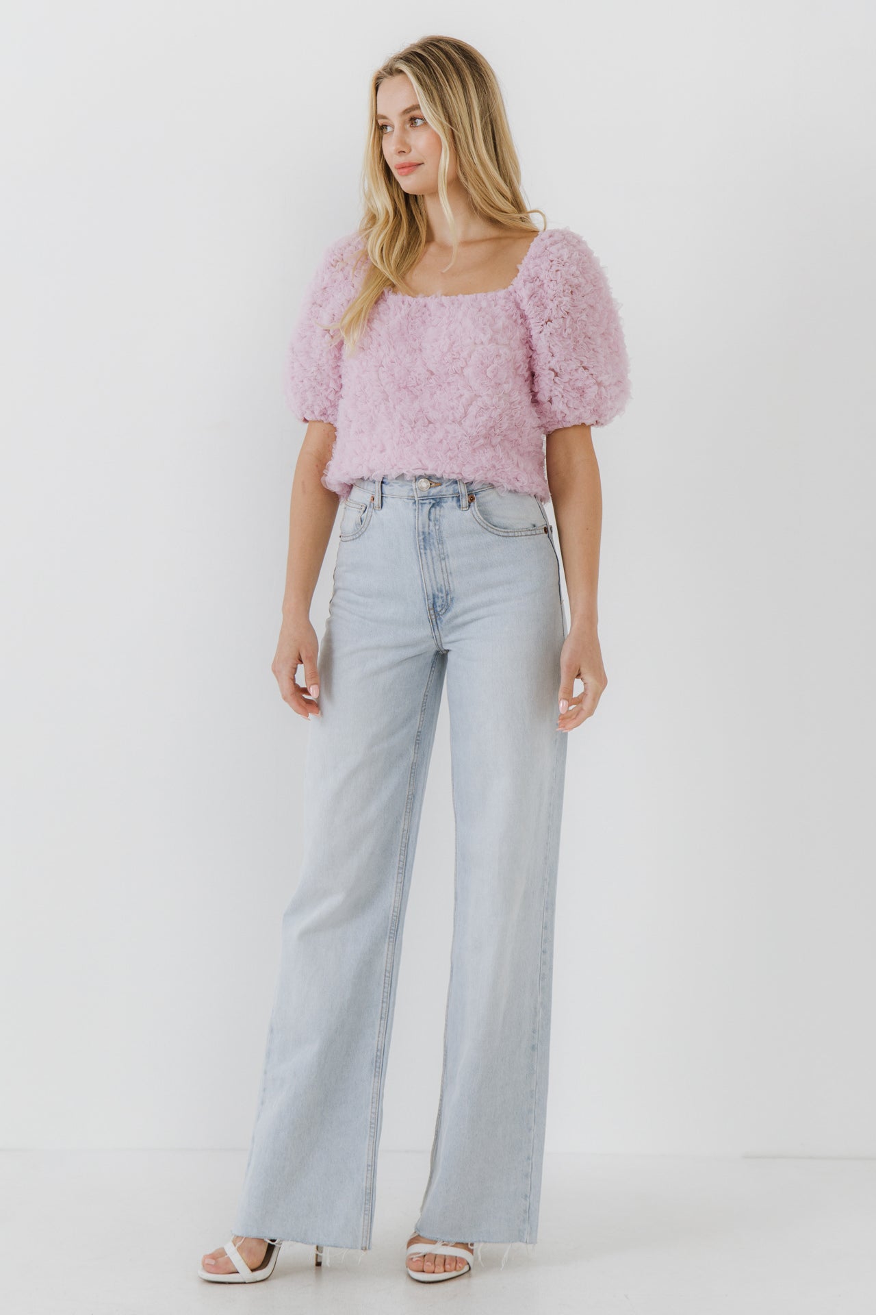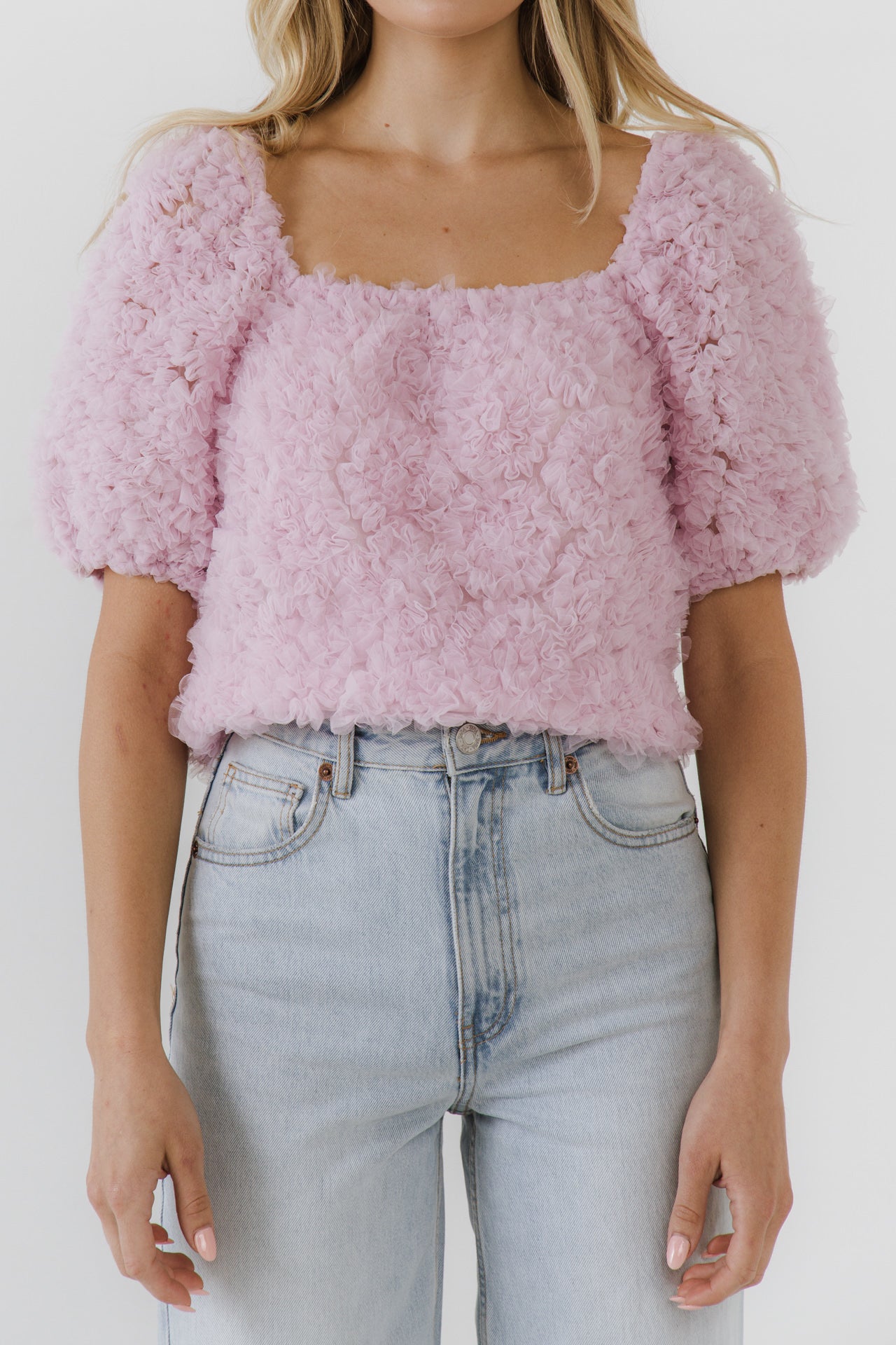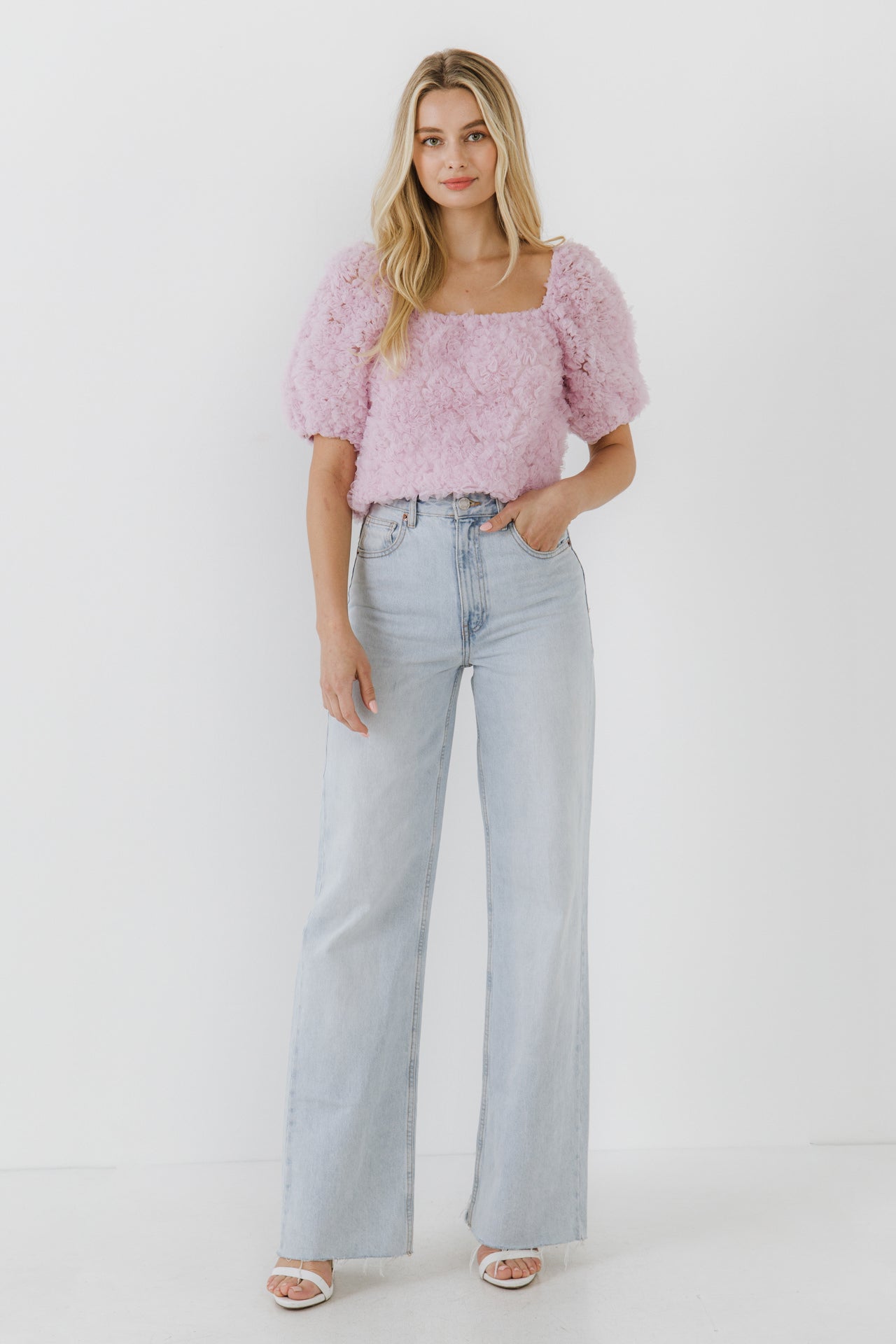 This Mesh Fabric Floral Shape Top is perfect for any professional woman. The lilac hue is flattering and the floral fabric is beautiful. The puff sleeves and off the shoulder top give this top a stylish and unique look.
