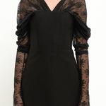 Chicness has arrived. This jaw-dropping mini dress features lace glove sleeves that make a sultry statement. Plus, you can choose to wear it in an on-shoulder or off-shoulder style. This mini dress has boning in the top, creating a flattering silhouette to show off your curves. Pair this gorgeous mini dress with tights and pumps for a party-ready look.