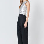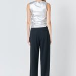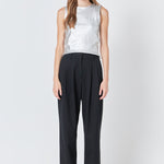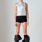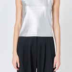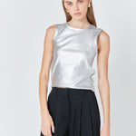 Add a touch of sparkle to your wardrobe with our Metallic Ribbed Sleeveless Top. This shimmering piece features a crew neck sleeveless design and a fitted bodice to accentuate your curves. Made from high-quality metallic material this top will have you dazzling all day and night. The perfect addition to any outfit whether dressed up or down. Embrace your inner fashionista with ease and style. Don't miss out on this must-have piece that will turn heads wherever you go.