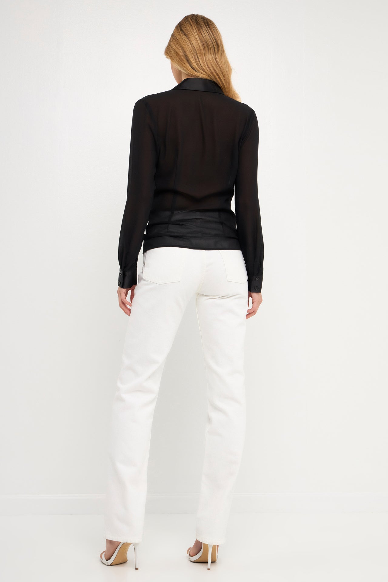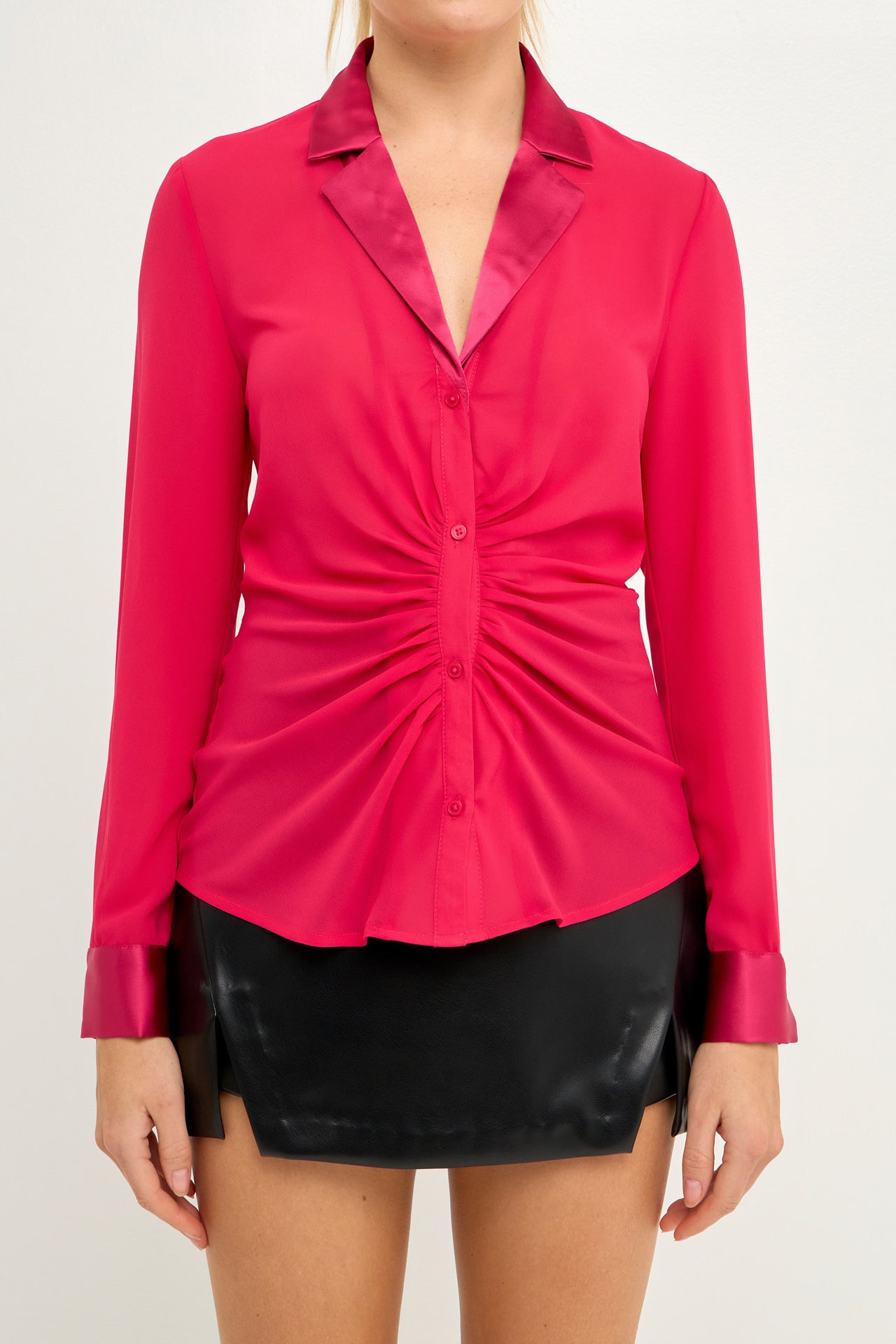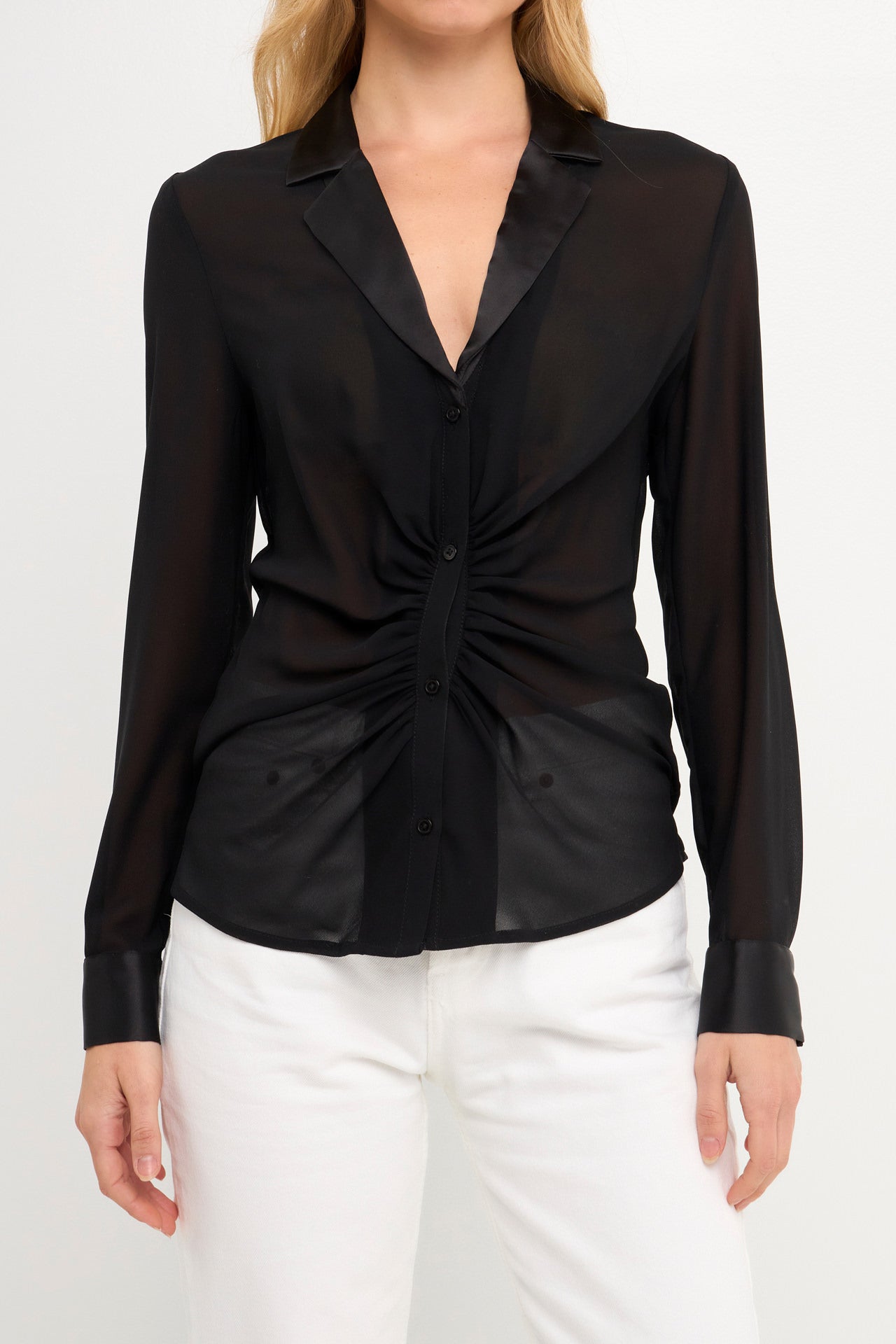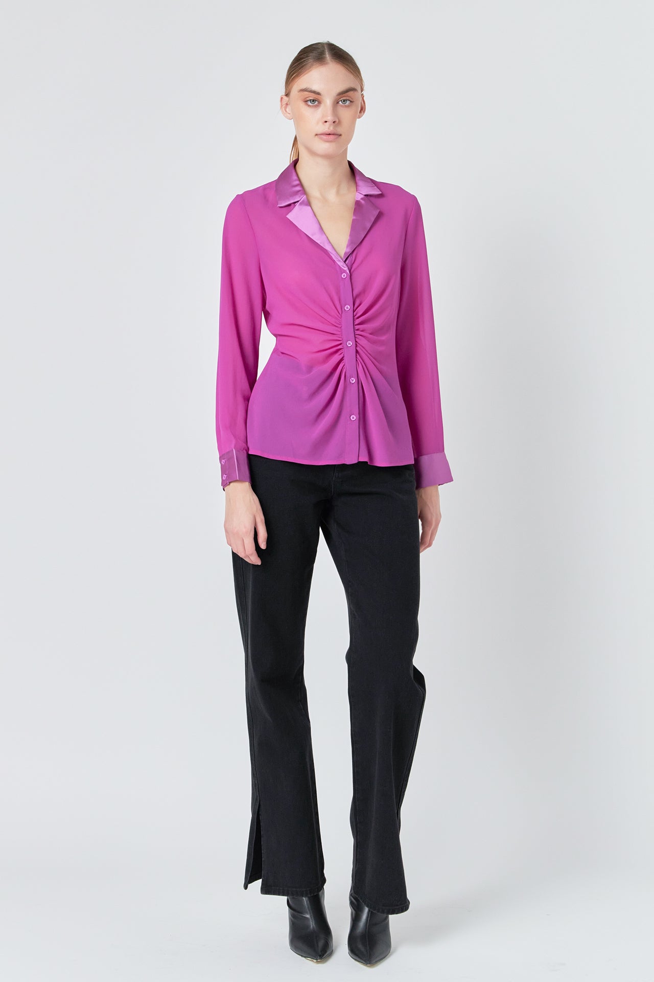 The mixed media chiffon blouse is a must have in every fashionista's wardrobe. This blouse is perfect for dressing up or dressing down. With a cinched waist detail, collar and lapel, and front buttons, this top can go from day to night in an instant. Pair it with your favorite jeans or trousers for a timeless look.