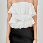 Elevate your style and turn heads with our Mixed Media Ruffled Strapless Top. Featuring a strapless design that flatters any figure, this top is made from a soft and breathable knit cotton fabric for ultimate comfort. The ruffle detailing adds a fun and feminine touch to this versatile piece, making it perfect for any occasion. Whether you're dressing it up or down, this top is a must-have in your wardrobe. Get the perfect blend of style and comfort with our Mixed Media Ruffled Strapless Top.