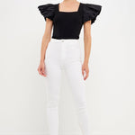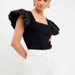 Give them something to talk about in this Mixed Media Square Neckline Knit Top. With a square neckline and ruffle sleeves, this top is perfect for a day out or a night on the town. The Mixed Media design pairs well with any bottom, making it a versatile piece for your wardrobe. Whether you dress it up or keep it casual, this top is sure to turn heads.