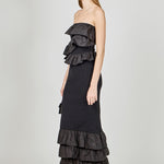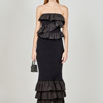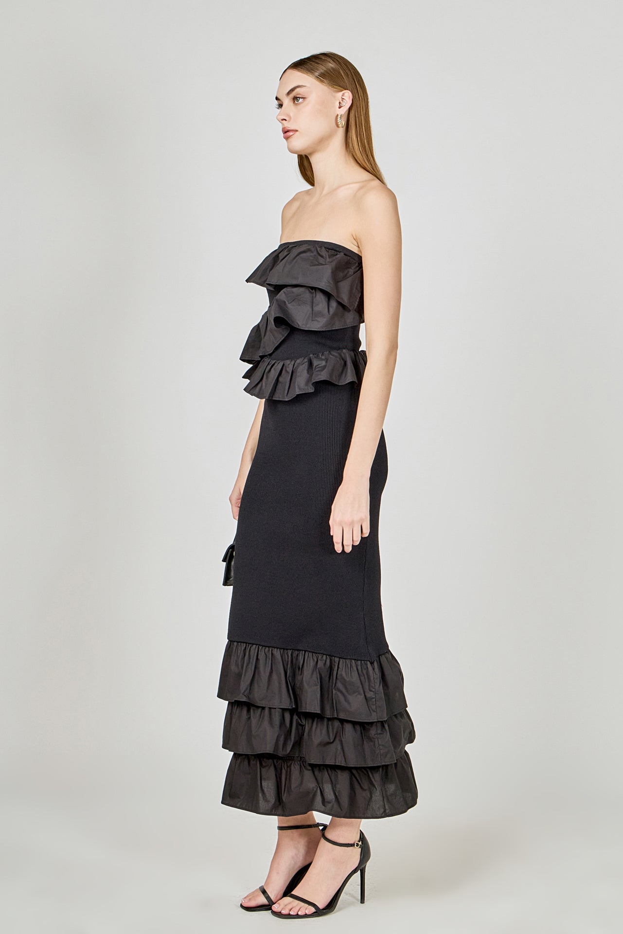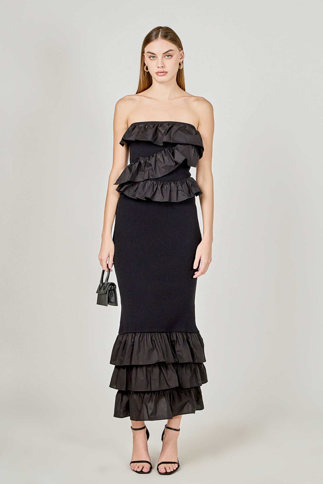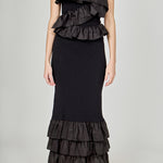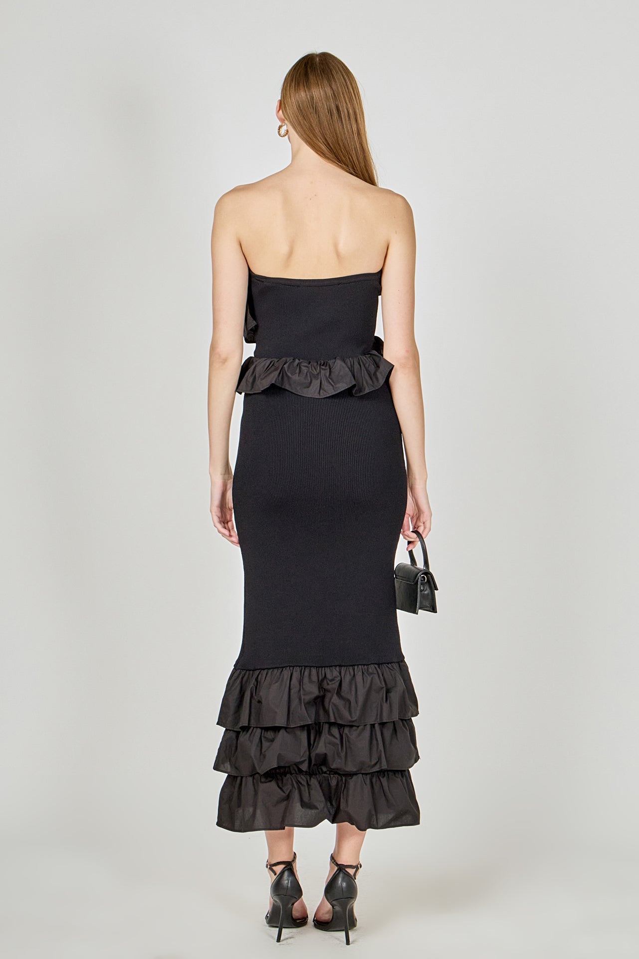 Make a style statement with our Mixed Media Strapless Fitted Maxi Dress. This stunning dress features a playful mix of textures, with a stretchy knit top and a flowy ruffle hemline for added movement. The strapless design offers a touch of elegance, while the fitted silhouette flatters your figure. Perfect for any special occasion or date night, this dress will have you looking and feeling your best. Whether you're searching for a unique dress or a versatile addition to your wardrobe, our Mixed Media Strapless Fitted Maxi Dress is sure to become your new go-to. Shop now and experience effortless style.
