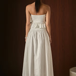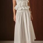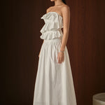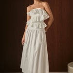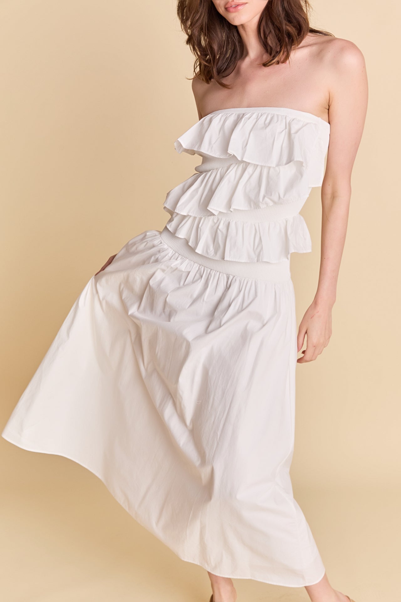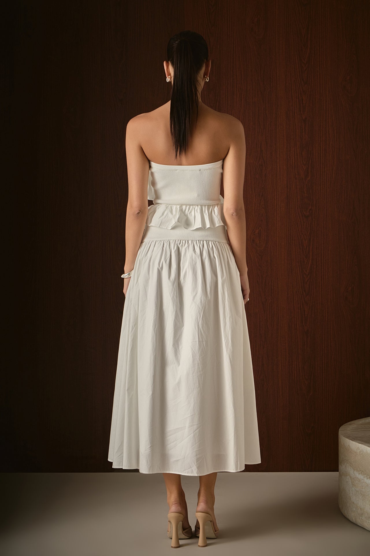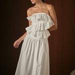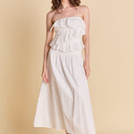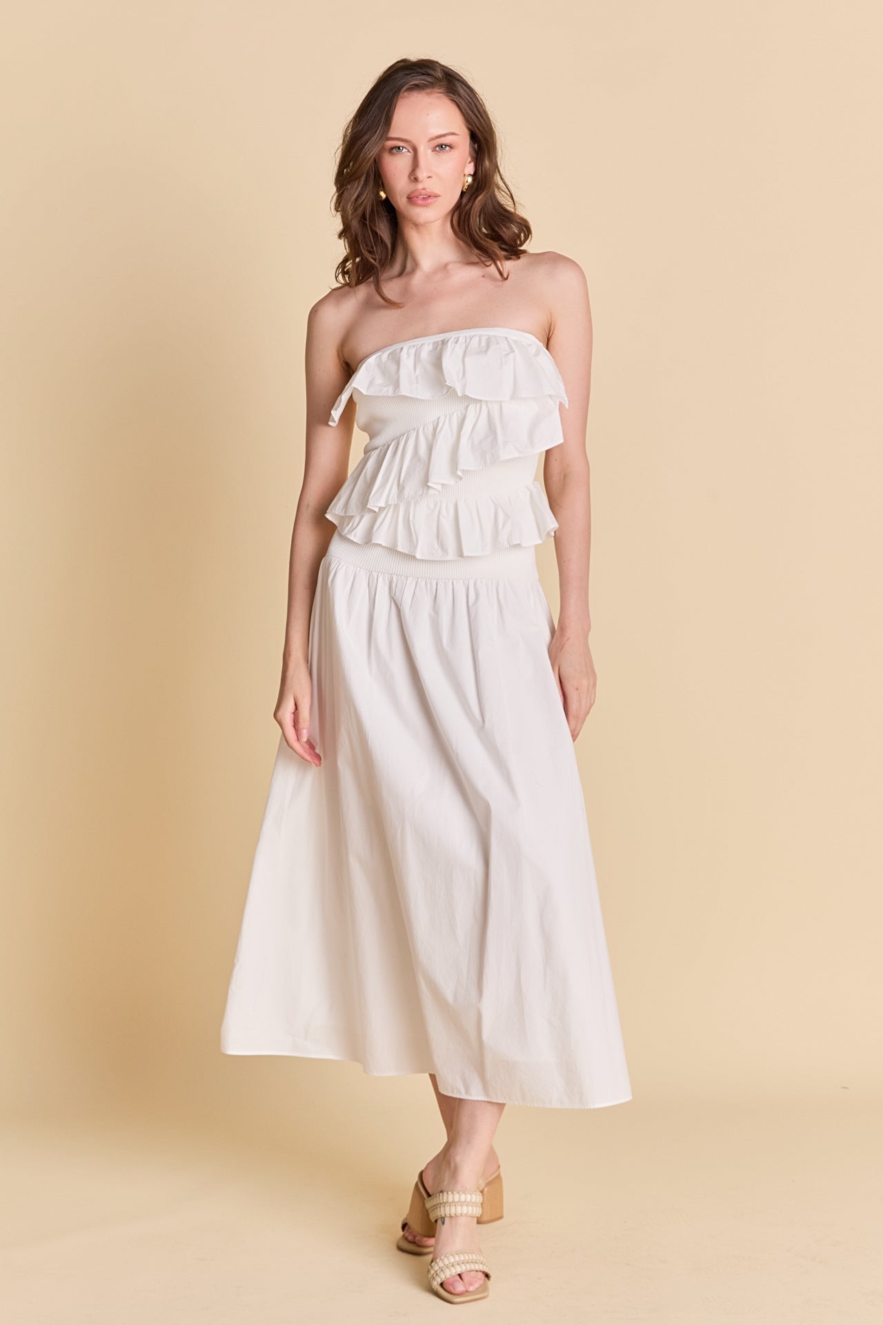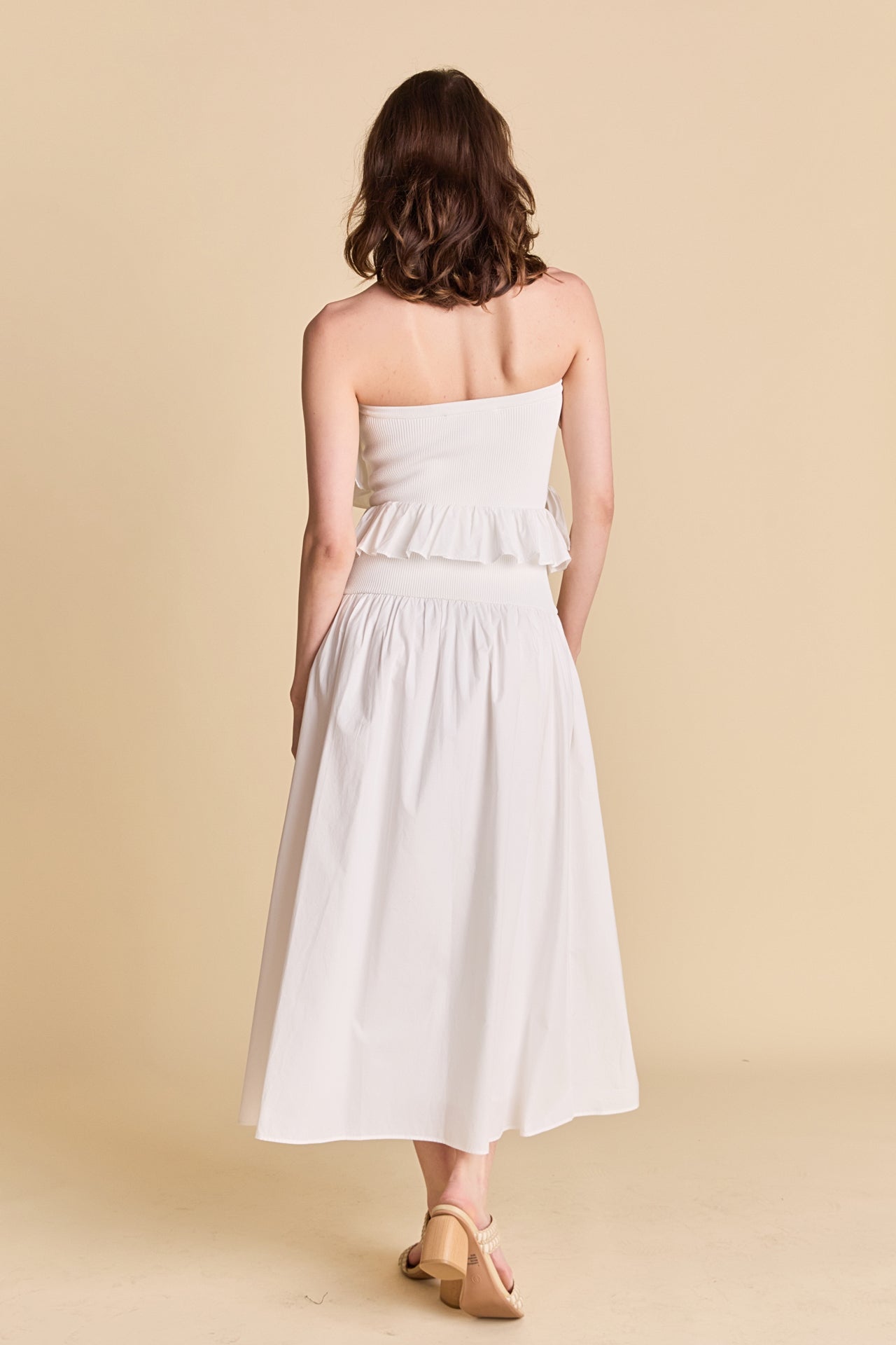 Elevate your style with our Mixed Media Strapless Maxi Dress. This knit dress features a flattering strapless design and playful ruffled details. The elastic waistband ensures a comfortable and secure fit. Perfect for any occasion, this dress is a must-have for your wardrobe. Whether you're hitting the beach or going out on the town, this dress will have all eyes on you. Add this versatile piece to your closet and effortlessly stand out. Shop now and experience the perfect blend of comfort and style.