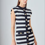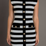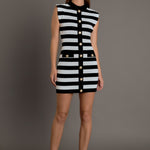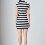 Step into style with our high neck striped mini dress. This dress is designed with a trendy mock neck and eye-catching stripes that are sure to make a statement. The sleeveless cut is perfect for warm temperatures and the added shoulder pads create a chic, structured silhouette. Made with high quality materials, this dress is comfortable and versatile, making it perfect for any occasion. Update your wardrobe with this must-have mini dress that combines fashion and function. Perfect for those who want to stand out from the crowd. Get yours now while supplies last!