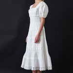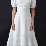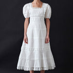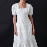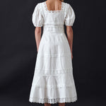 A dress for any occasion, this maxi dress features intricate lace trim and a flared tiered skirt for a touch of femininity. The short puff sleeves and side zipper make this dress easy to wear, while the lining ensures a comfortable fit. Whether you're dressing up for a special occasion or looking for a casual dress to wear on a sunny day, this maxi dress is sure to become a staple in your wardrobe.