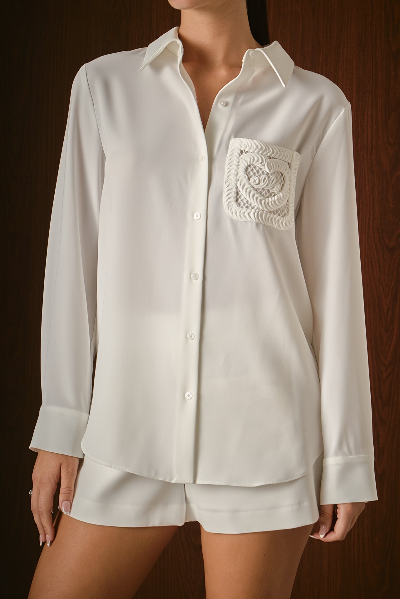 Stay chic with our Net Pocket Button Up Shirt, the perfect addition to your blouse and shirt collection. This long-sleeved blouse features a unique mesh pocket that adds a modern touch to your look. With its classic button-down style, this blouse is versatile and a must-have for your wardrobe.