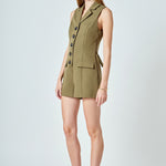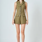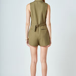 Effortless style meets warm-weather ease in our Notch Collared Sleeveless Romper. Crafted from lightweight, breathable fabric, it’s designed with a refined notch collar and a sleek sleeveless cut for a modern, flattering silhouette. The belted waist cinches for shape and adds a feminine finish, while side pockets bring a touch of practicality. Perfect for daytime outings or summer evenings, this versatile romper is your go-to for chic, no-fuss dressing.