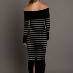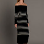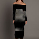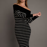 Make a stylish statement with our Off Shoulder Fold Striped Maxi Dress. This must-have dress features a knit and ribbed design, creating a flattering fit that accentuates your curves. The off shoulder neckline adds flair and the striped pattern adds a touch of sophistication. Perfect for any occasion, from a day out to a special event, this dress will have you turning heads. Stand out in comfort and style with our Off Shoulder Fold Striped Maxi Dress. Shop now and embrace your inner fashionista!