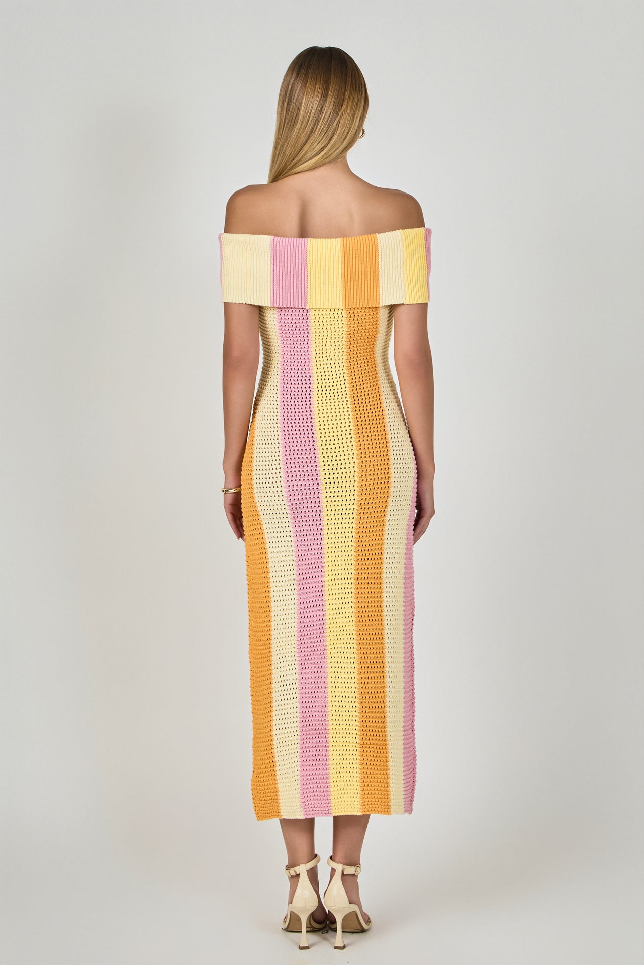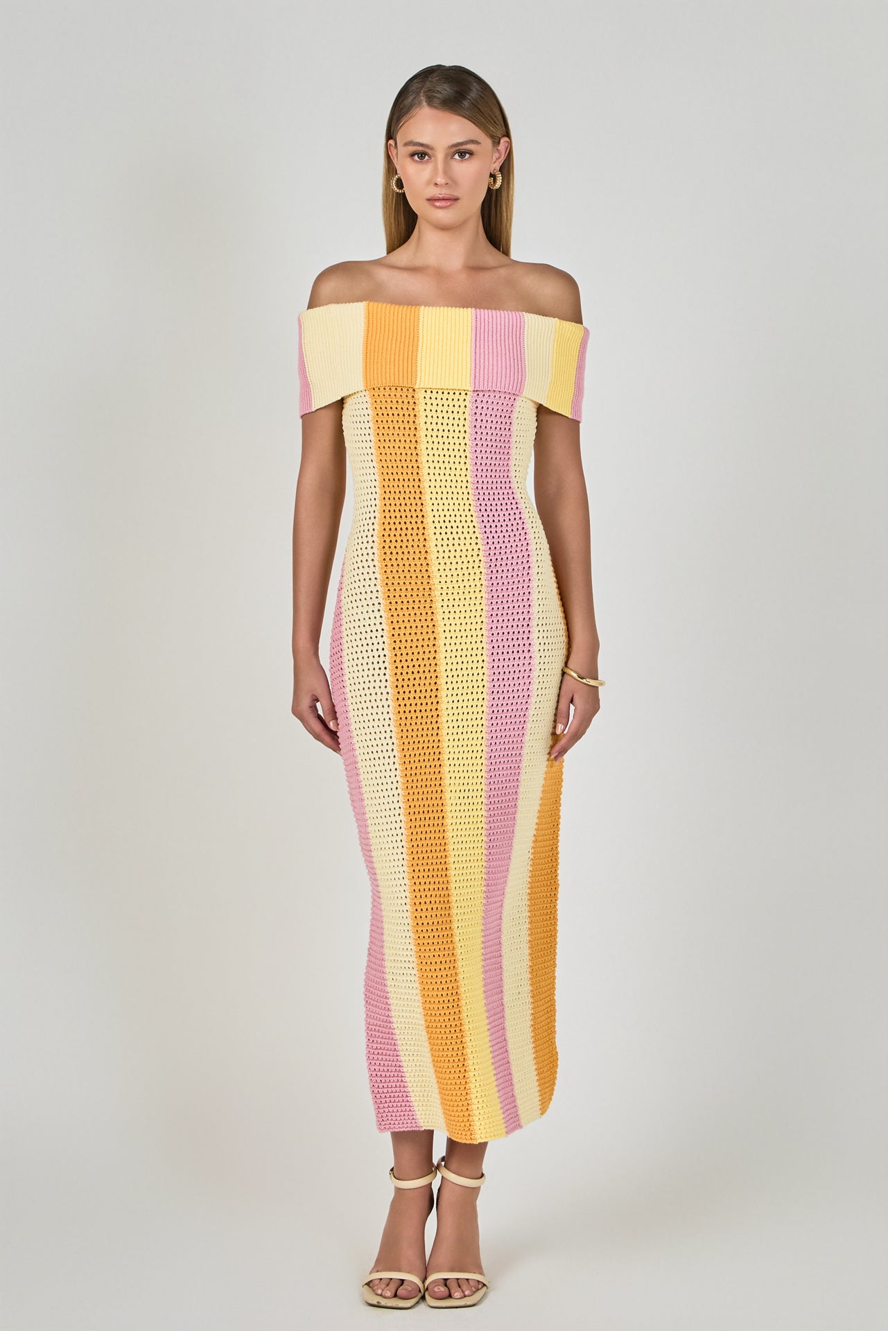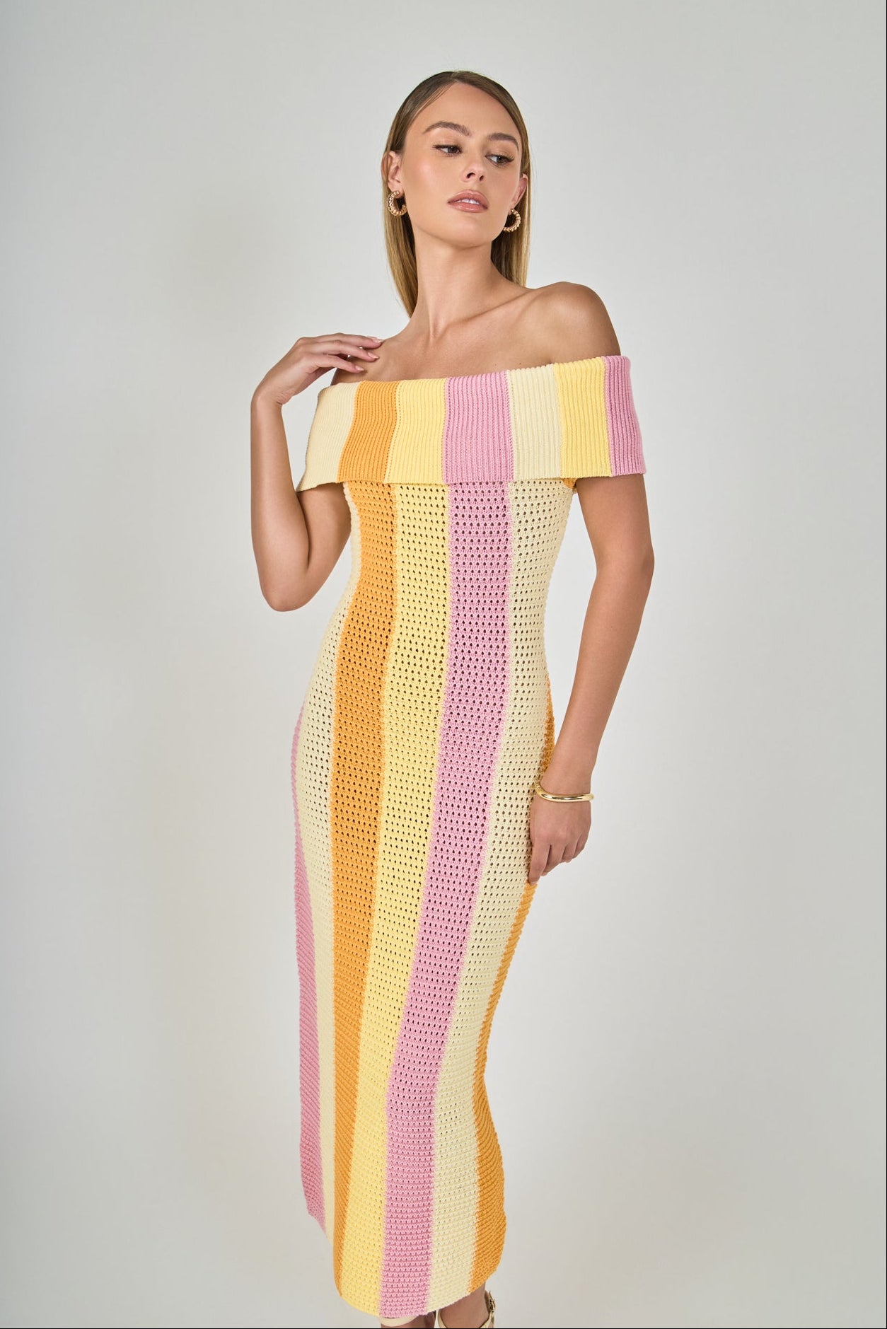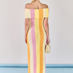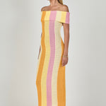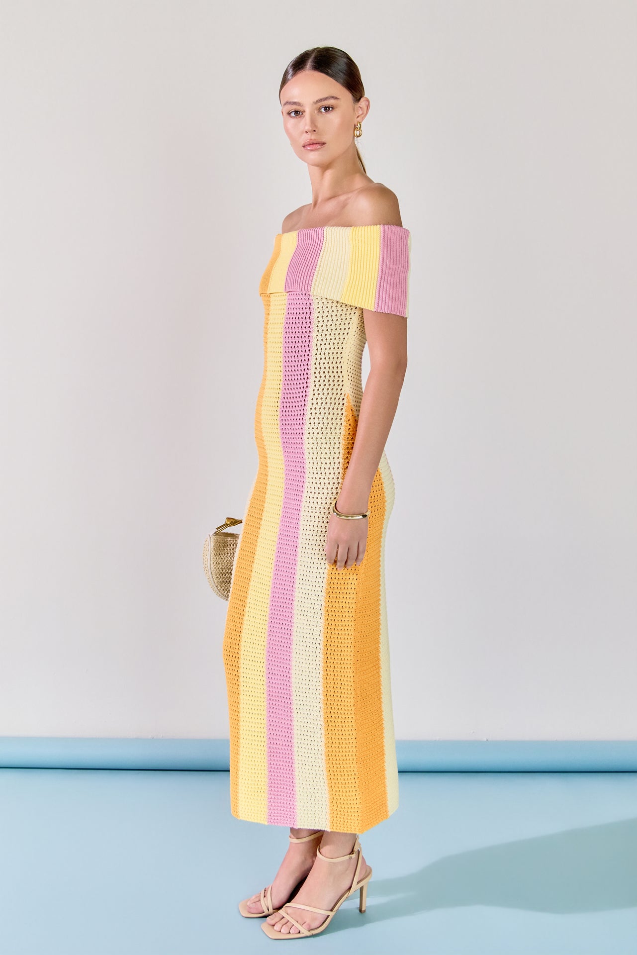 Introducing our stunning Off Shoulder Sleeveless Midi Dress, perfect for date nights, brunches, and beyond. The vertical stripe design adds an elongating effect while the knit fabric provides comfort and a flattering fit. The midi length exudes sophistication while the off shoulder style adds a touch of romance. This versatile dress is a must-have in every fashionista's wardrobe. Embrace effortless style and turn heads wherever you go. Don't miss out on this must-have dress. Get yours today and slay every occasion.