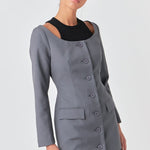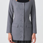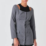 Need a blazer upgrade in your wardrobe? Pull off power-dressing with a feminine twist in this off shoulder blazer. Embodying modern sophistication and tailored styling this piece features long sleeves and a button down front closure for a look that's ready for business. Perfect for the woman that knows how to own the boardroom.