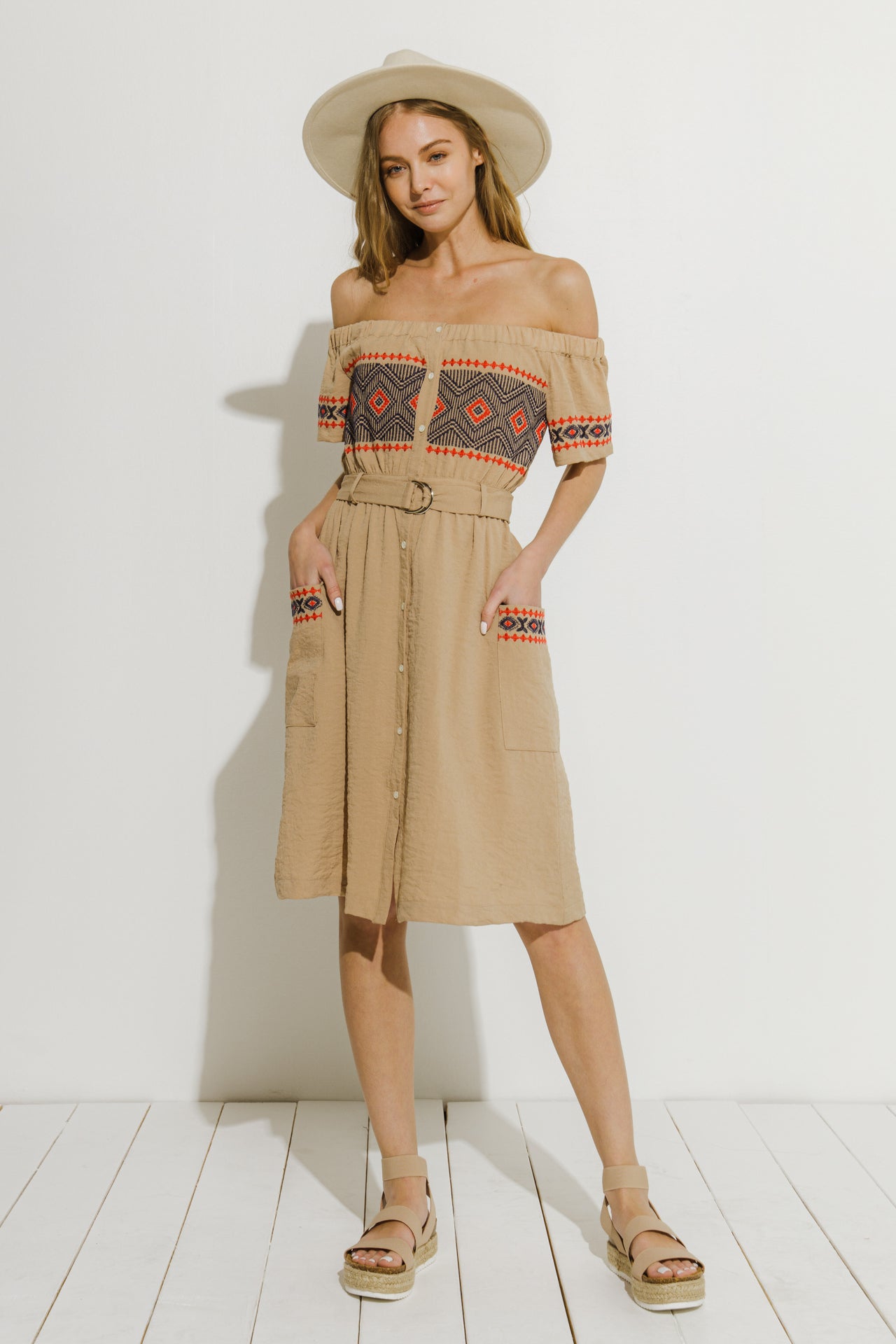 This eye-catching Off the Shoulder Embroidered Dress offers a captivating look for any occasion. This elegant dress features an attractive embroidered bodice, two pockets, a fashionable placket, and a flattering self-tie belt. Perfect for evening wear, or a night out on the town. With its stylish elements, this dress is sure to be a hit. Make a lasting impression and look your best with this timeless Off the Shoulder Embroidered dress. Keywords: Off Shoulder, Embroidered, Pockets, Placket, Belted, Evening Wear.