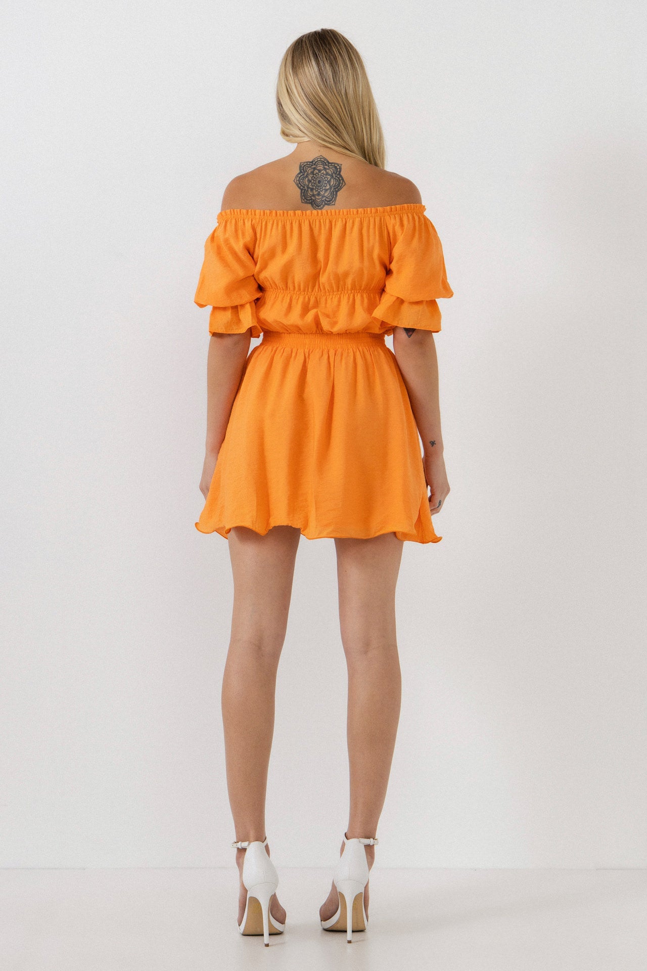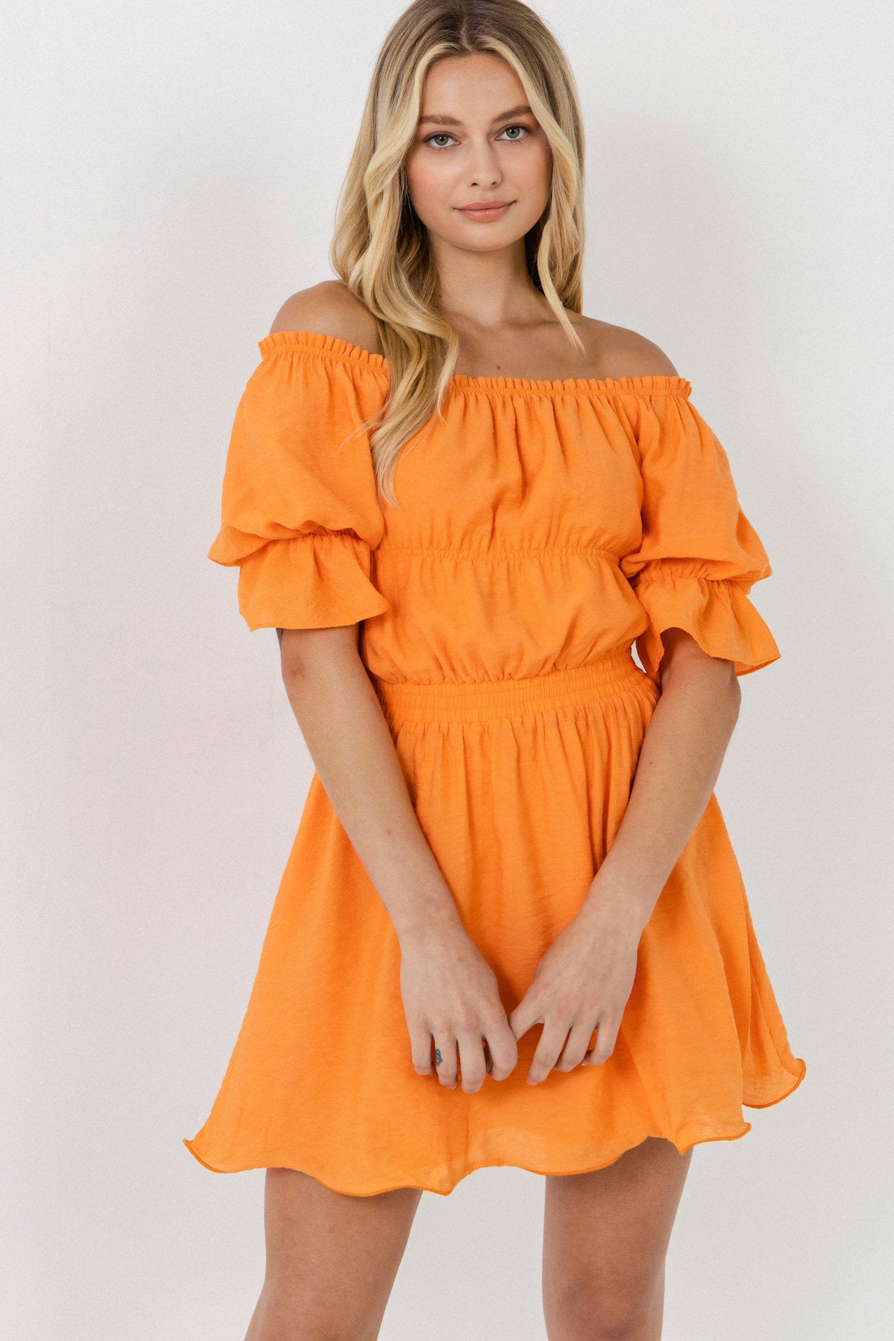 Off the shoulder and smocked detail? We're in love. The flounced mini dress is both playful and elegant. With a elastic waist band, this dress will give you a flattering fit. The half puff sleeves and slight sheer make this dress perfect for a special date or event.