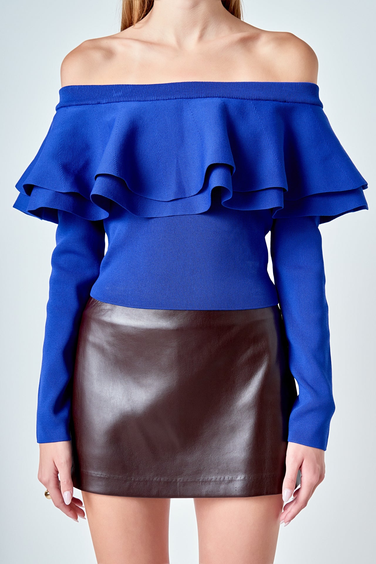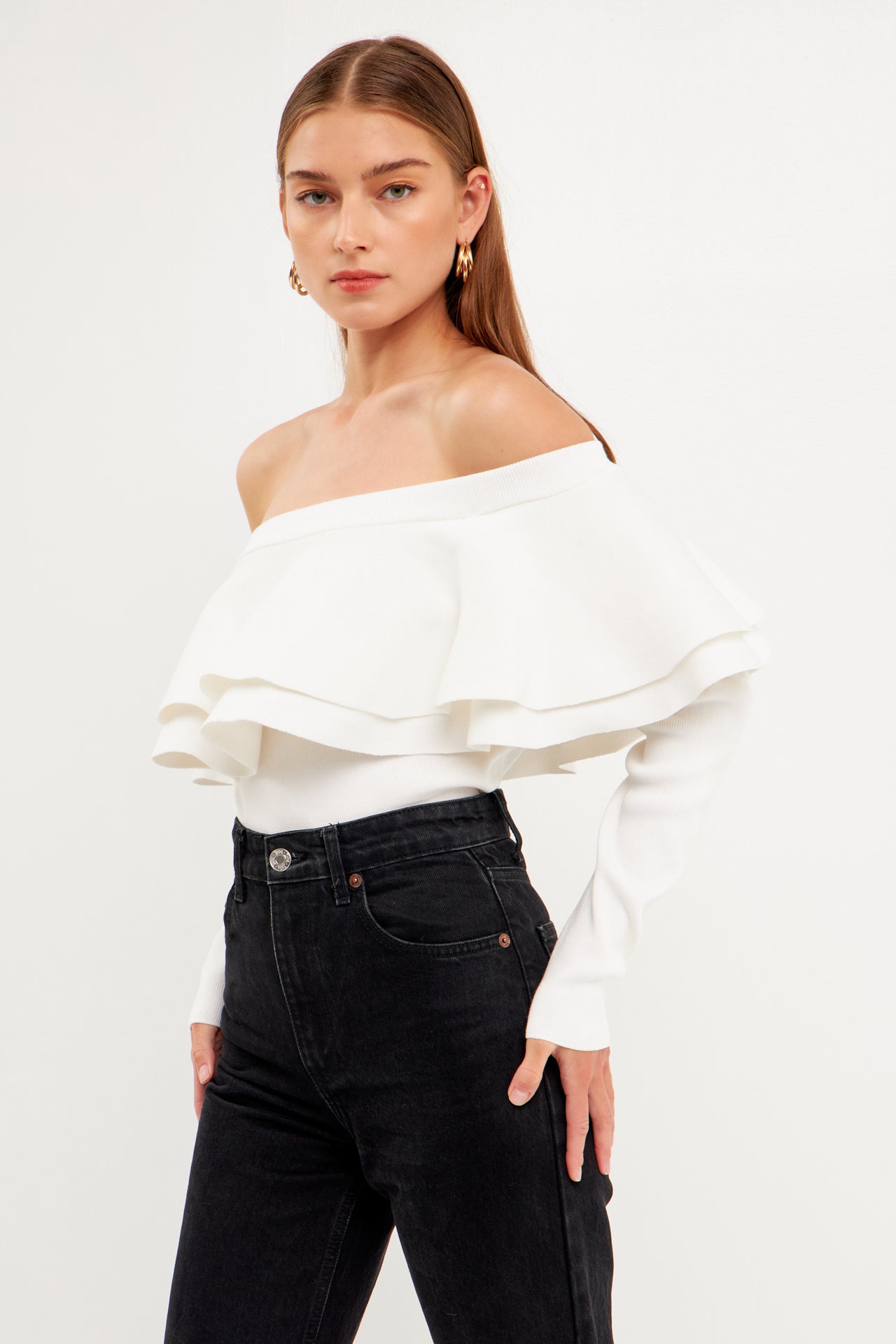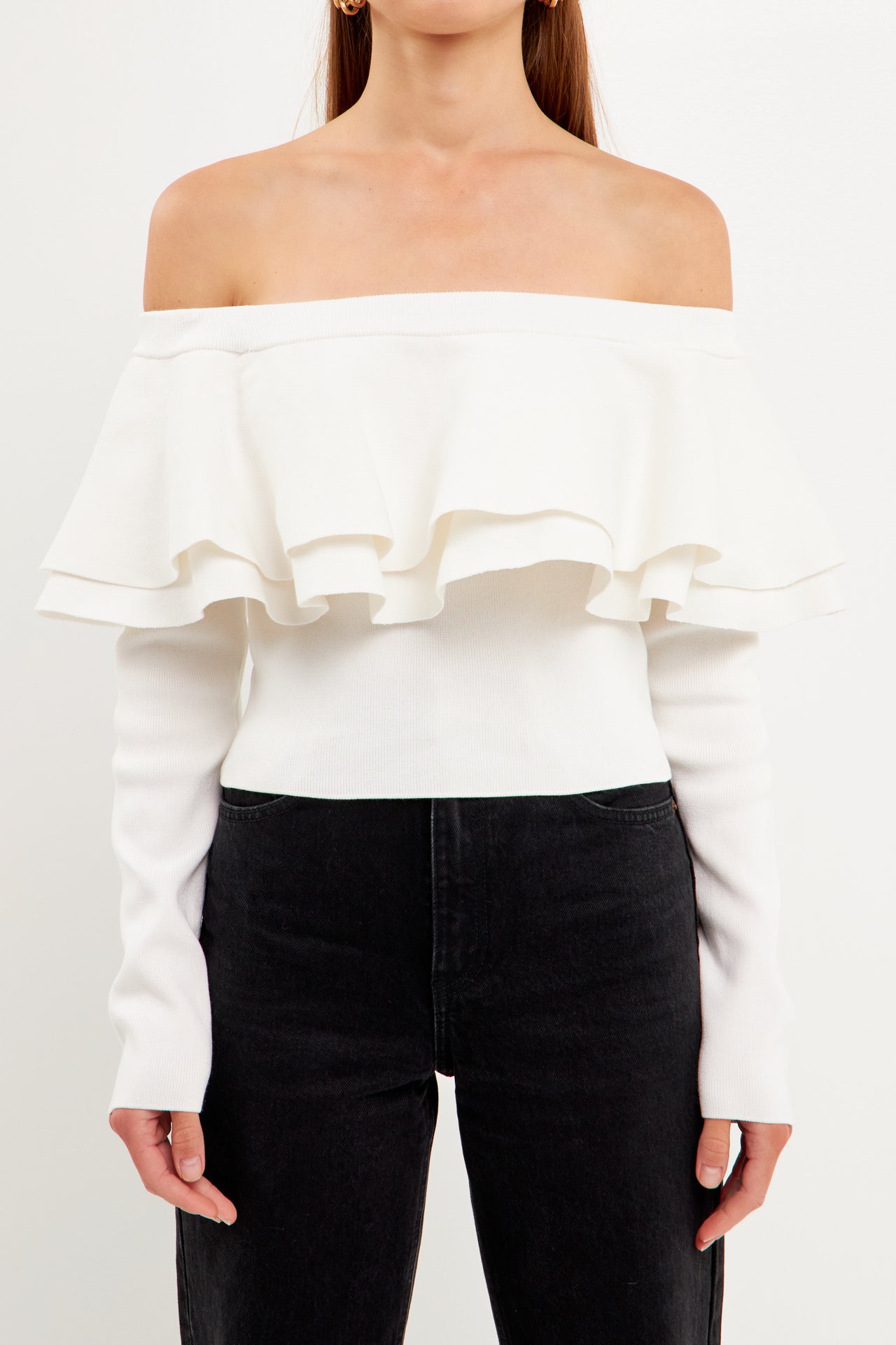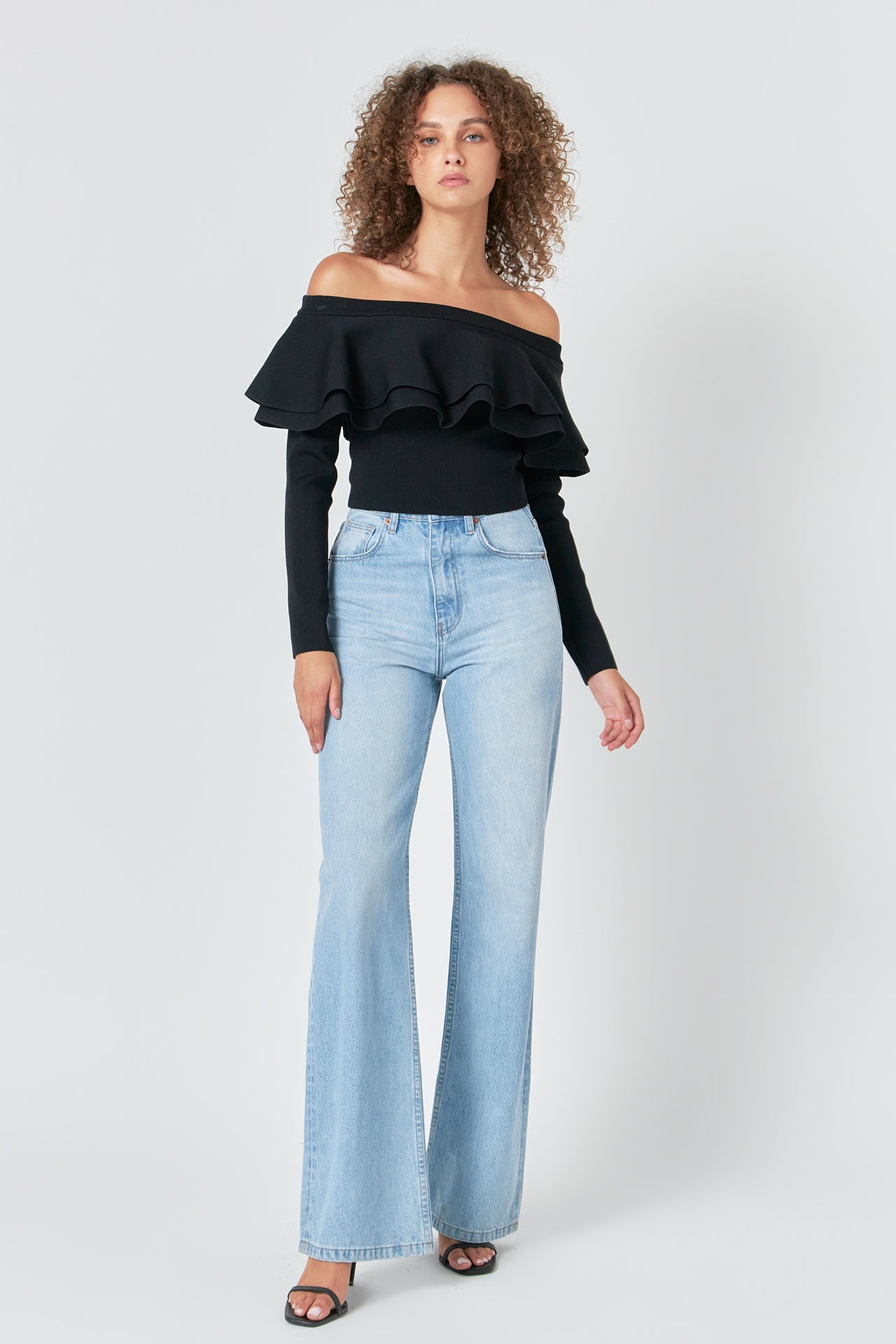 The best way to show off those shoulders. This Off Shoulder Knit Top is perfect for your next night out. With long sleeves and a flare detail, this top is both flirty and stylish. Pair it with your favorite jeans and heels for a complete look.