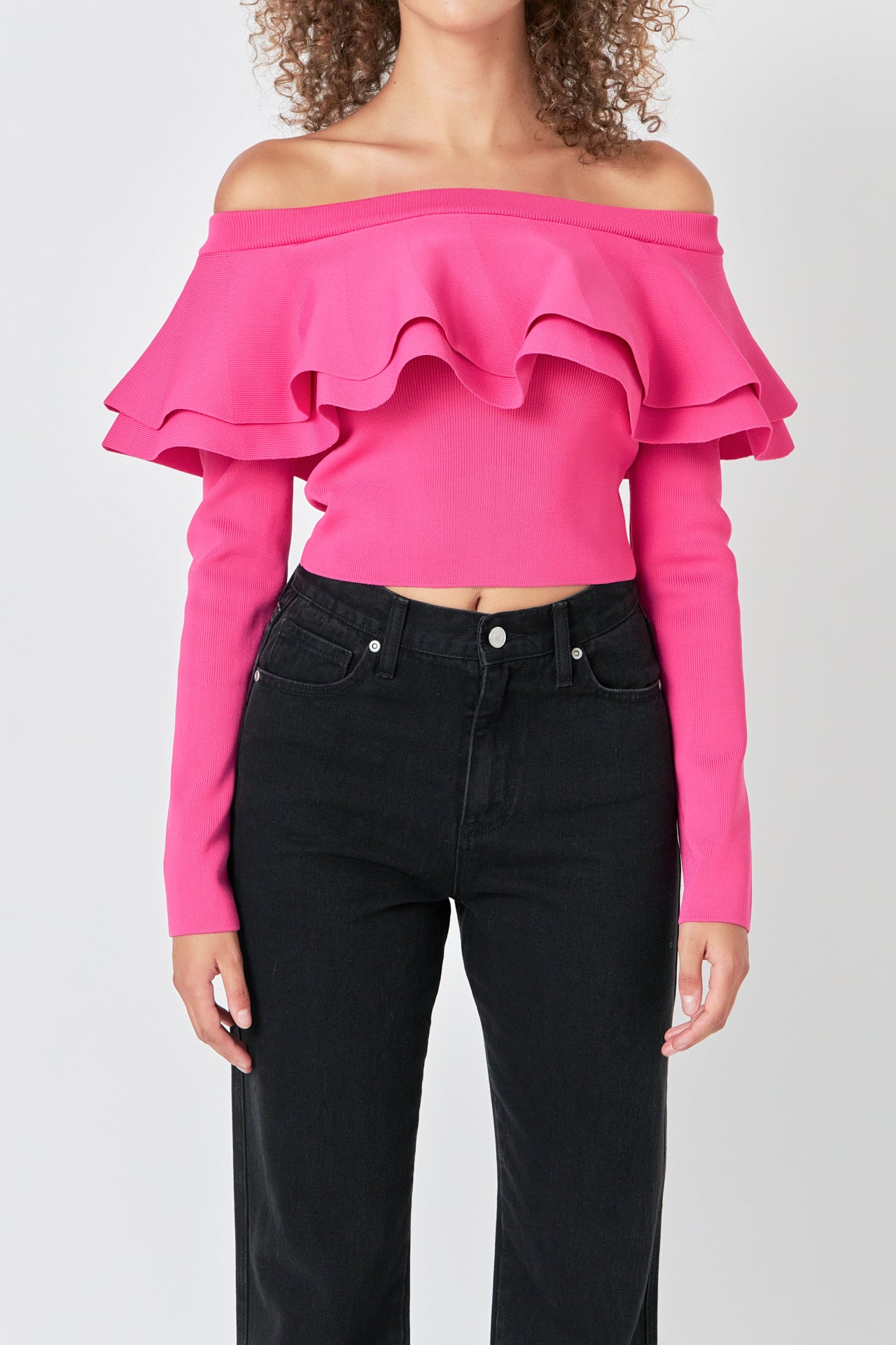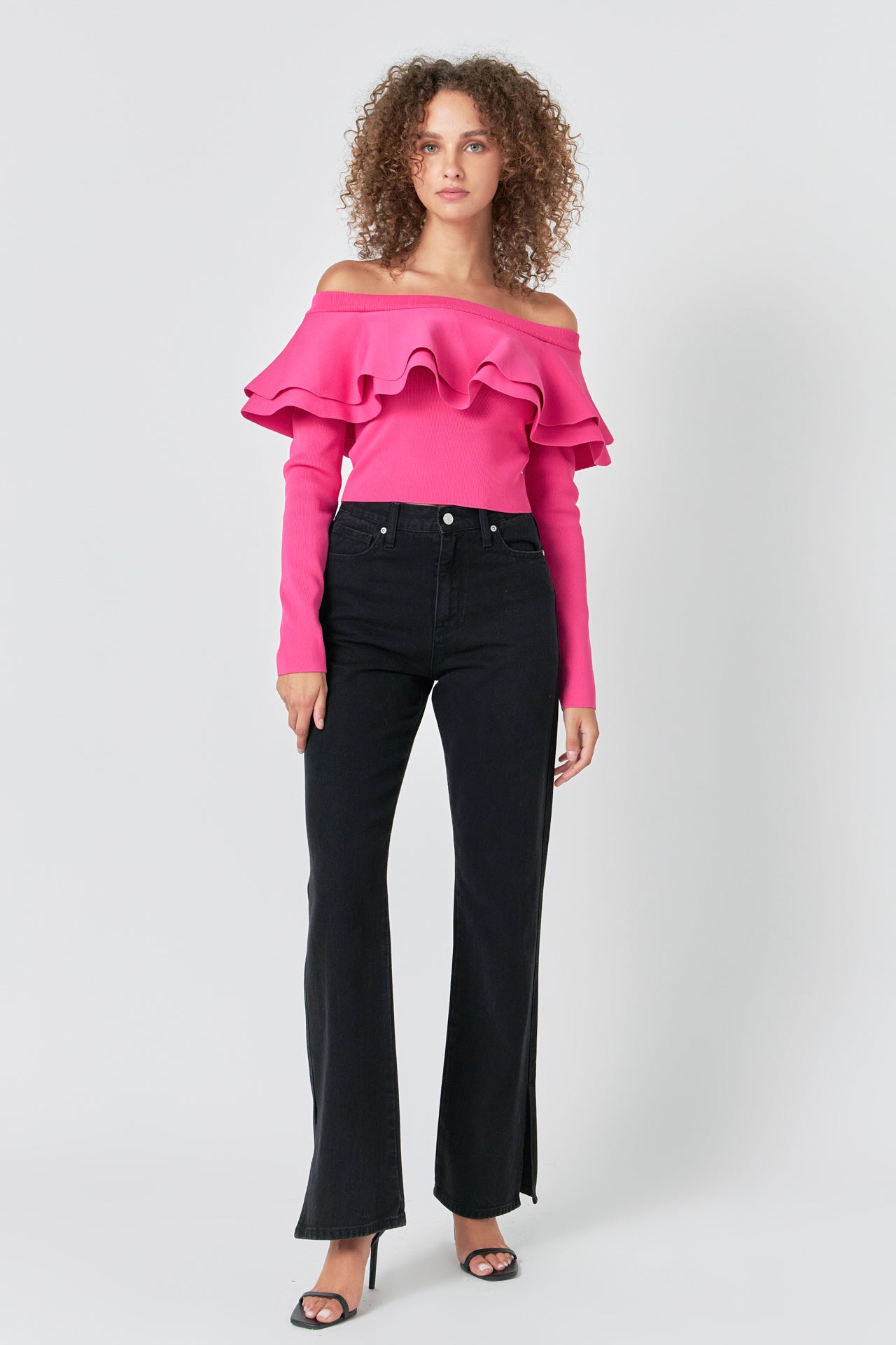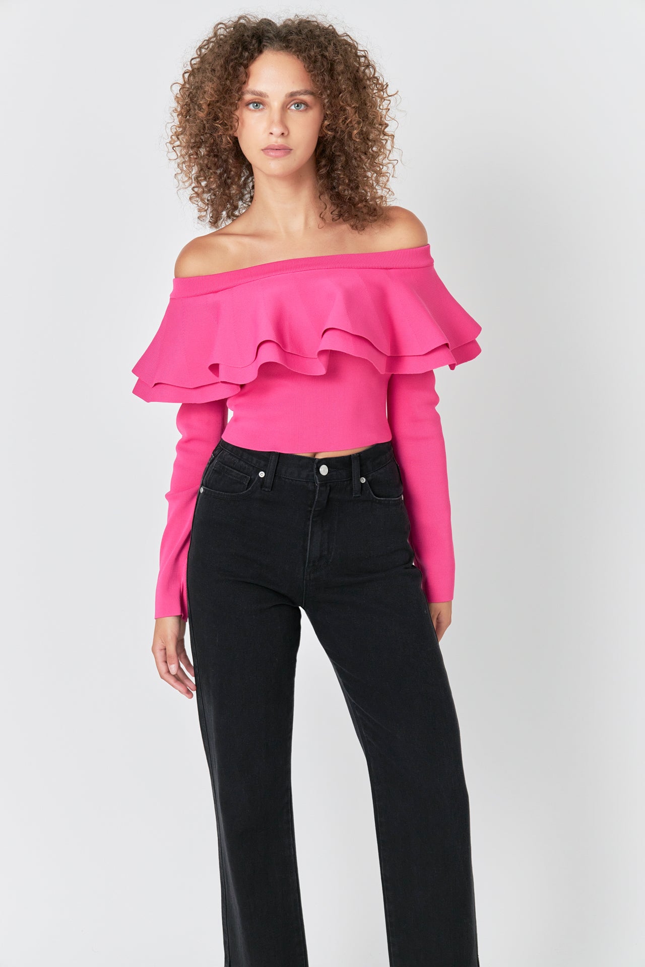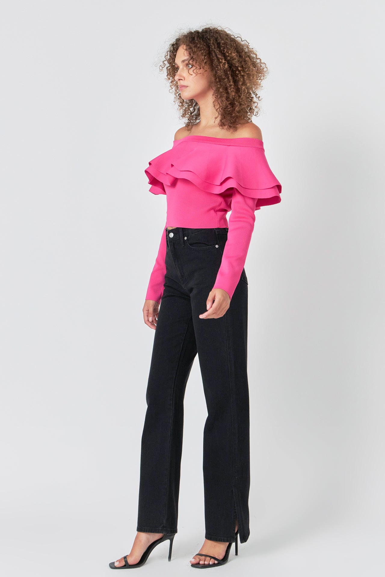 The best way to show off those shoulders. This Off Shoulder Knit Top is perfect for your next night out. With long sleeves and a flare detail, this top is both flirty and stylish. Pair it with your favorite jeans and heels for a complete look.