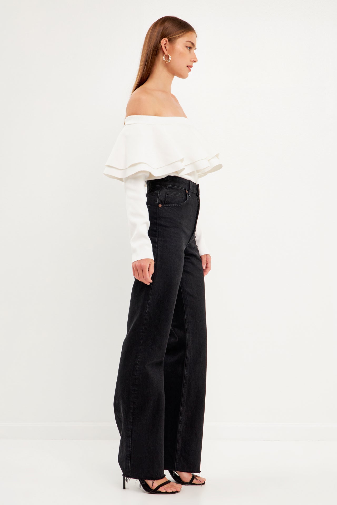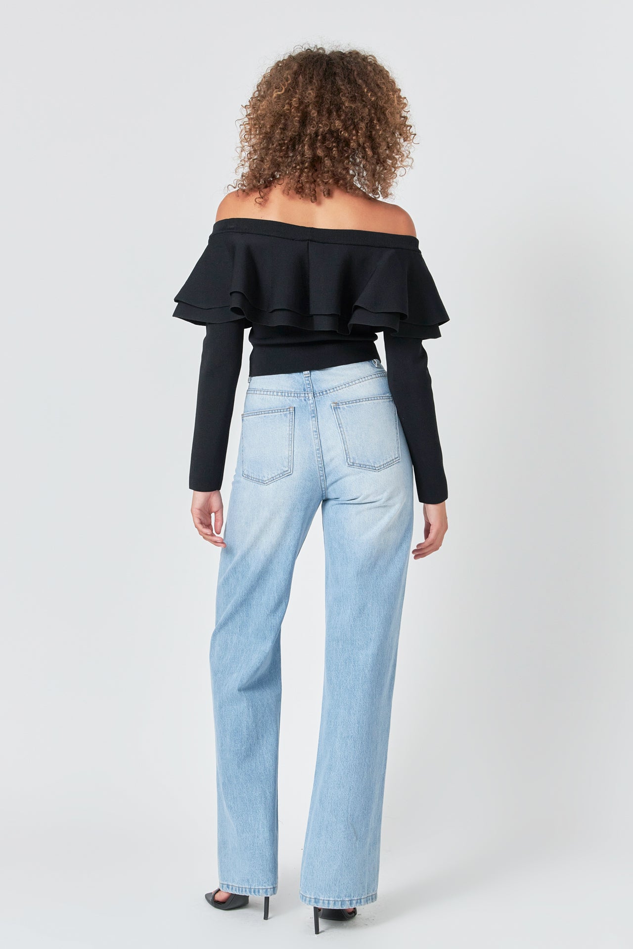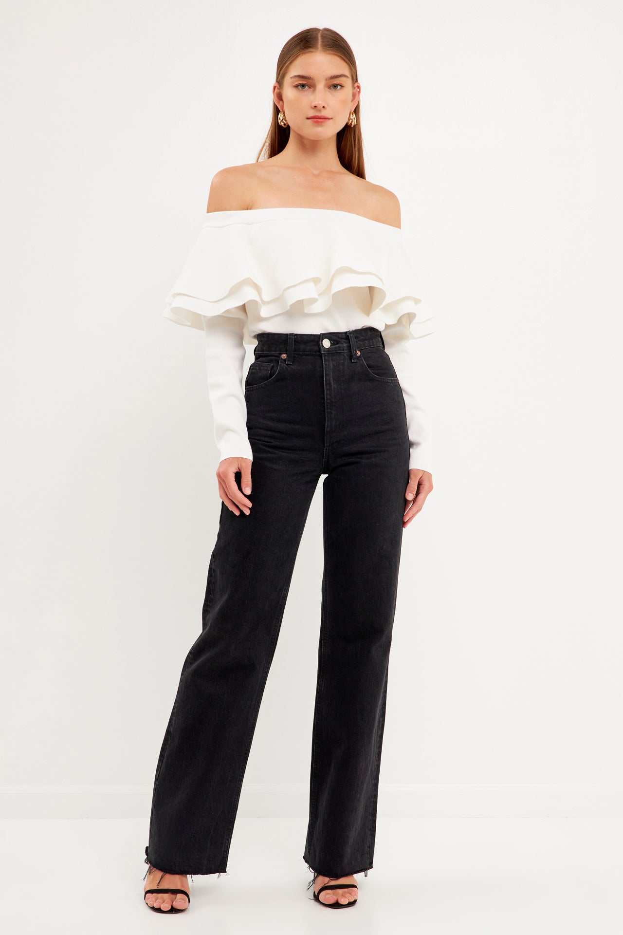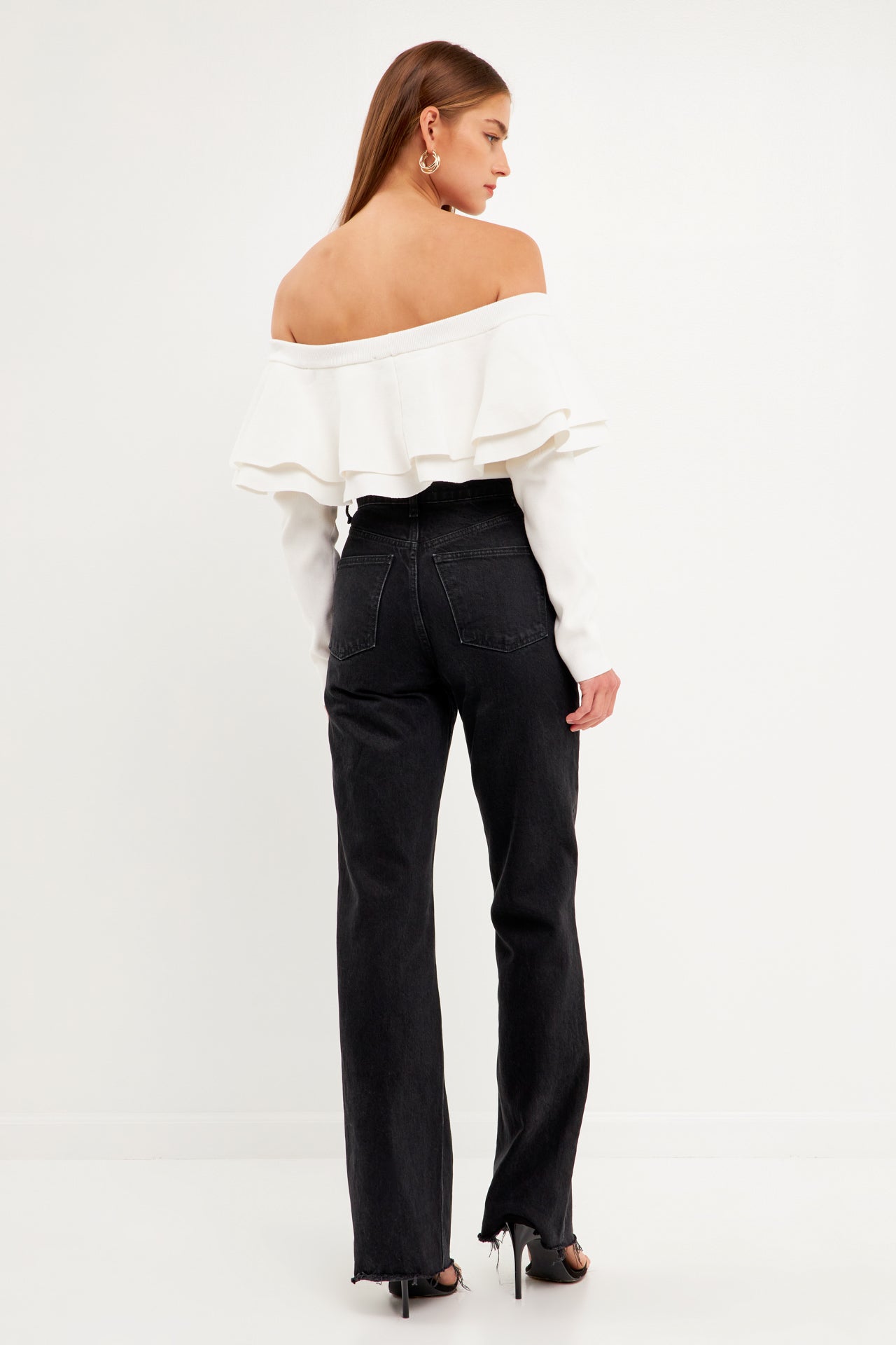 The best way to show off those shoulders. This Off Shoulder Knit Top is perfect for your next night out. With long sleeves and a flare detail, this top is both flirty and stylish. Pair it with your favorite jeans and heels for a complete look.