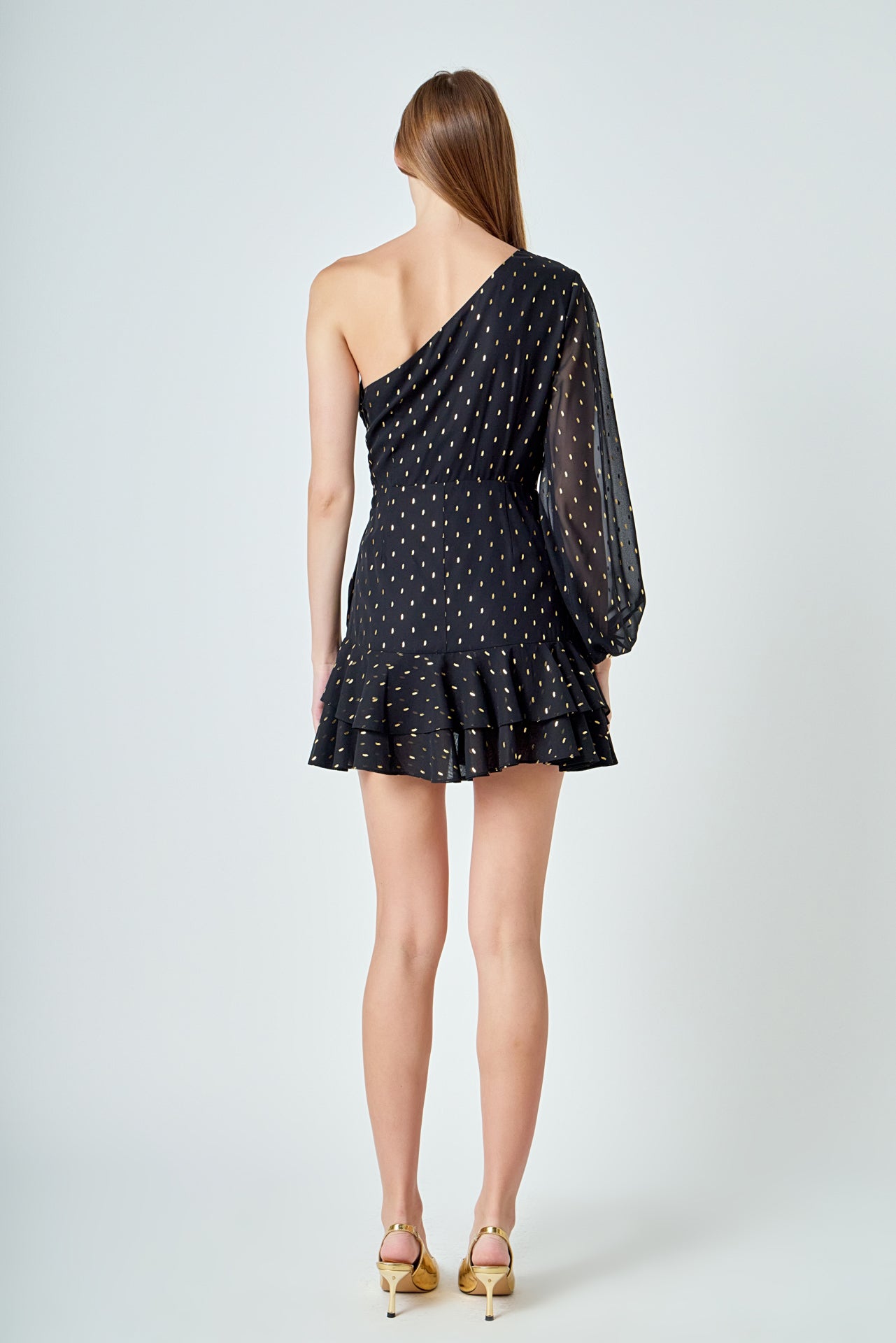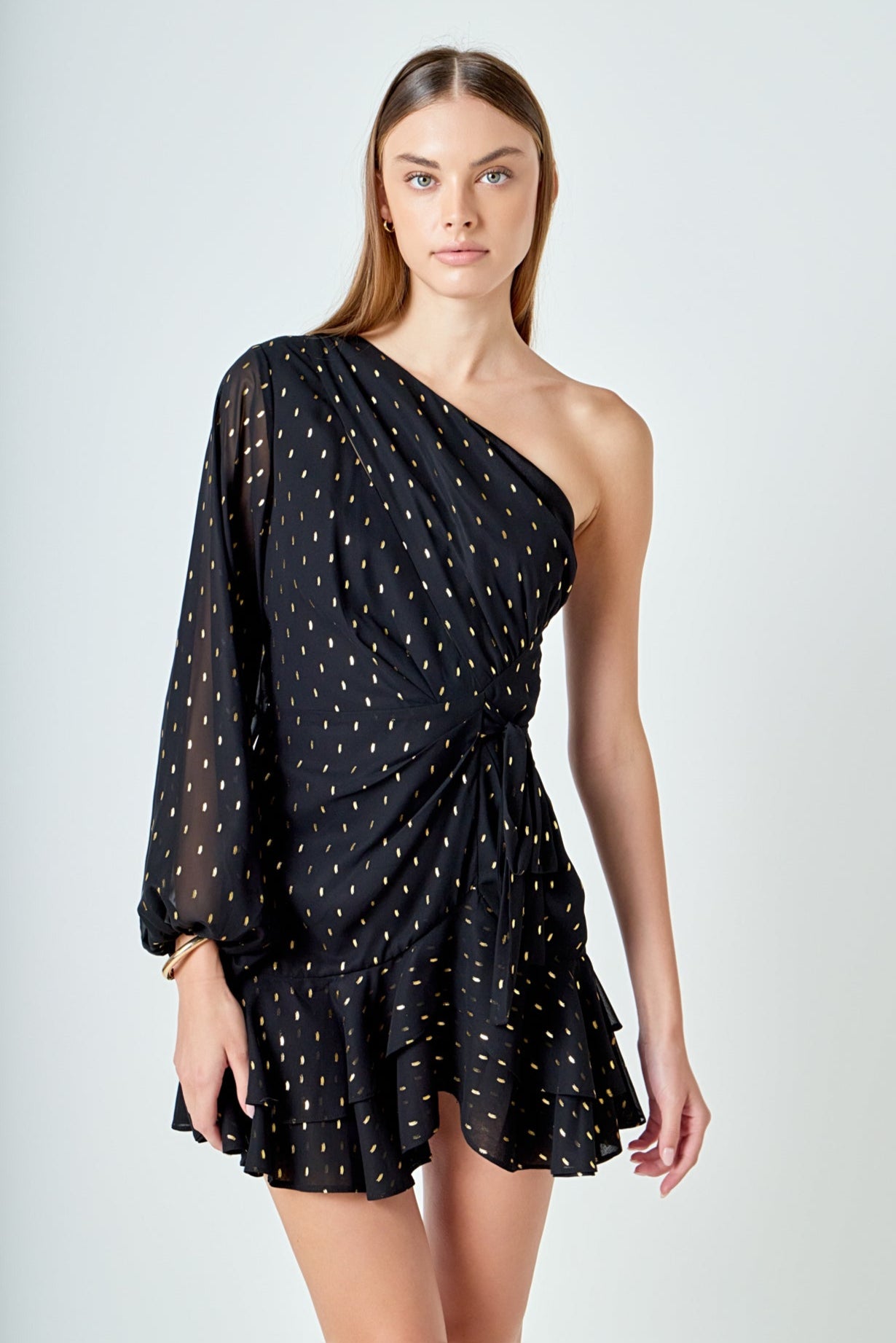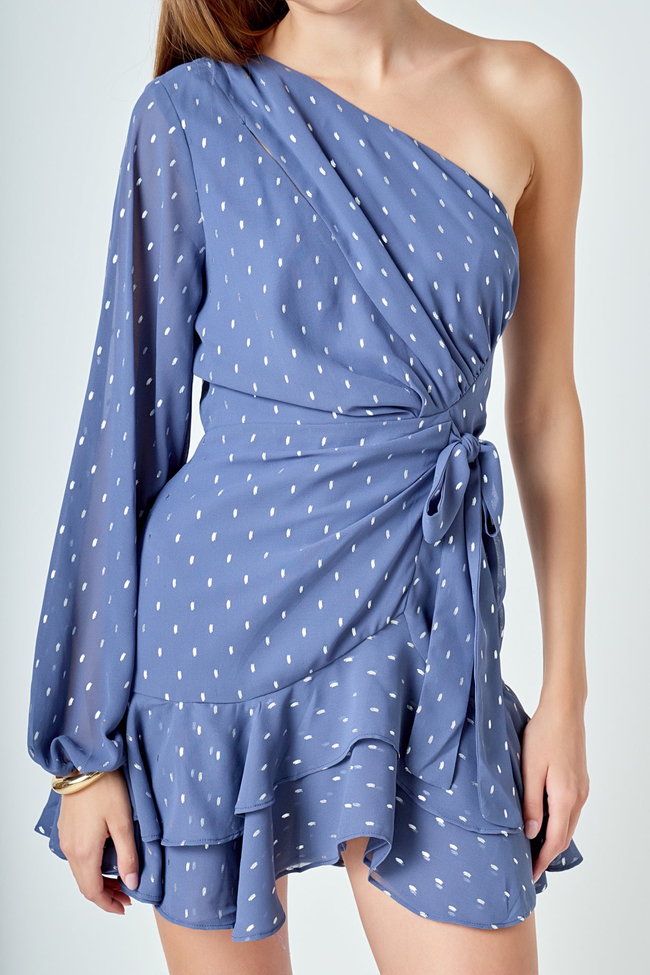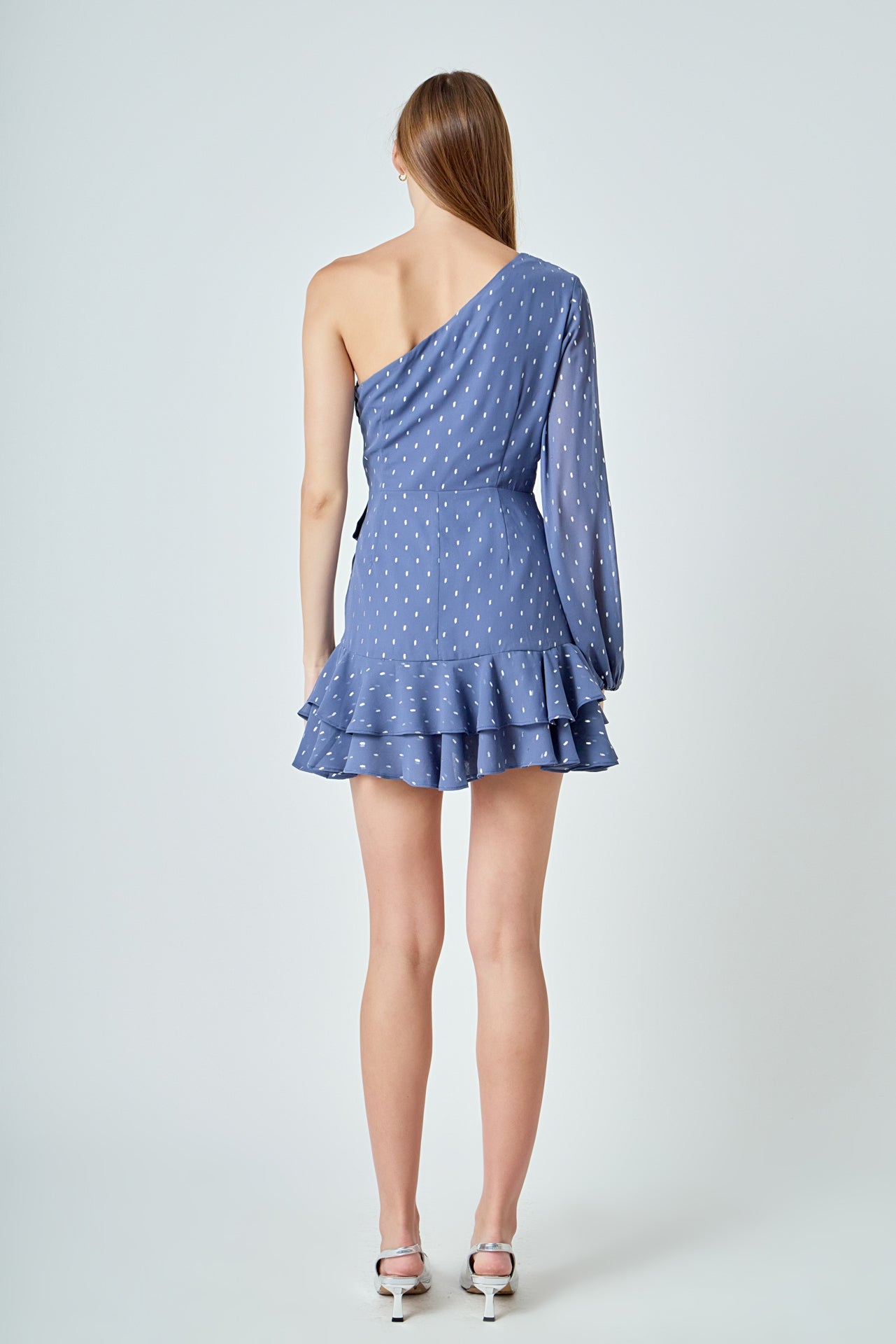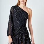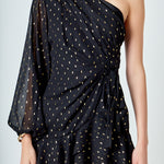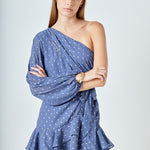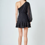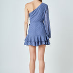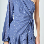 Look chic and fashion-forward in this beautiful Dot Chiffon One Shoulder Mini Dress. Featuring long sleeves and a ruffled hem this dress is the perfect blend of elegance and style. The unique one shoulder design makes this an eye-catching piece for any wardrobe. Show off your fashion sense and stand out with this gorgeous mini dress.