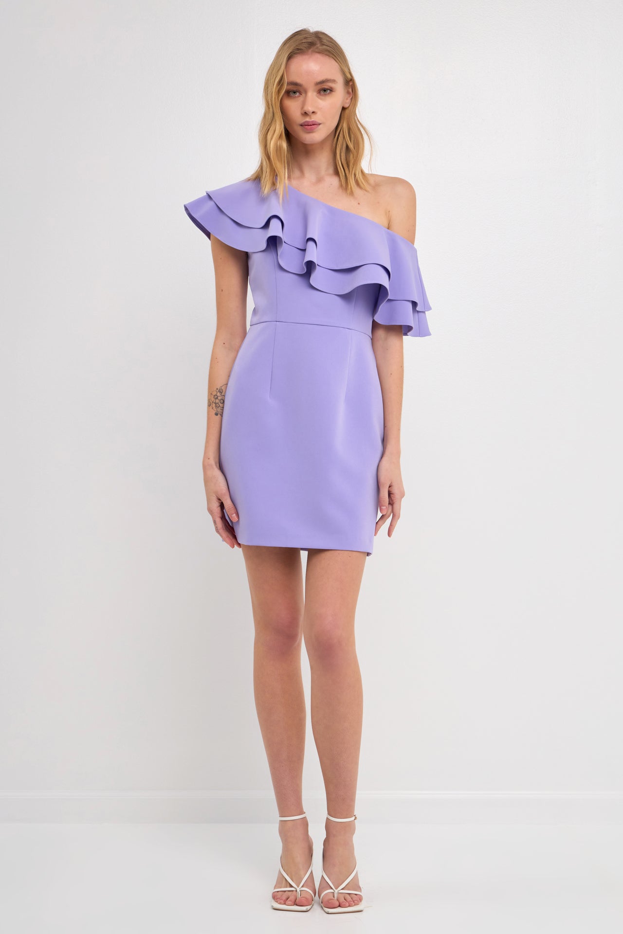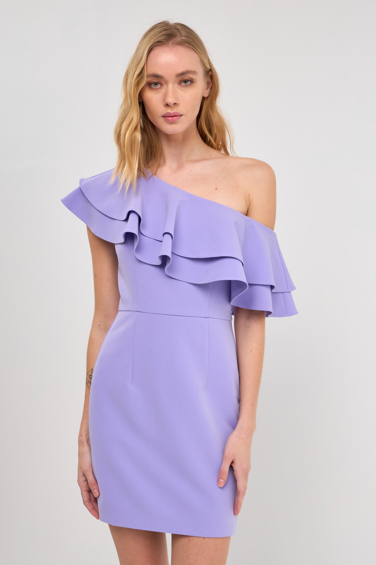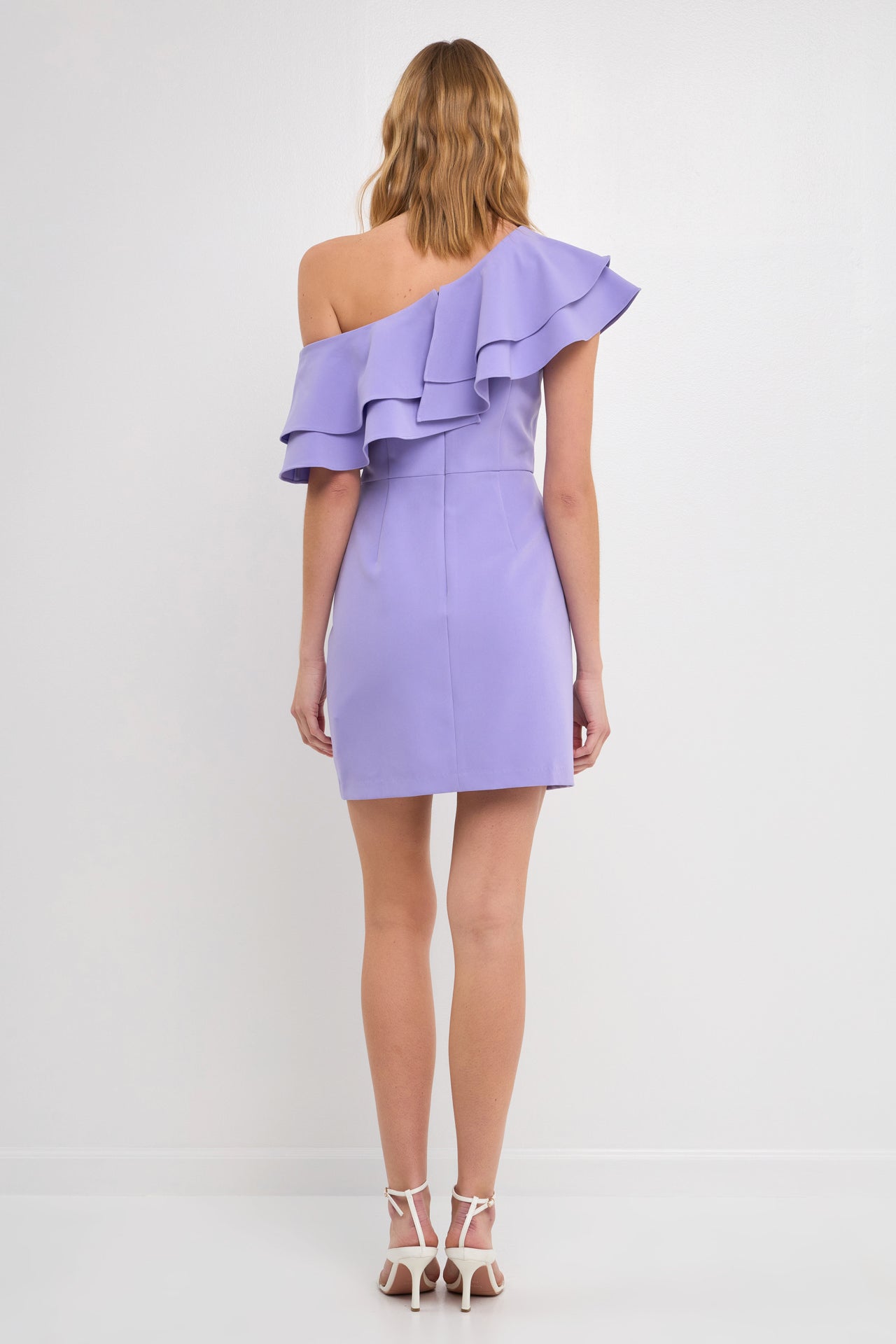 This one shoulder dress is sure to make a statement! The ruffle detail at the shoulder adds a touch of femininity, while the beautiful lilac hue makes it perfect for any cocktail party or formal event.