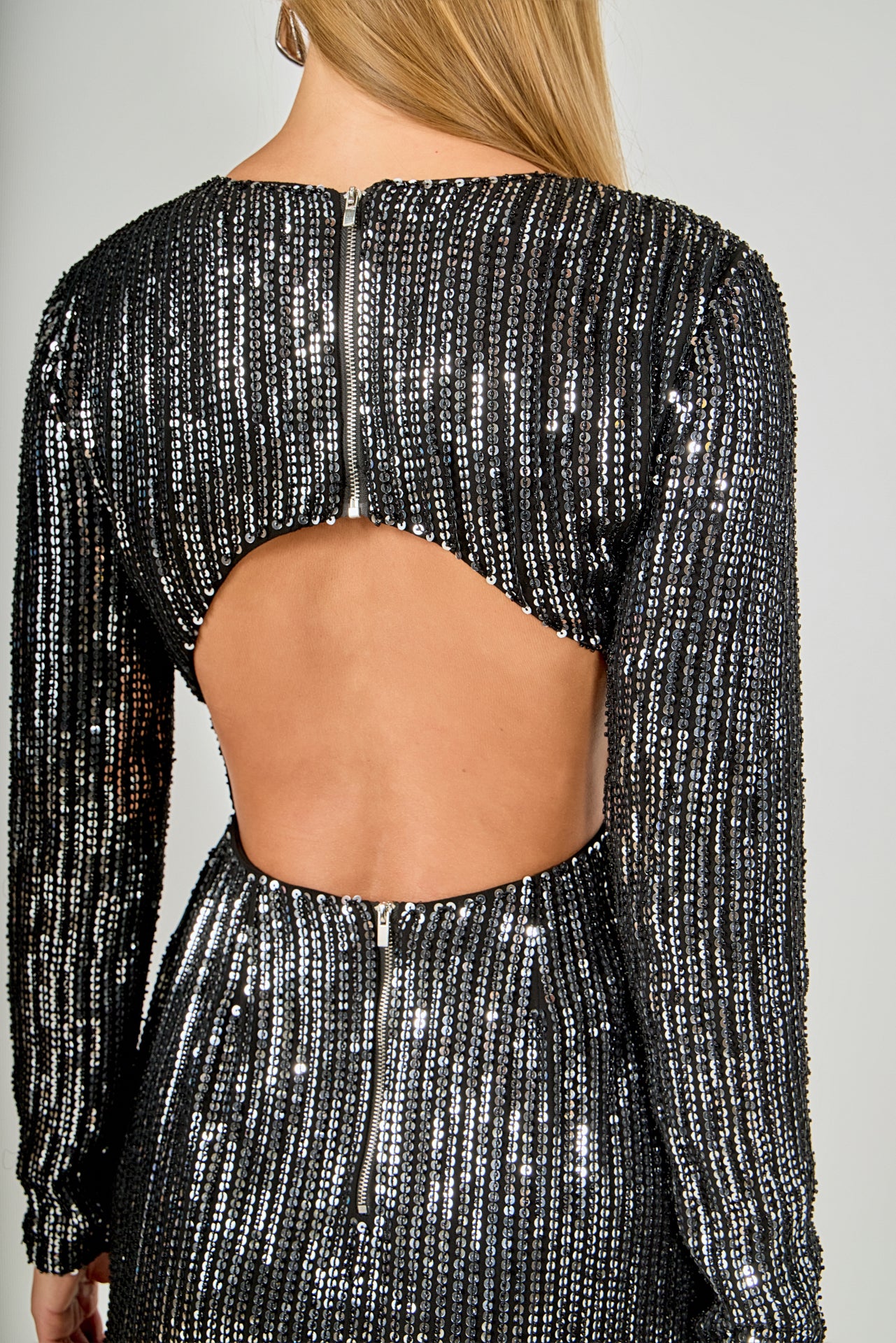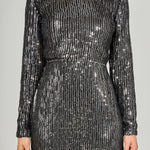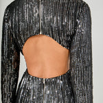 Look effortless and stylish in this gorgeous Open Back Sequin Dress. Crafted from shimmering sequined fabric with a round neckline and long sleeves, this dress oozes sophistication. Its open-back detail adds a touch of glamour, making this piece the perfect party dress. Stand out in the crowd with this stunning dress and be the center of attention. Highlight your curves by pairing this dress with heels and a clutch.