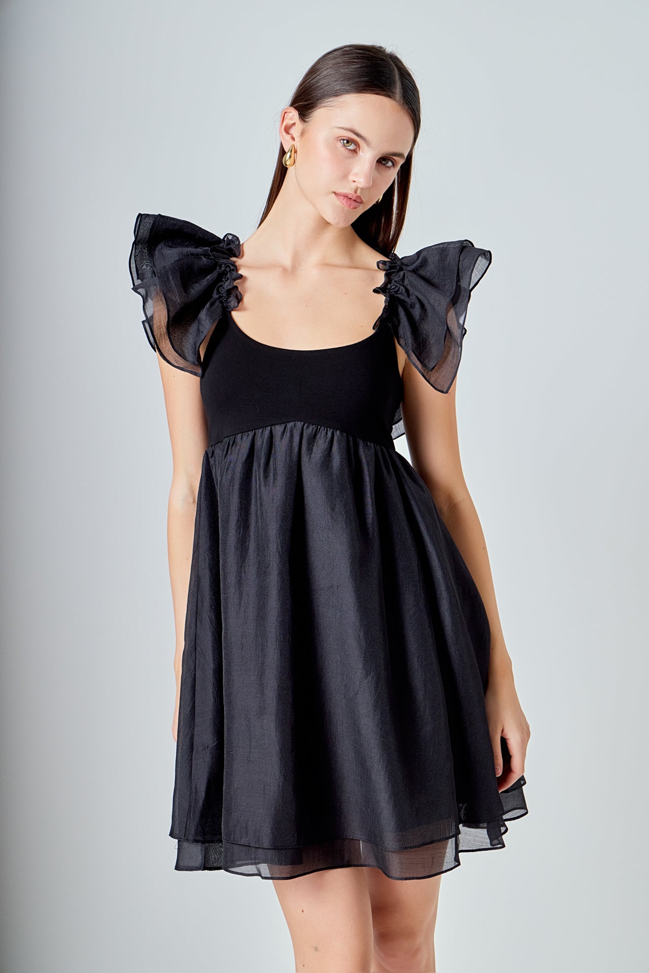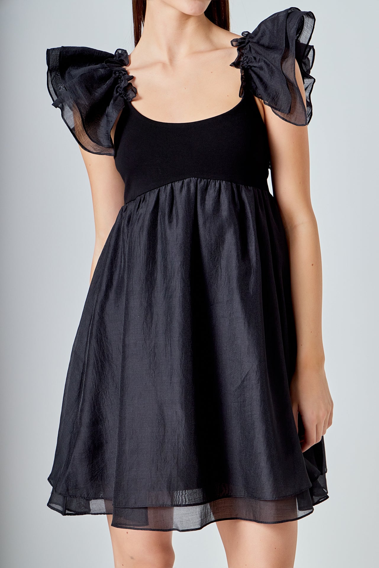 Step into the spotlight in our Organza Sleeve Mini Dress a stunning mix of bold and elegant features that will make heads turn. The knit bust creates a flattering fitted silhouette while the double layer organza shoulder ruffle adds a touch of drama. Perfect for any special occasion this dress also features elastic at the shoulder for comfortable wear all day long. Don't miss out on this must-have dress that combines mixed media and luxurious design. Dress it up with heels or keep it casual with sandals. Look and feel confident in our Organza Sleeve Mini Dress!