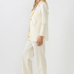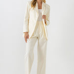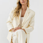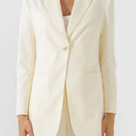 This ivory blazer is the perfect way to add a touch of luxury to your look. The oversized fit makes it perfect for layering, while the single breasted design gives it a timeless and elegant feel. Wear it with your favorite jeans for a casual but chic look, or dress it up with a skirt or trousers and a crop top for an evening out. No matter how you wear it, you'll love the luxurious feel of this blazer.