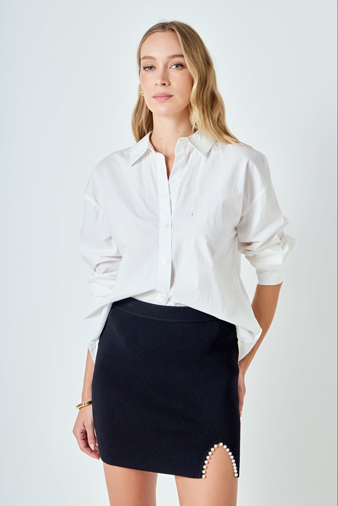 Elevate your skirt game with our stunning Pearl Accented Cutout Mini Skirt. Crafted from lightweight and soft fabric, this mini skirt hits all the right notes for a chic and feminine look. The pearl accents add a touch of elegance and create a delicate yet eye-catching detail. With its front slit and elastic waistband, this skirt not only flatters your figure but also offers comfort and versatility for any occasion. Show off those legs and pair with your favorite top and heels for a fashionable statement. Perfect for day or night, this mini skirt will become your go-to piece.