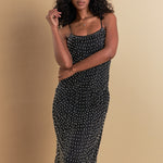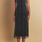 An elegant dress accented with glamorous pearls and beads. Plus, the adjustable straps allow you to get the perfect fit.