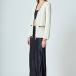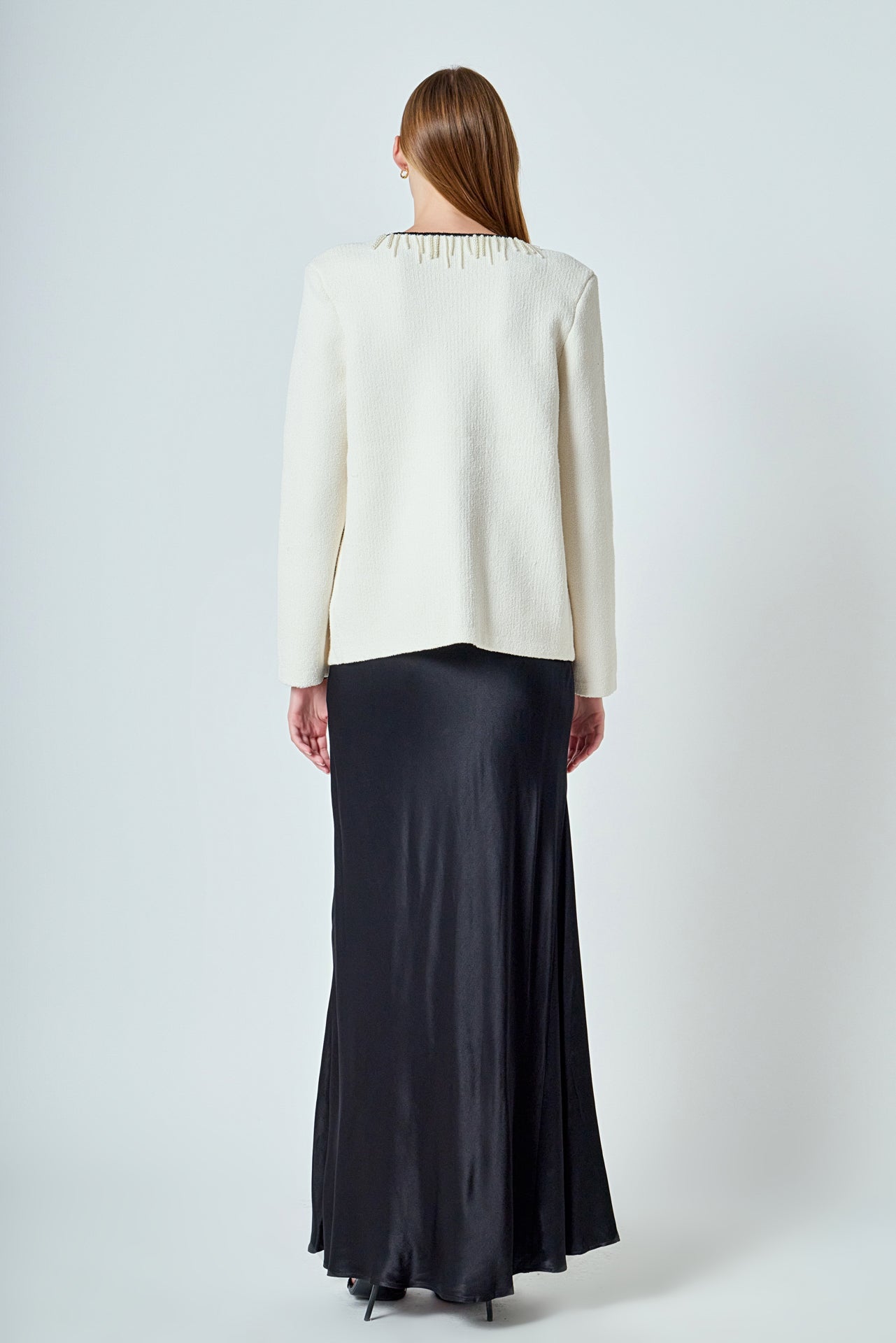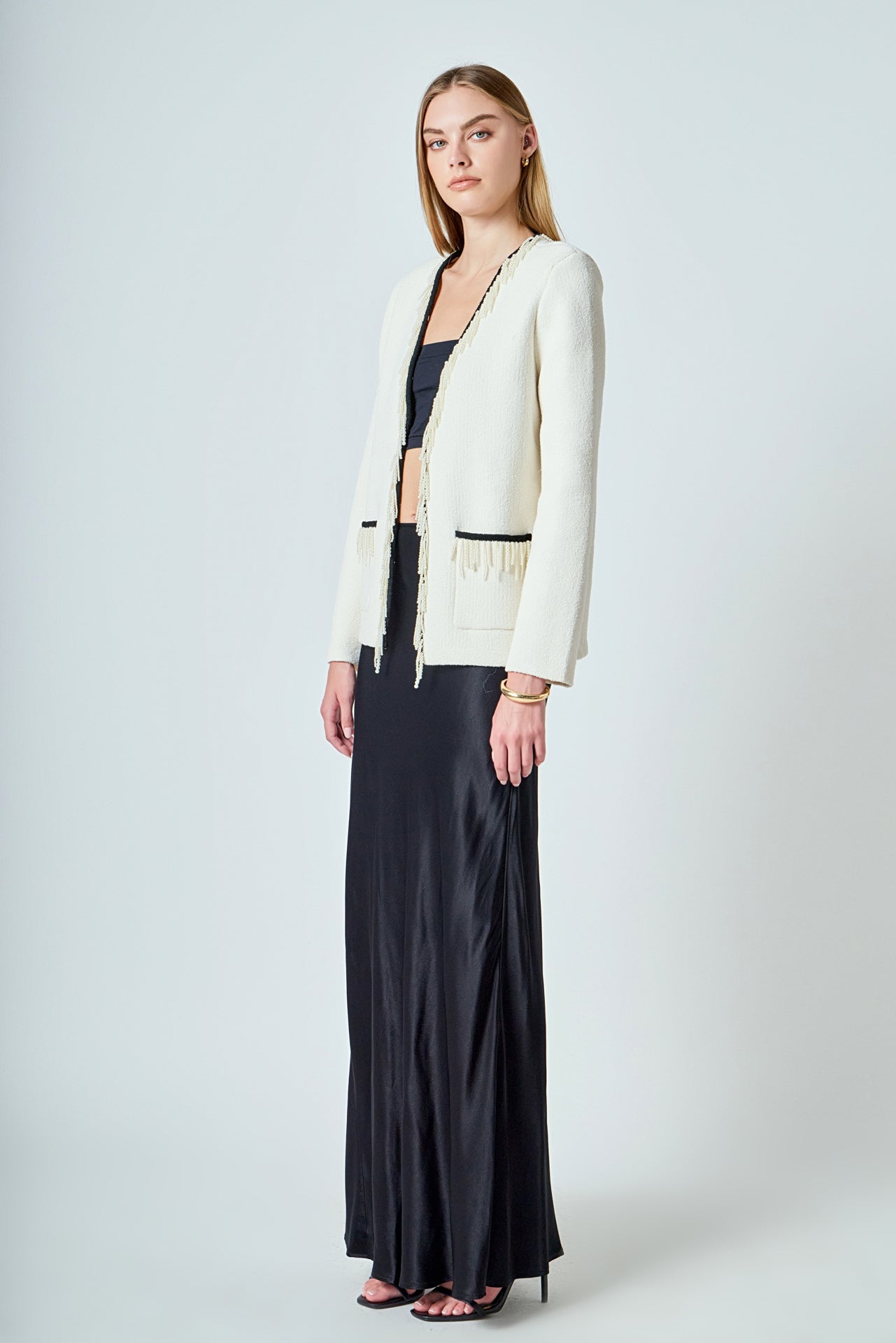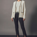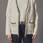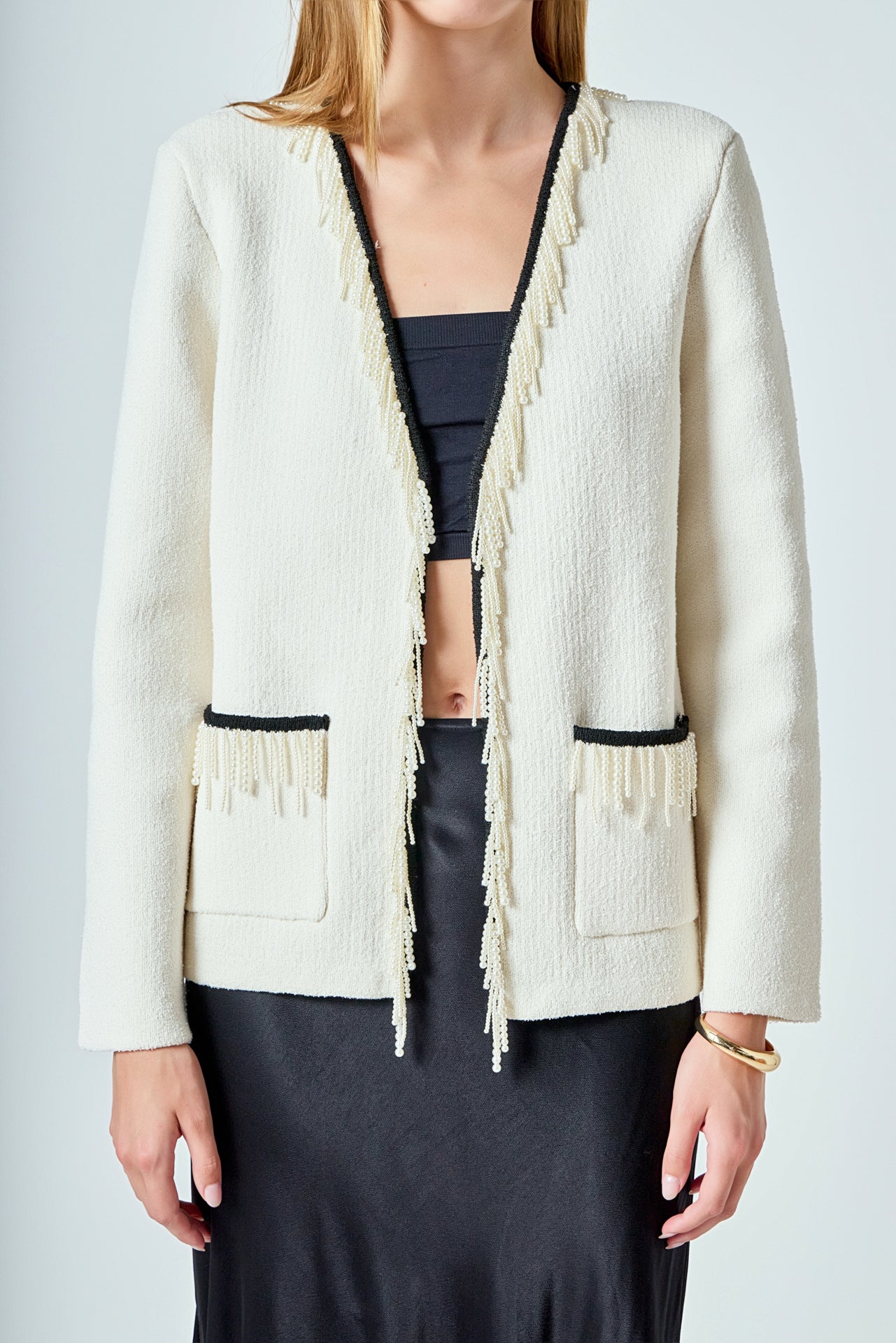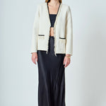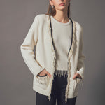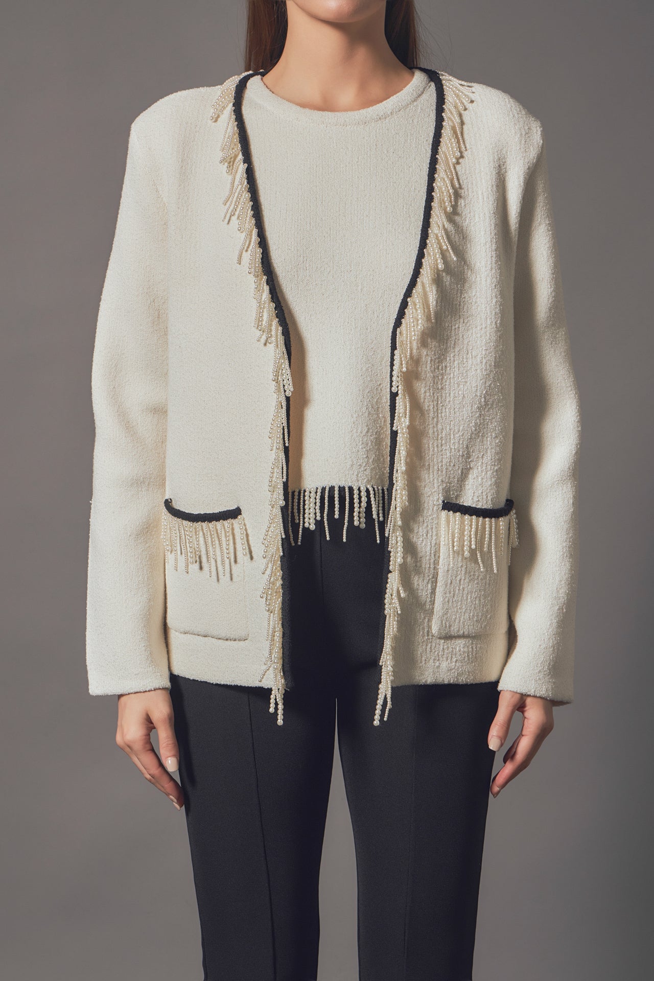 Welcome a timeless wardrobe staple with our Pearl Trim Knit Cardigan. Crafted from a lightweight knitted fabric this classic silhouette features a V neckline long sleeves and center front button closure for a tailored look. A beautiful pearl trim detail adorns the neckline elevating this must-have piece. A versatile and office-appropriate cardigan that transitions from day to night effortlessly. Keywords: Lightweight Pearl Trim V Neckline Cardigan.