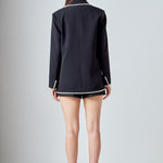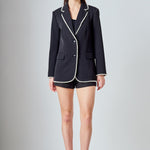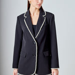 Step up your style game with this elegant Premium Pearl-Trimmed Blazer. Crafted with a classic oversized look and two button closure this chic blazer features long sleeves with pearl trim edges shoulder pads and a notched collar for an eye-catching look. It is fully lined to provide you a comfortable feel.