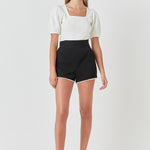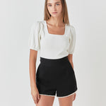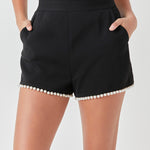 Complete your sophisticated look with our Premium Pearl-Trimmed Shorts. These high waist shorts feature two tiers at the waist band and side pockets for convenience. Accenting the edges is a pearl trim detail perfect for adding a touch of elegance to your ensemble.