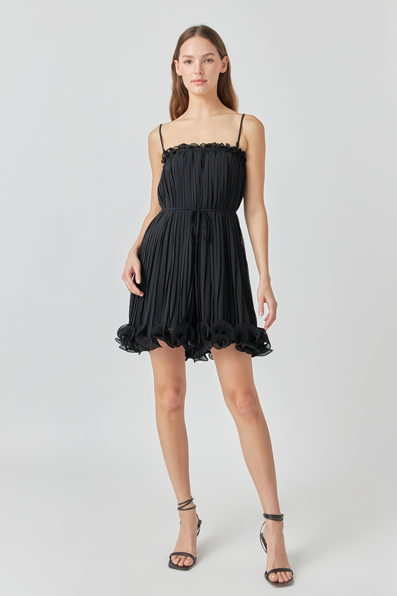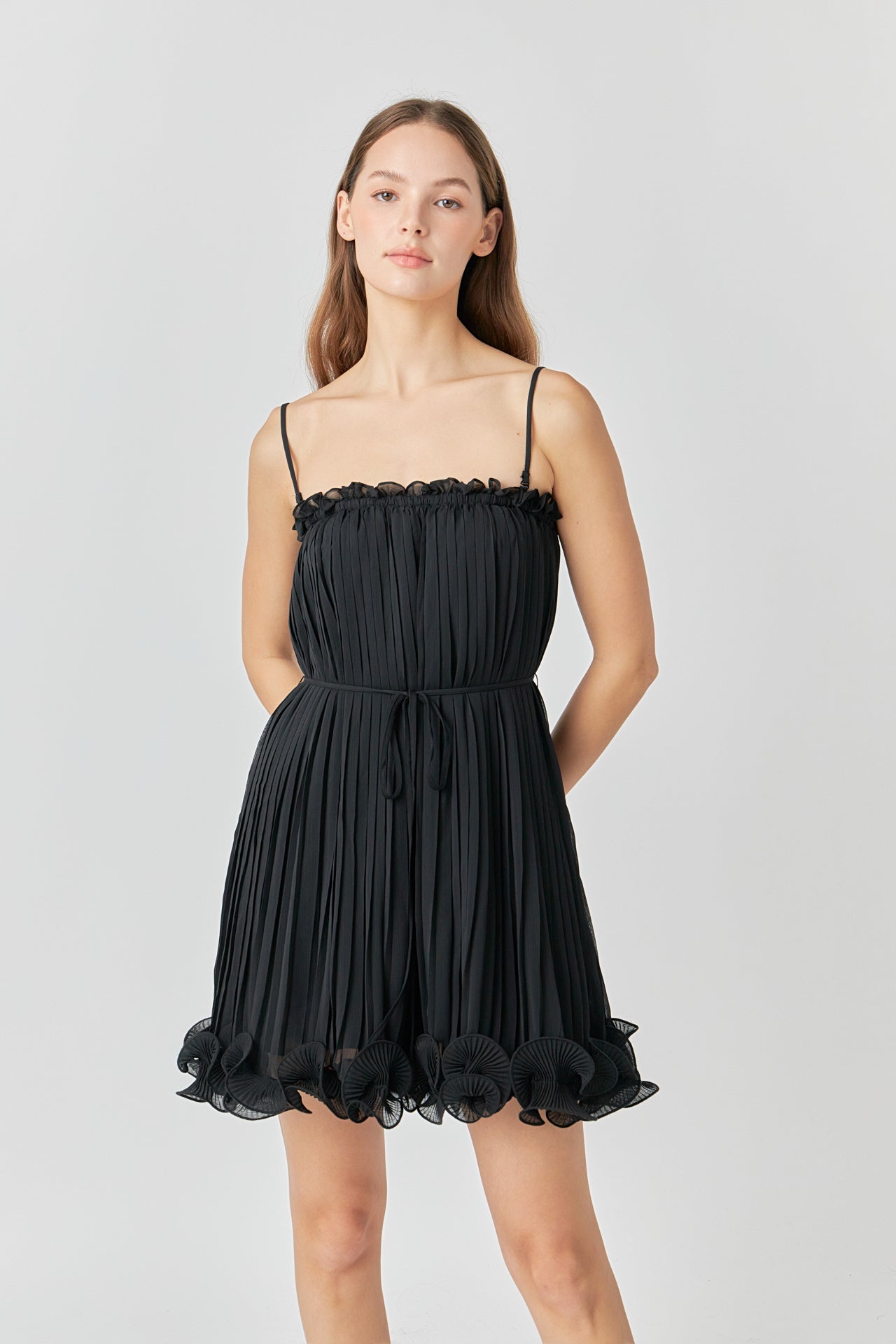 Think flirty and fun with this pleated chiffon ruffle mini dress. Featuring a loose fit and ruffle at the top edge it's a cute and feminine piece for any occasion. Elastic at the chest line provides structure while fish wiring bottom detail adds an extra touch of style. Plus you can easily customize your look with the removable shoulder strap and belt. Stand out from the crowd in this irresistibly chic mini dress.