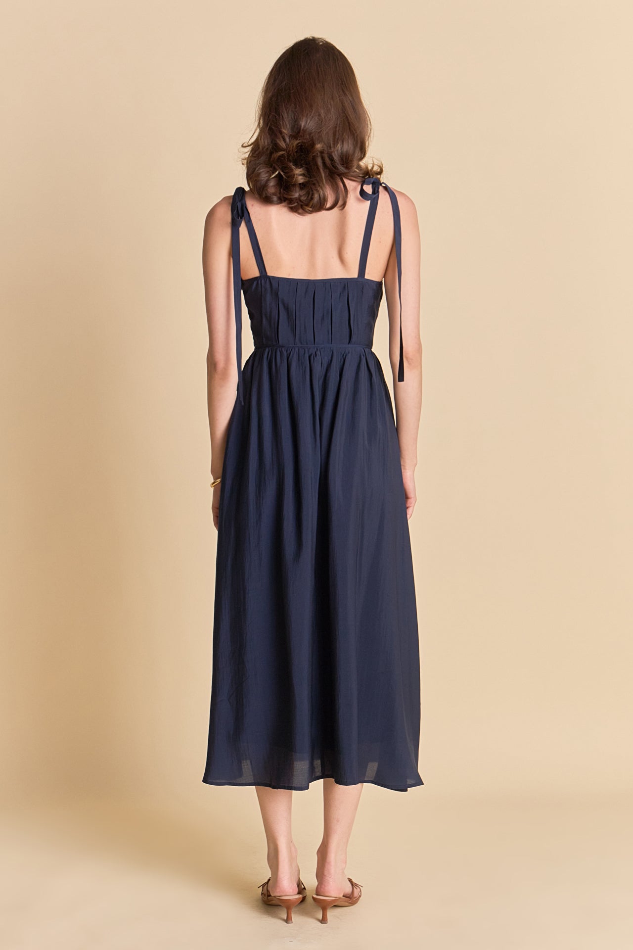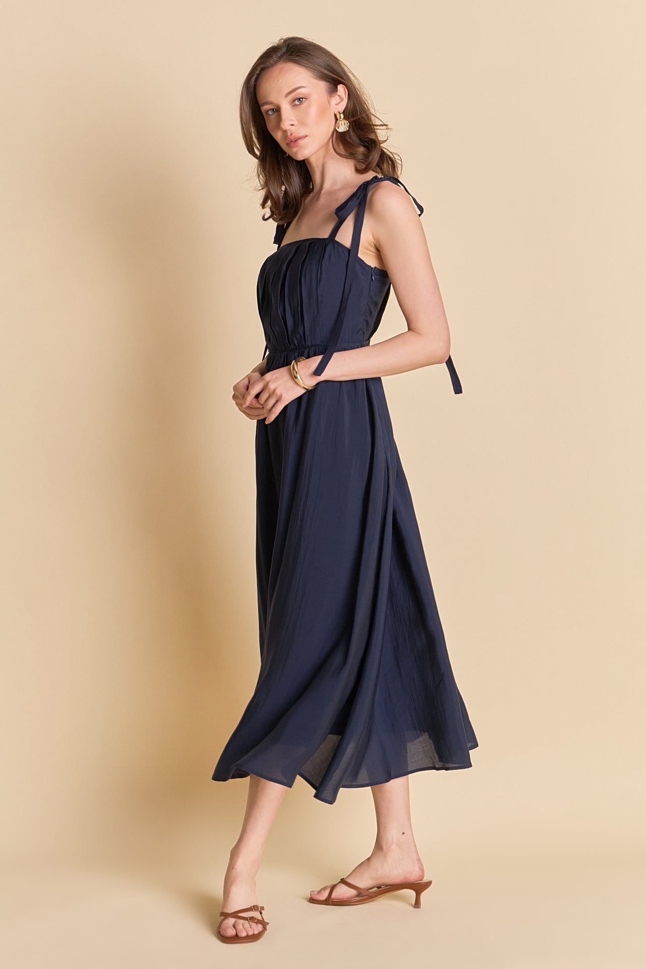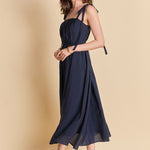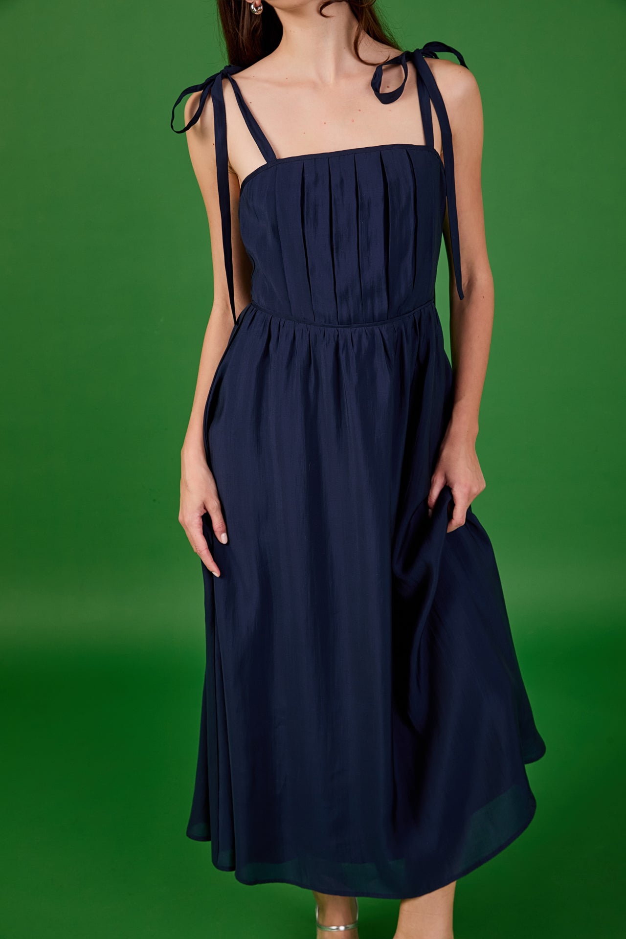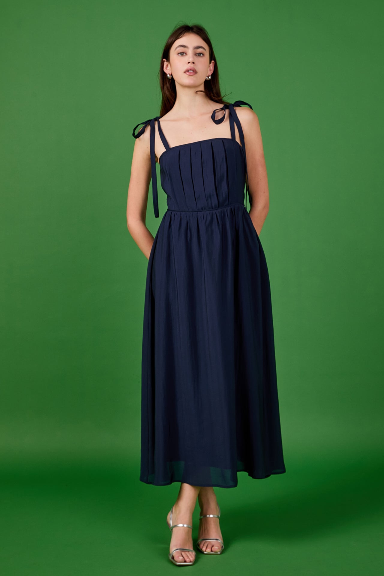 Upgrade your wardrobe with our must-have Pleated Midi Dress. Featuring elegant pleats that add texture and movement to your look this dress is designed to flatter your figure with its fit and flare silhouette. The tie strings add a touch of feminine charm and allow you to cinch in at the waist for the perfect fit. Its midi length is perfect for showing off your stylish footwear while keeping things modest. Perfect for day-to-night dressing this versatile dress is a wardrobe staple. Elevate your style game and make a statement with our Pleated Midi Dress.