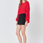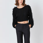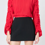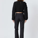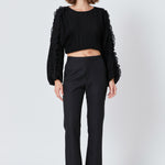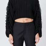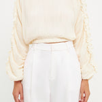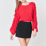This cropped blouse is made with a sheer plisse fabric and features ruffle detailing on the sleeves. The elastic waistband provides a comfortable fit.