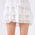 Add a touch of romance to your style with our Pocket Lace Tiered Mini Skirt. Eyelet and tiered ruffles give this mini skirt its girly charm. The side zipper makes it easy to put on and take off, while the lining ensures a comfortable fit. Perfect for dressing up or down, this skirt is a must-have in any fashion-savvy woman's wardrobe.