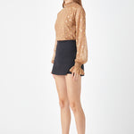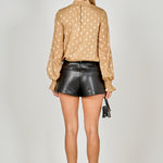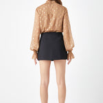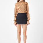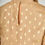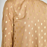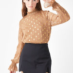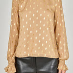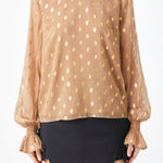 This elegant chiffon blouse features a metallic polka dot print. With feminine touches like ruffled sleeve hems and a back keyhole detail, it's the perfect blouse to dress up any look with ease. Tuck this blouse into your favorite jeans, high-waisted pants, or skirt, and you'll instantly create a chic, sophisticated look.