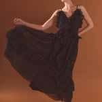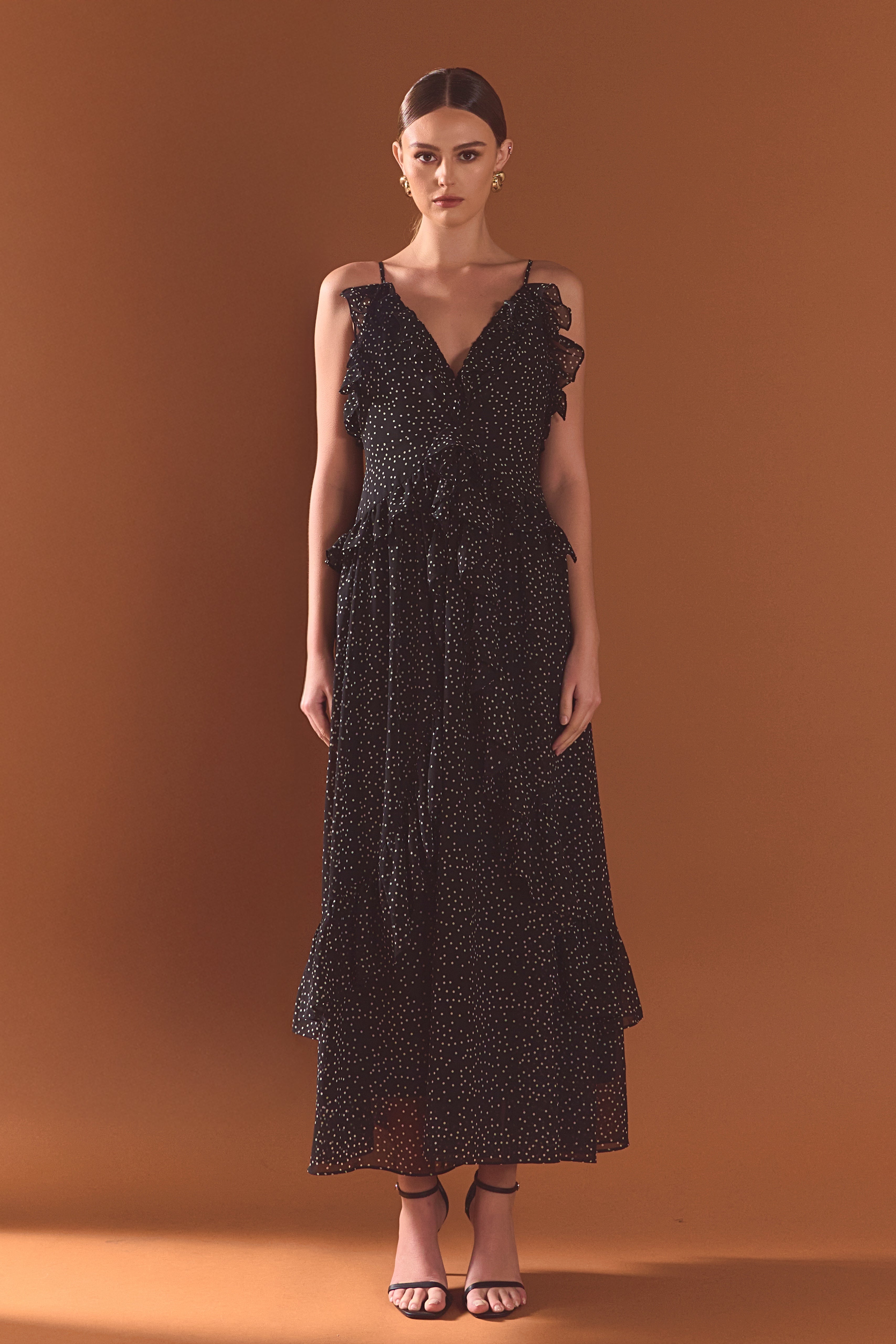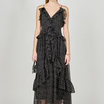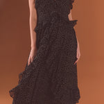 Get ready to turn heads in our stunning Polka Dot Ruffle Dress. Made from soft chiffon fabric adorned with playful polka dots, this dress exudes timeless elegance. The full length and low v-neckline create a flattering silhouette, while the ruffle detail adds a touch of flirtiness. Fully lined for comfort and coverage, this dress is perfect for any special occasion. Whether you're attending a wedding, a party, or a dinner date, this dress will make you feel confident and stylish. Shop now and stand out in this must-have dress!