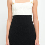 The ultimate party dress. This little number is sure to turn heads at your next special event. The textured fabric and color block design create a multi-dimensional piece. The fitted silhouette highlights your curves while the lining keeps you uber comfortable. Plus, the decorative gold buttons finish off the piece to add a touch of glamour.