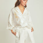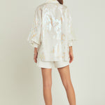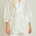 Introducing our must-have Print Foil Collared Shirt perfect for adding a touch of glamour to your wardrobe. The foil print gives off a stunning shine making you stand out from the crowd. With a button-up style and relaxed fit this collared shirt effortlessly combines style and comfort. Designed with a flattering V-neck it's perfect for any occasion - whether it's a casual day out or a night out on the town. Made with high-quality materials this shirt is built to last. Don't miss out on this trendy and versatile piece. Elevate your look with our Print Foil Collared Shirt today.