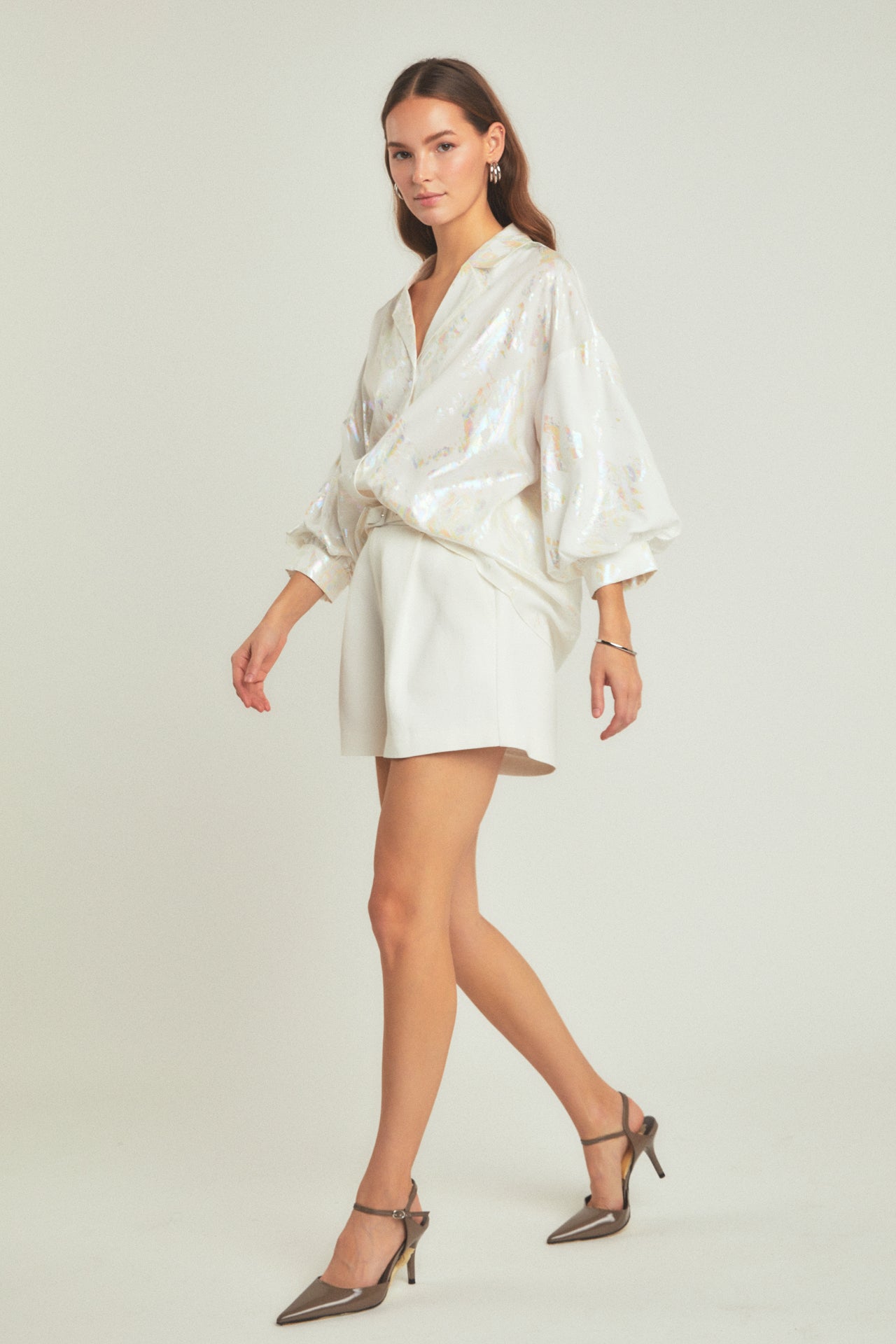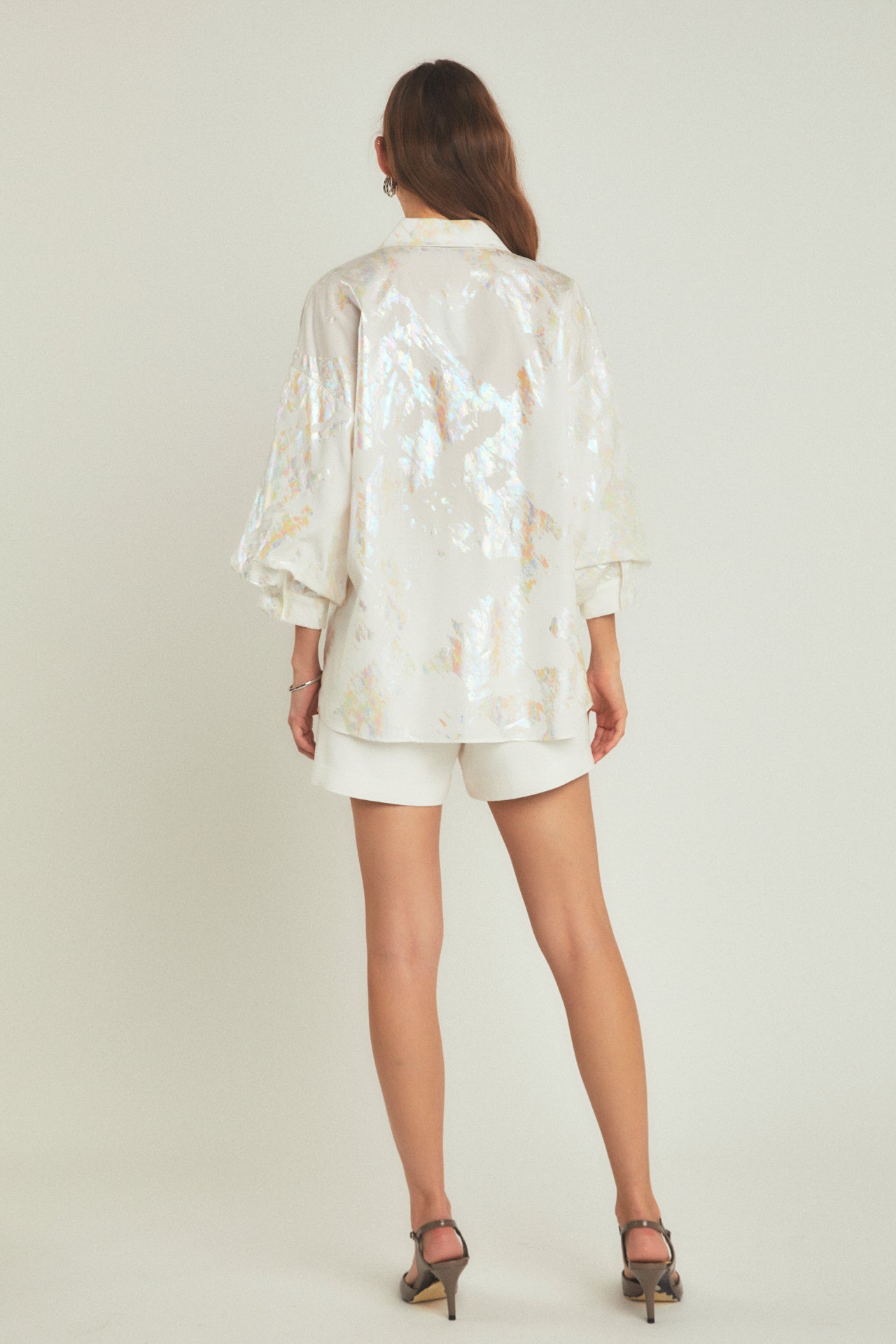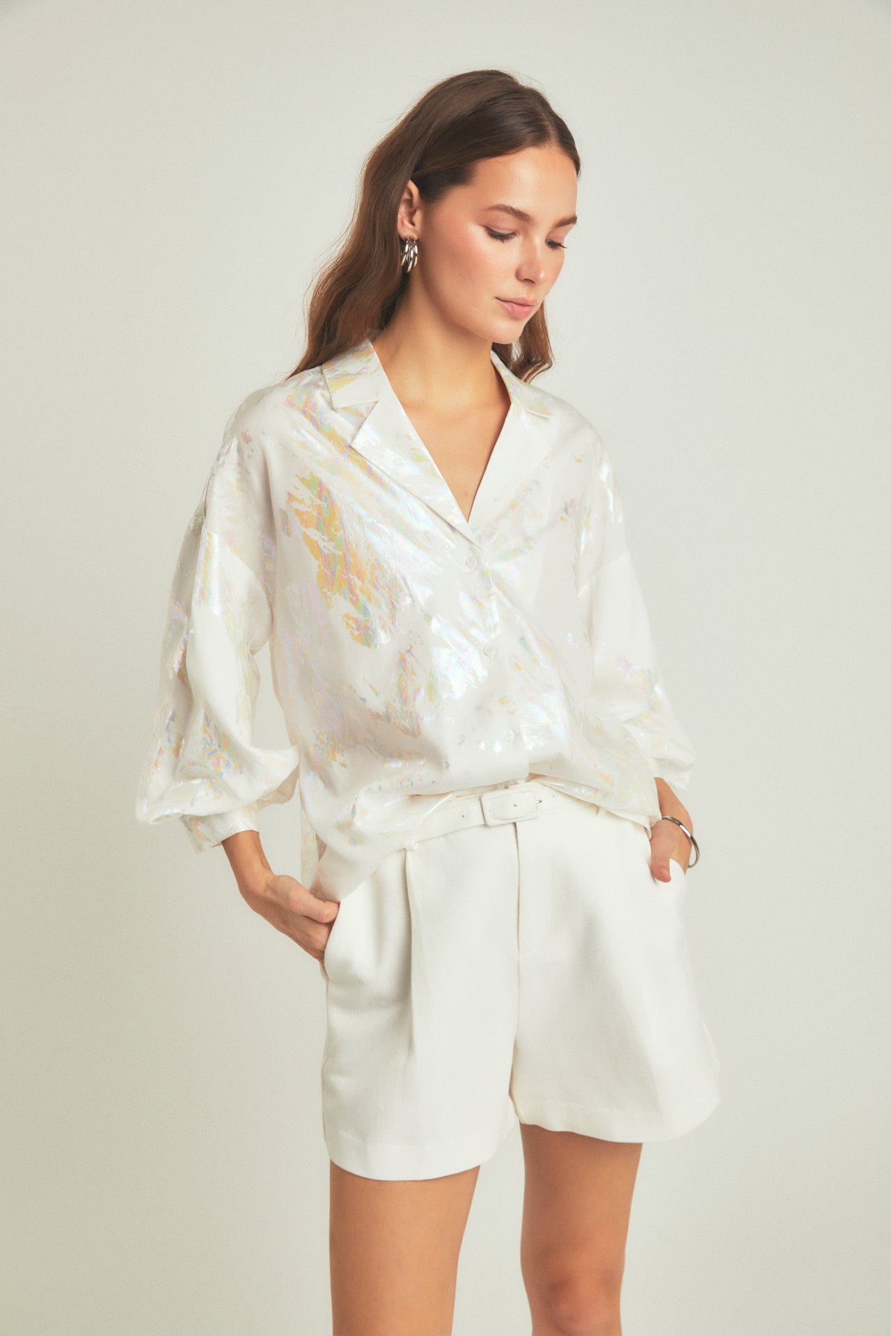 Introducing our must-have Print Foil Collared Shirt perfect for adding a touch of glamour to your wardrobe. The foil print gives off a stunning shine making you stand out from the crowd. With a button-up style and relaxed fit this collared shirt effortlessly combines style and comfort. Designed with a flattering V-neck it's perfect for any occasion - whether it's a casual day out or a night out on the town. Made with high-quality materials this shirt is built to last. Don't miss out on this trendy and versatile piece. Elevate your look with our Print Foil Collared Shirt today.