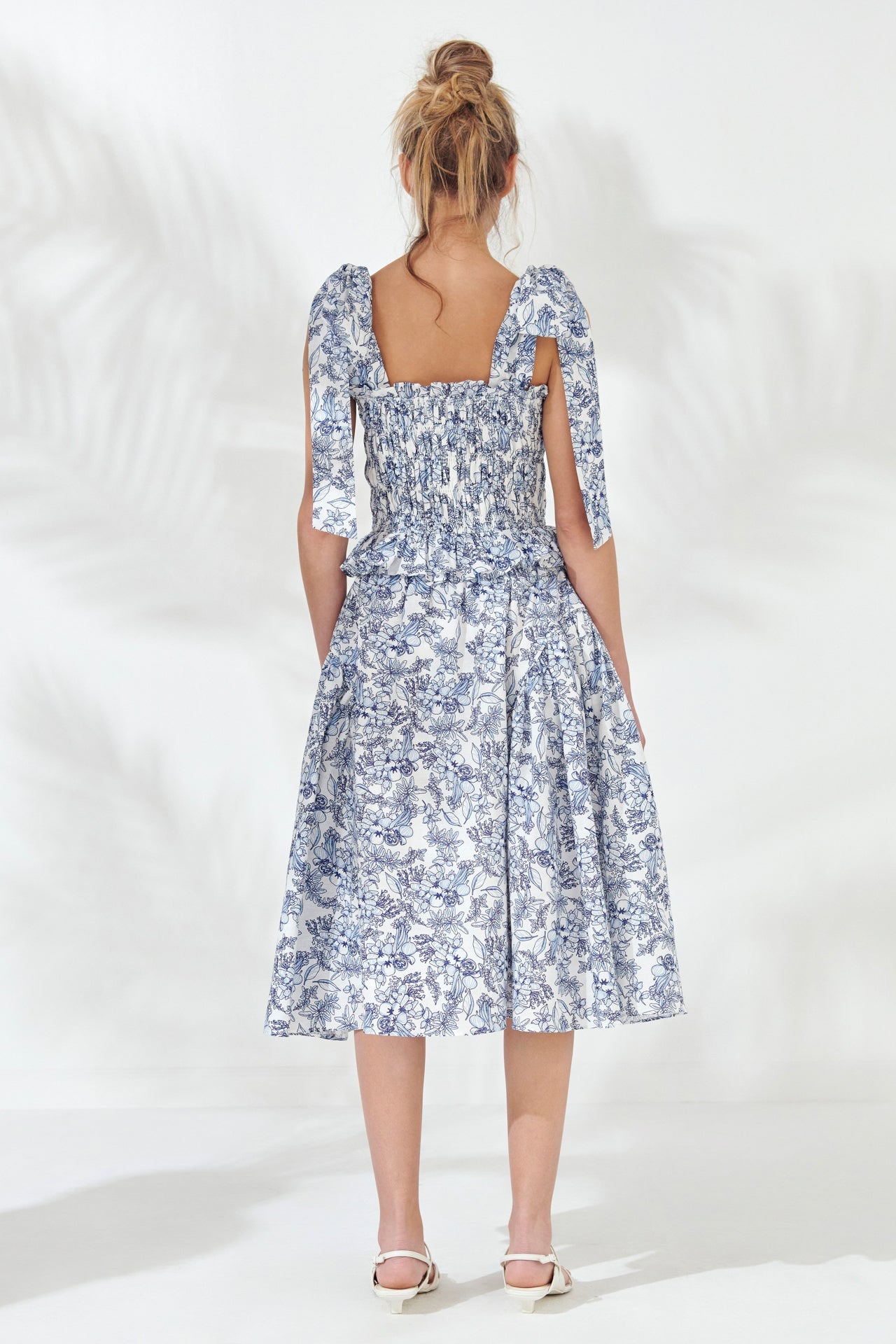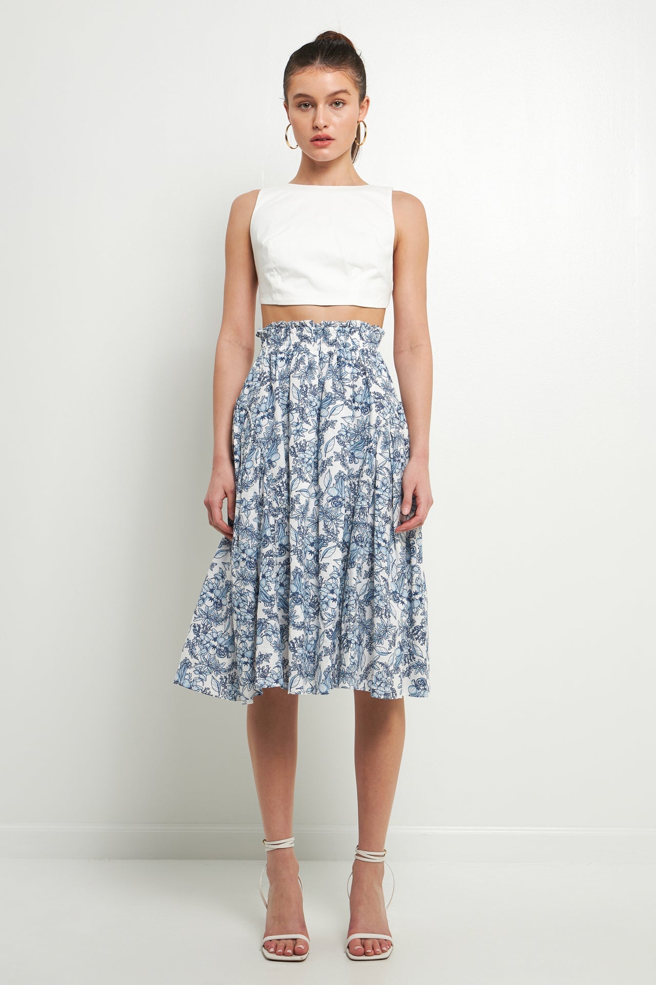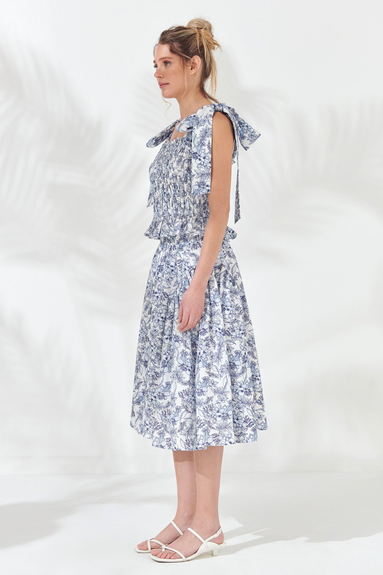 If you're looking for something bright and breezy this print linen midi skirt is perfect. An all-over fruit and veggie print adds a playful twist to the smocked waist of this skirt while the midi length keeps it timelessly elegant. Wear it with a chunky knit and ankle boots for those chilly days or pair it with a strappy sandal and a cropped tee for a summery look.