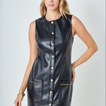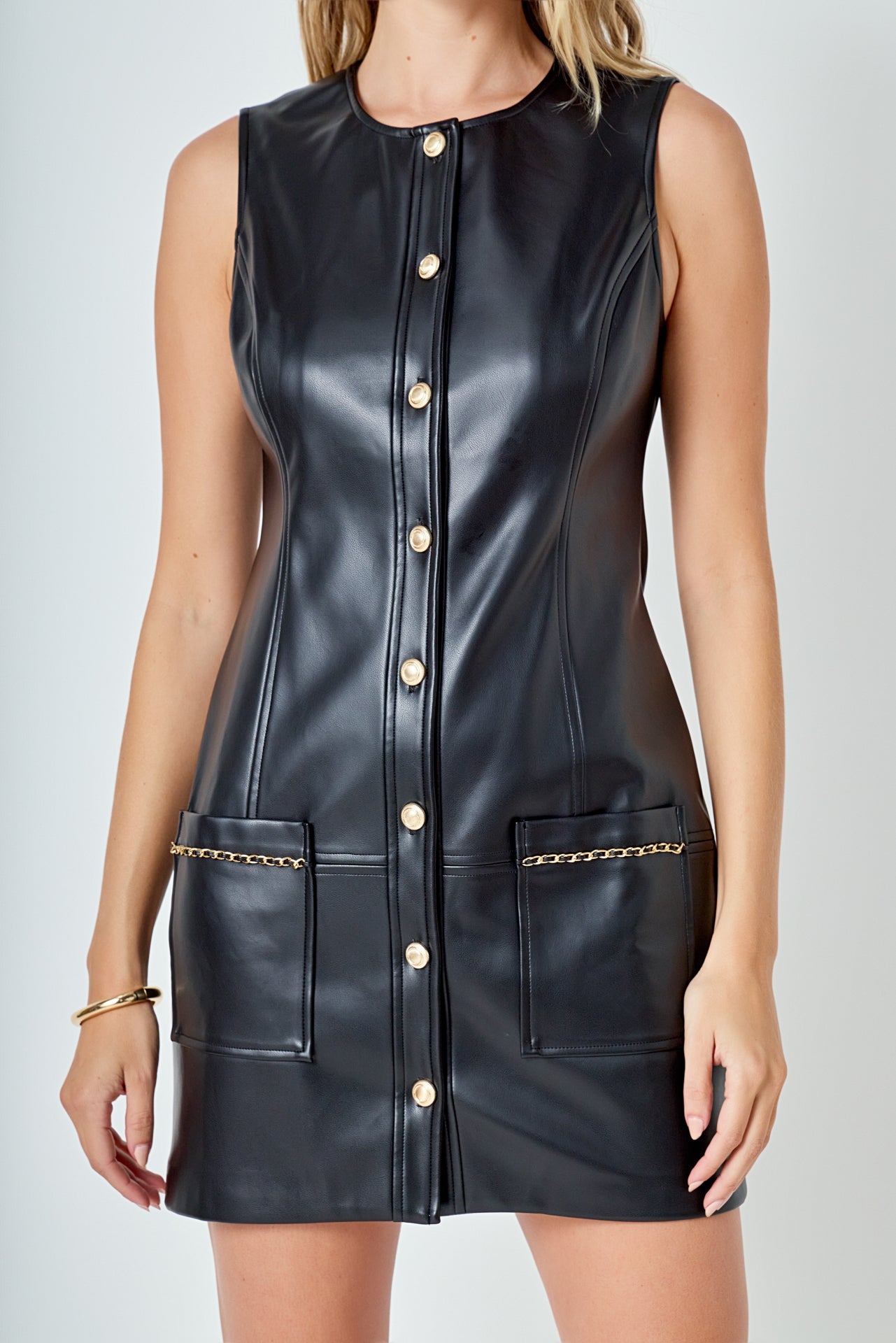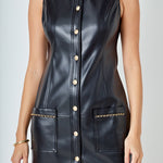 This PU Chain Dress will create an edgy feminine look that catches the eye. Featuring a mini length for a light airy feel and a sleeveless design for comfort and style. The dress closes with a button-up closure for an effortless fit. The PU material is sure to ensure you'll make a statement. An eye-catching addition to your wardrobe. Get ready to turn heads in this chic modern number!