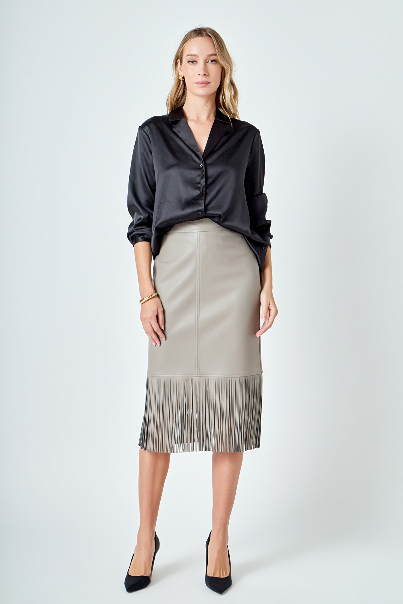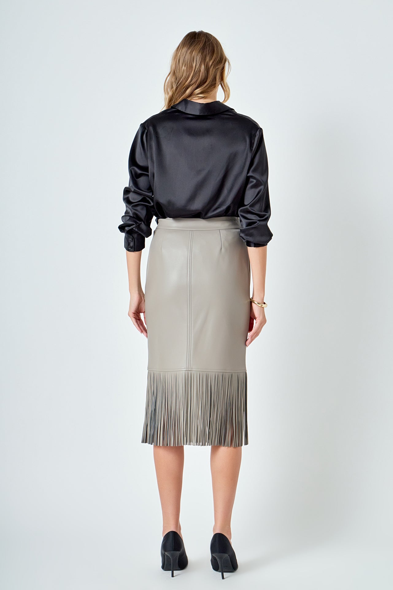 This Pu Fringe Pencil Midi Skirt is the perfect blend of edgy and classic. Made of luxurious Pu fabric, this skirt will look great for dressy or casual occasions. The midi length gives great coverage while the pencil skirt style and waistband flatter your curves. The fringe detailing is a statement shine to this skirt making it truly unique. Get the look and feel that is both fashion-forward and timeless!
