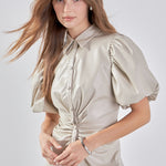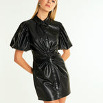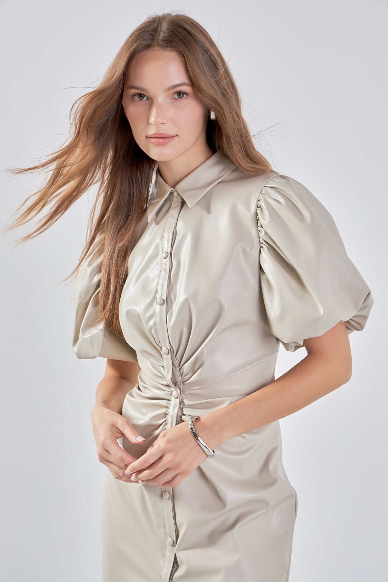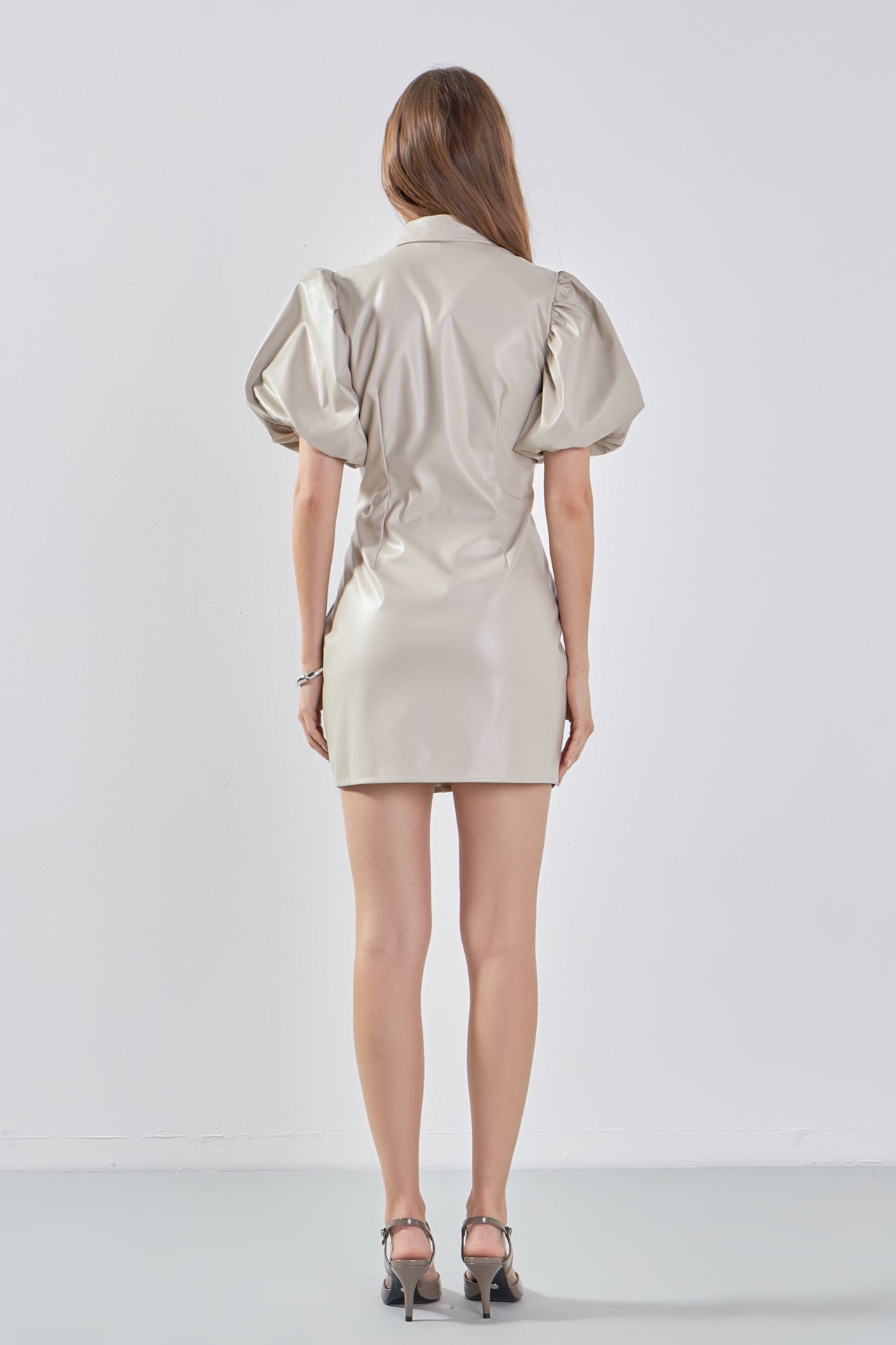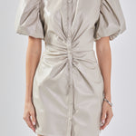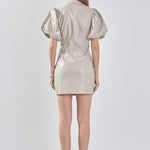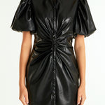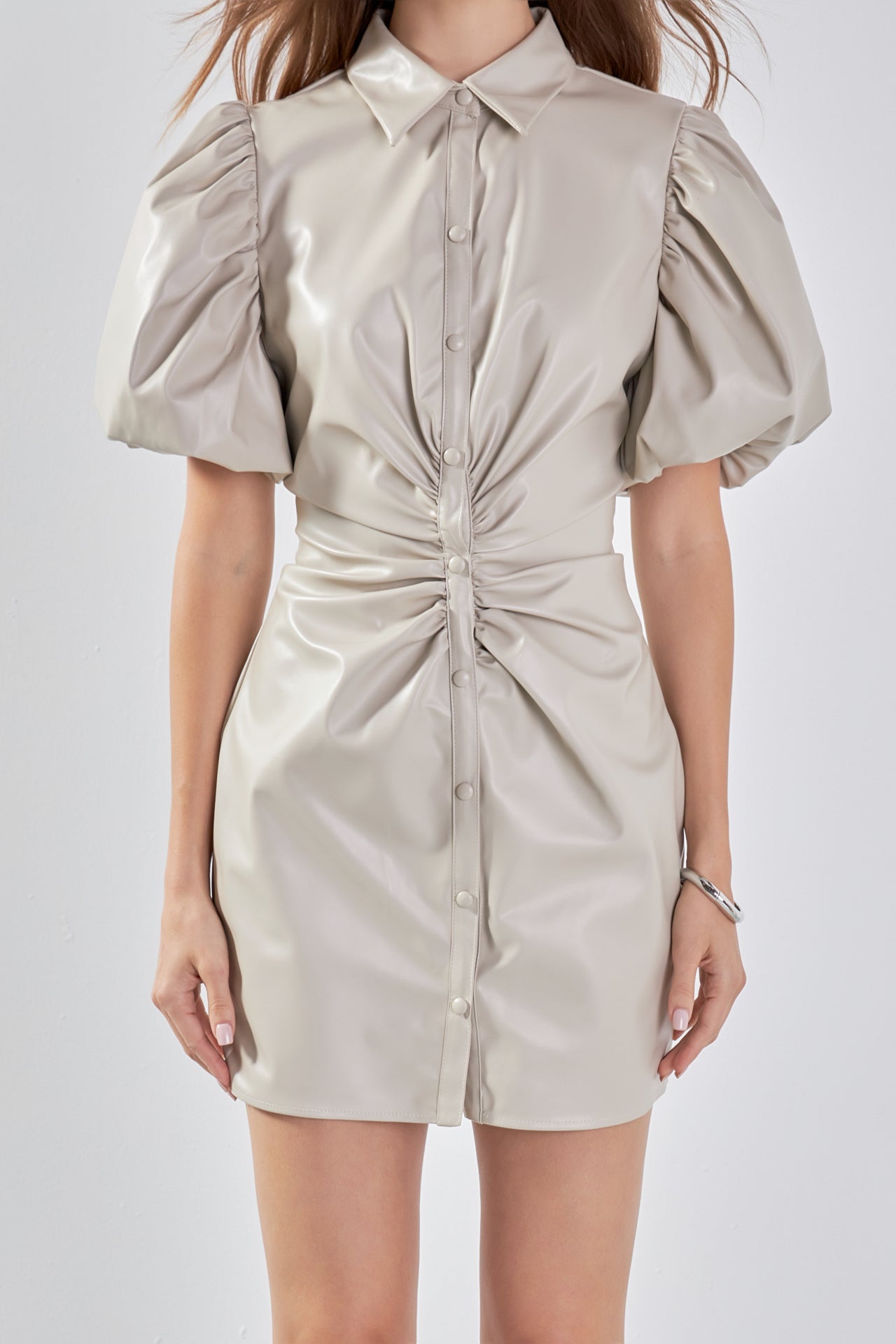 Strut your stuff in this sexy mini dress. This little number features a ruched waist detail and puff sleeves for a touch of femininity. The covered snap button closure keeps things classy and ensures that you'll stay comfortable all night long. Whether you're hitting the town or going out on a romantic date, this dress is sure to turn heads.