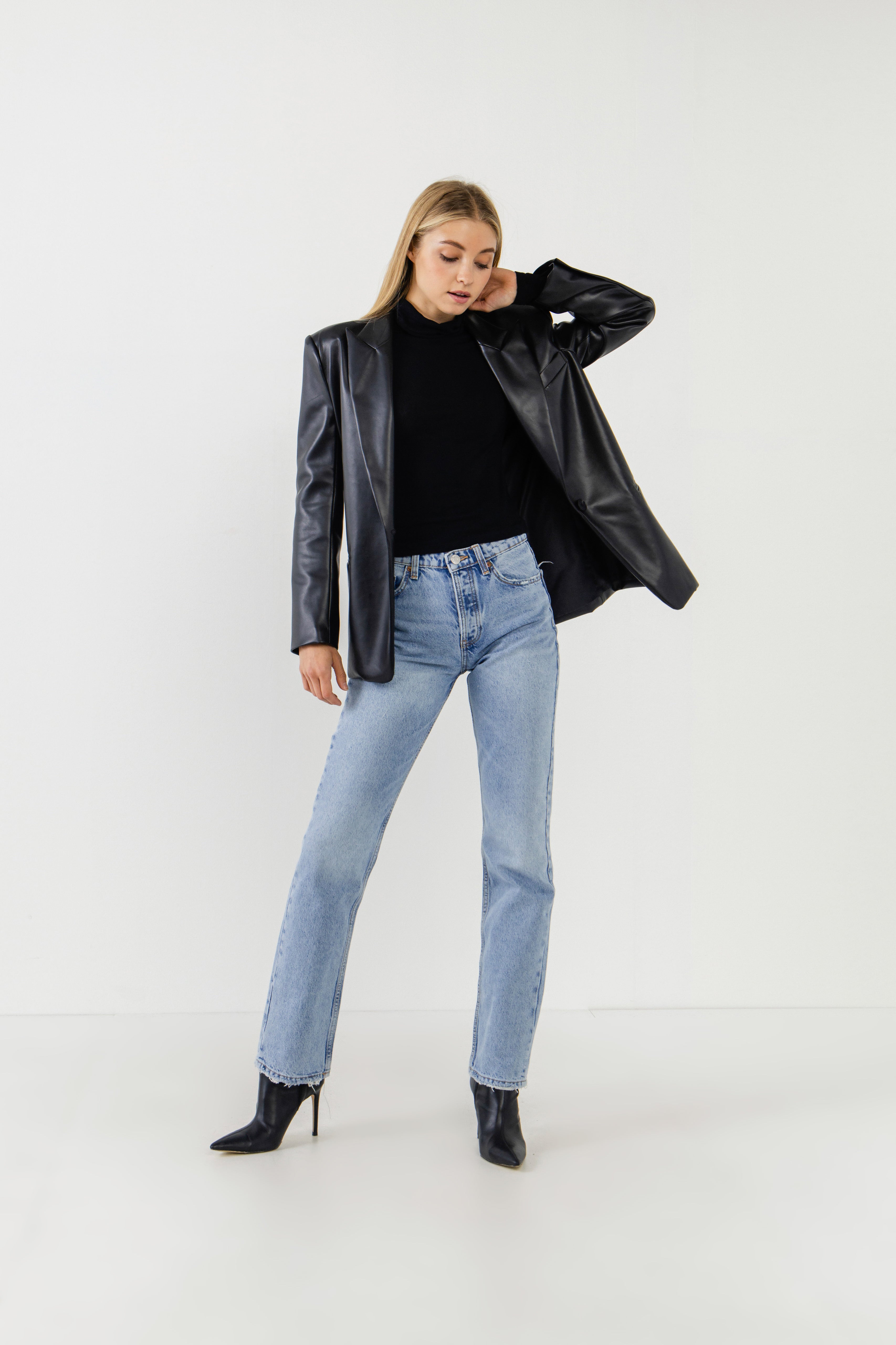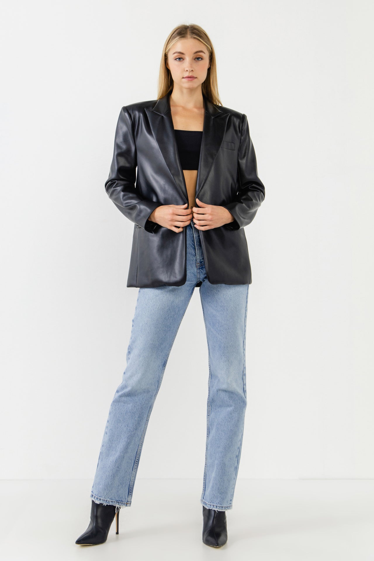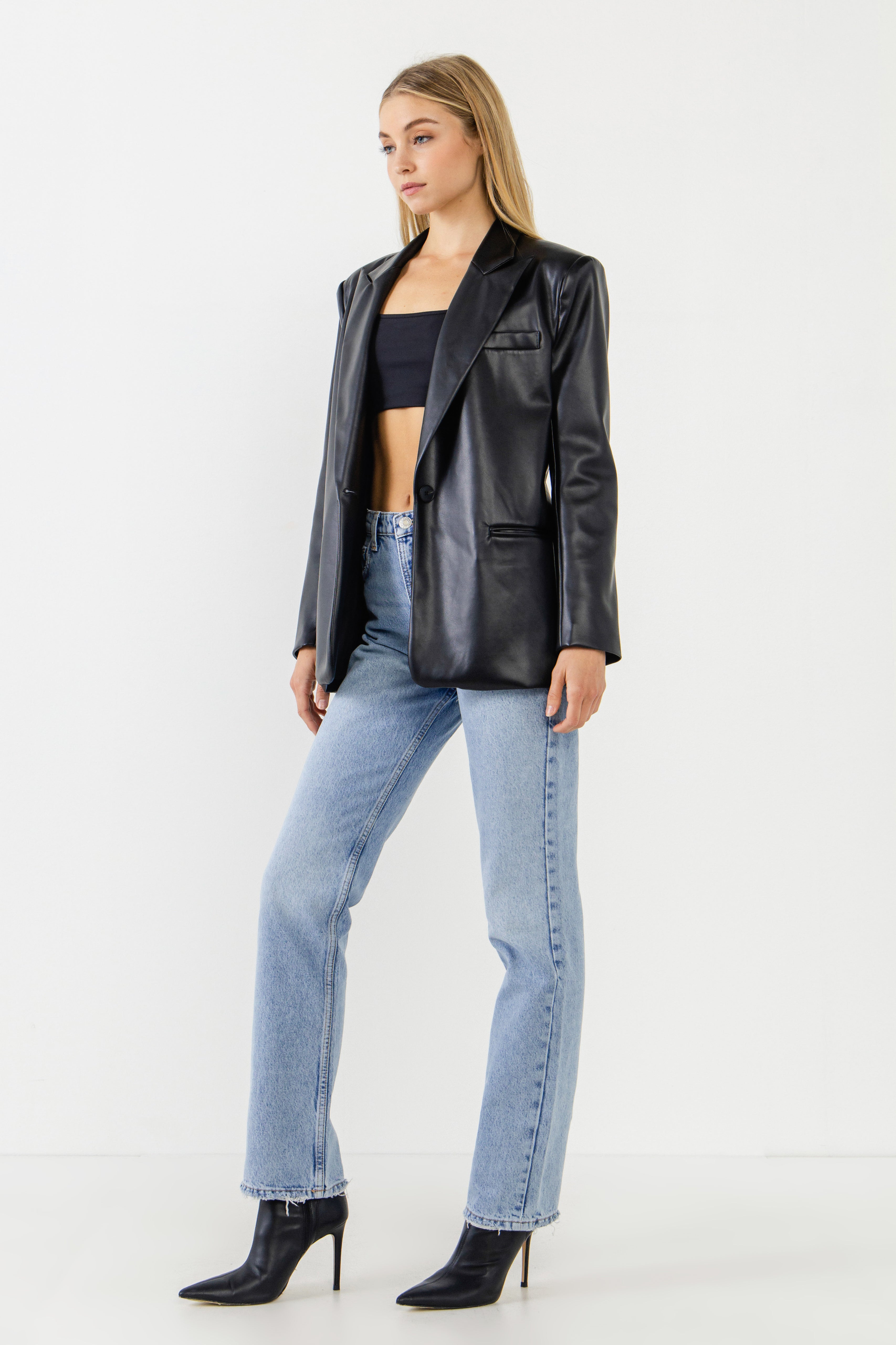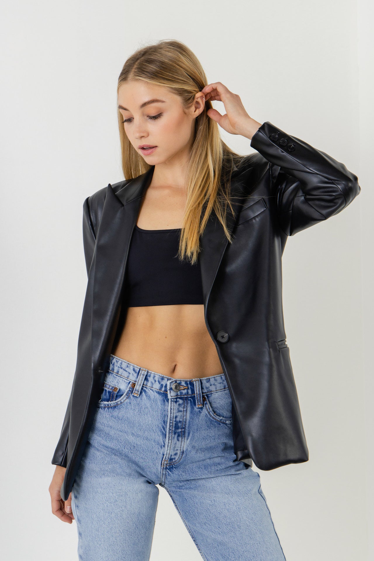 Stay polished with this sophisticated blazer. It's the perfect piece to take your look up a notch. Made with a pu fabric, this blazer has a luxurious feel and an oversized fit that will make you feel comfortable all day long. With its sleek silhouette and handy pocket, this blazer is ideal for any occasion.