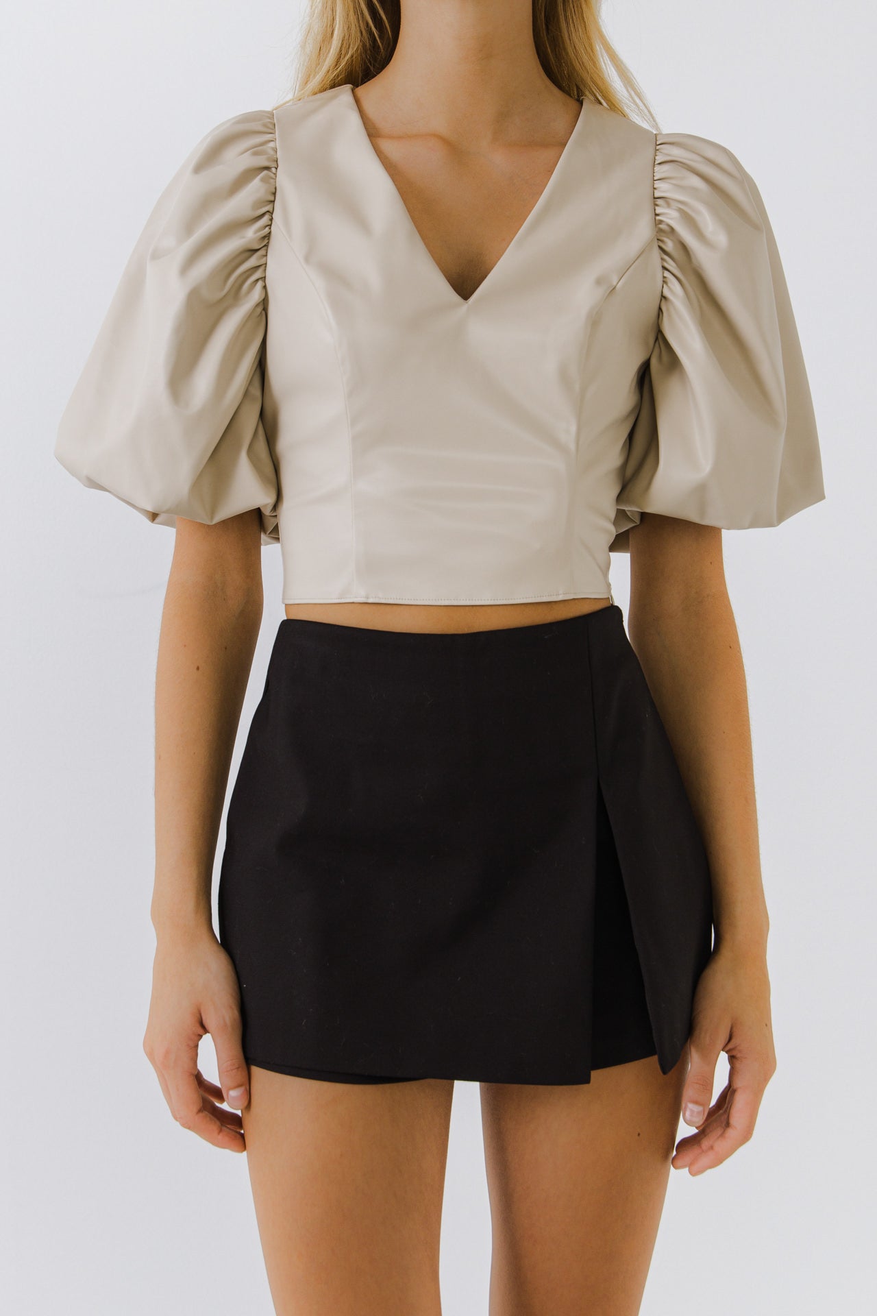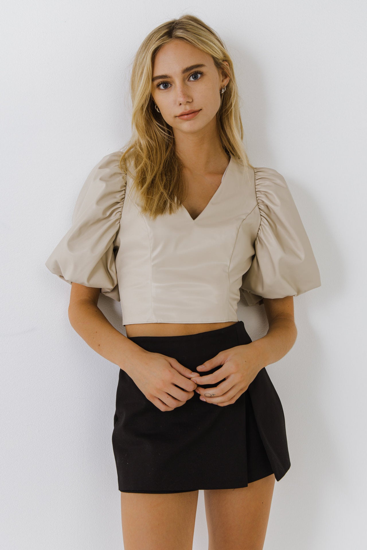 This Pu Puff Sleeve Top is the perfect addition to your wardrobe. Featuring a stretch PU fabric, this top has a V-neckline and invisible zipper for a secure fit. The intricate puff sleeves add a stylish touch to the look. It's the perfect top to show off your style. Get yours today and take your look to the next level.